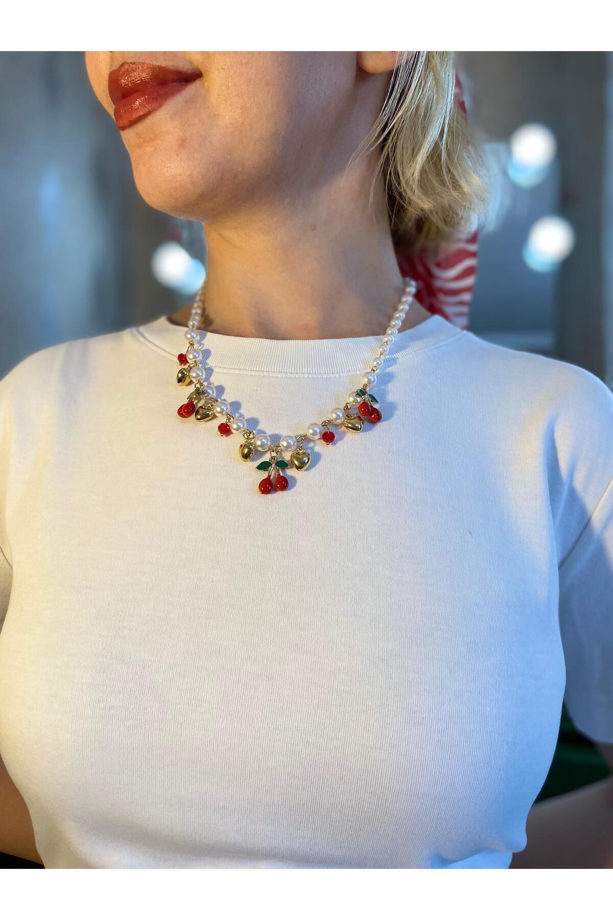 Vintage İncili Kiraz ve Kalp Charmlı Kolye Vintage İncili Kiraz ve Kalp Charmlı Kolye MRD00611 تک سایز
