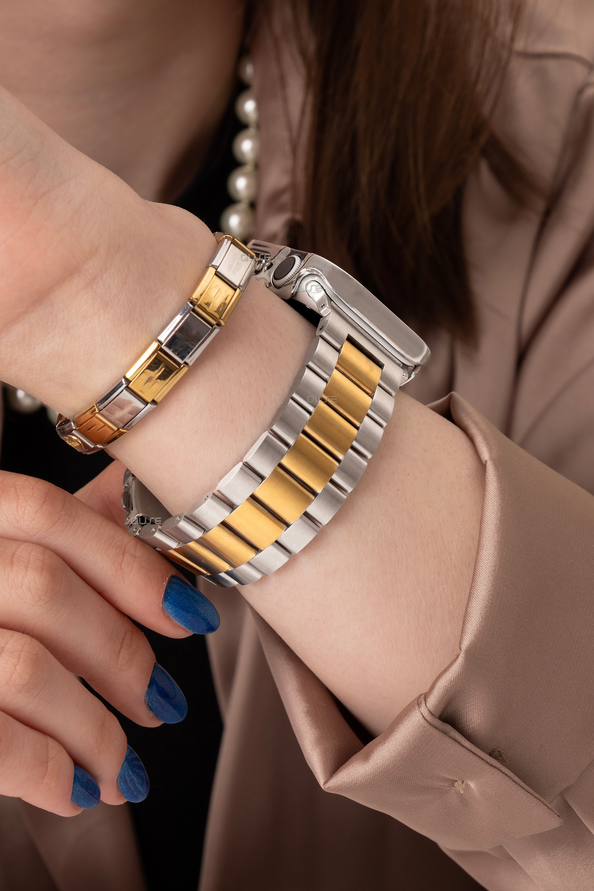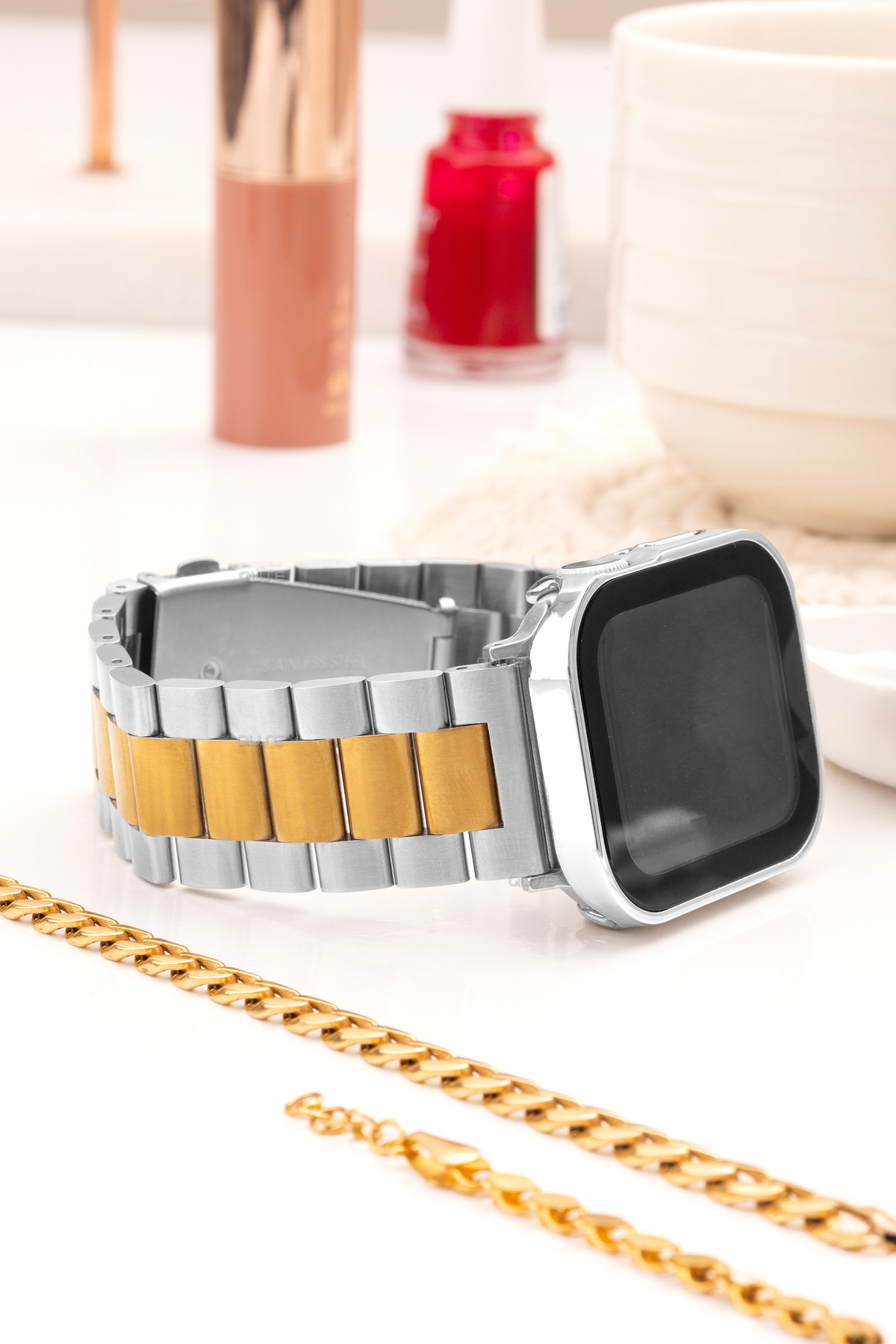 Paslanmaz Çelik Metal Kordon, Apple Watch SE/10/9/8/7/6/5/3 ile Uyumlu, 38/40/41/42mm, Gümüş/Altın Paslanmaz Çelik Metal Kordon, Apple Watch SE/10/9/8/7/6/5/3 ile Uyumlu, 38/40/41/42mm, Gümüş/Altın QUSE3B41 تک سایز