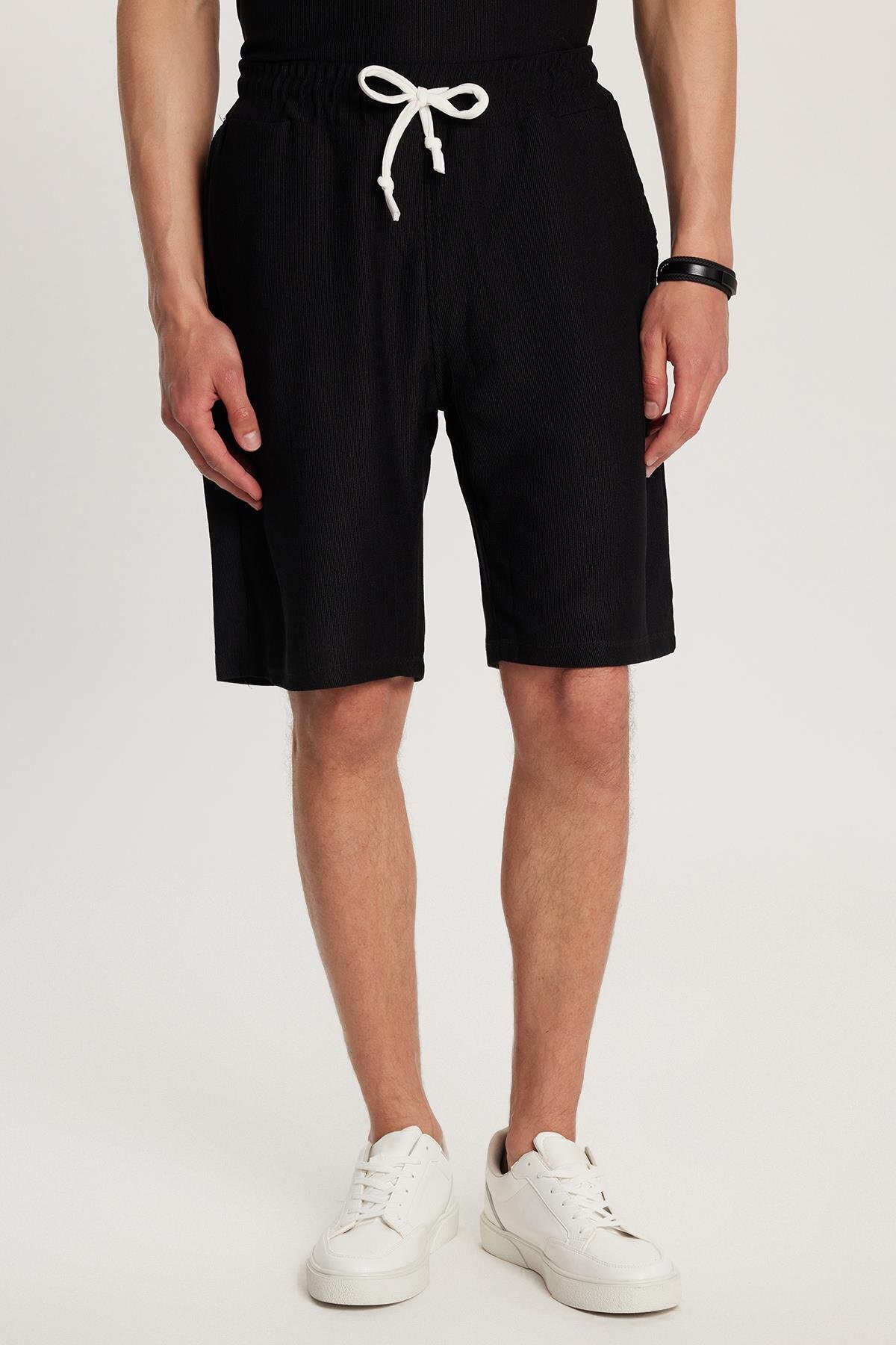 Erkek Standart Fit Pamuklu Jakarlı Baskılı Bisiklet Yaka Beli Bağcıklı Siyah Şort Takım Erkek Standart Fit Pamuklu Jakarlı Baskılı Bisiklet Yaka Beli Bağcıklı Siyah Şort Takım AUT25014 2XL