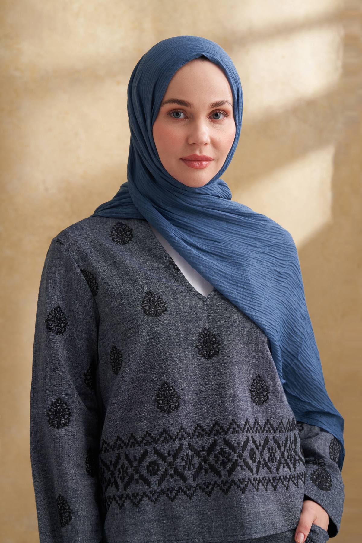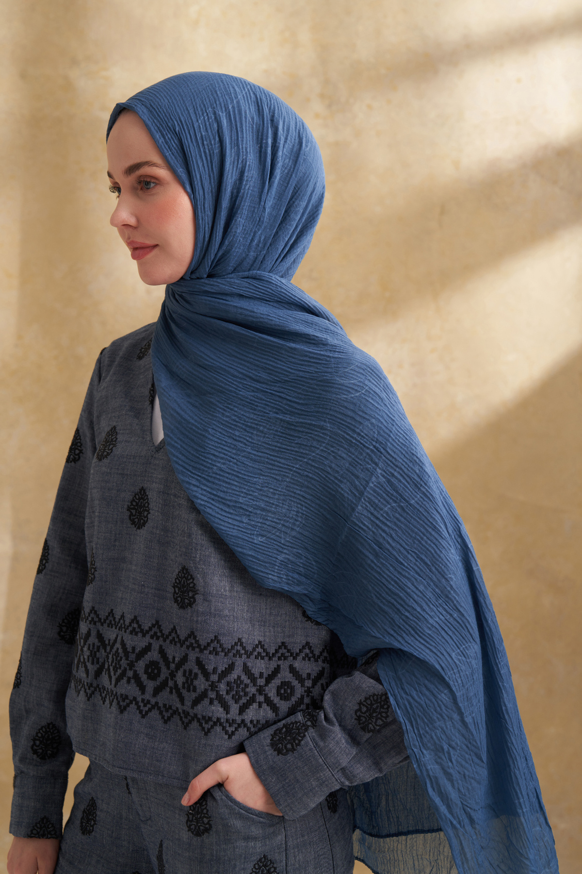 ŞÜHEDA'NIN TERCİHİ MÜSLİN YAPRAK DESEN ŞAL - İNDİGO ŞÜHEDA'NIN TERCİHİ MÜSLİN YAPRAK DESEN ŞAL - İNDİGO 3351 90 x 200