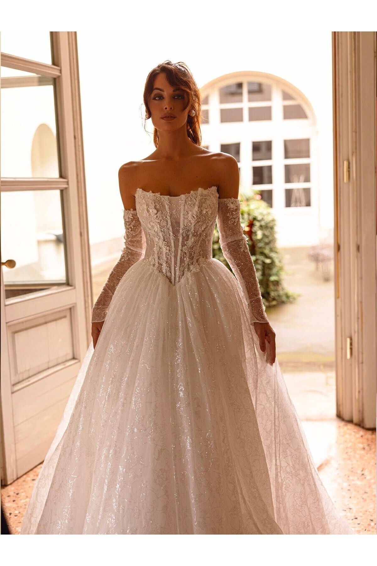 Havuz Yaka Straplez Korsajlı Dantel ve Simli Prenses Gelinlik Havuz Yaka Straplez Korsajlı Dantel ve Simli Prenses Gelinlik ZME01 42