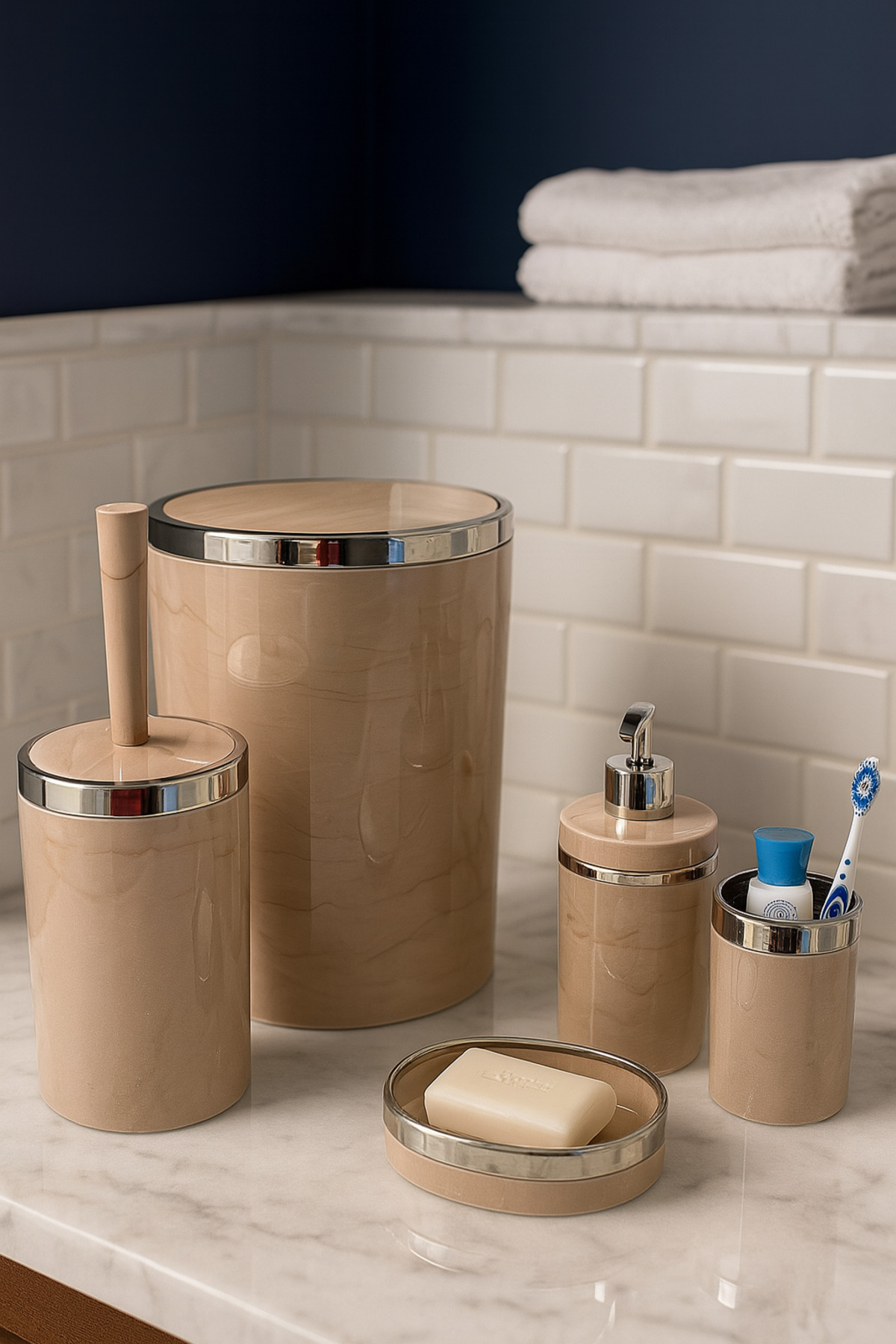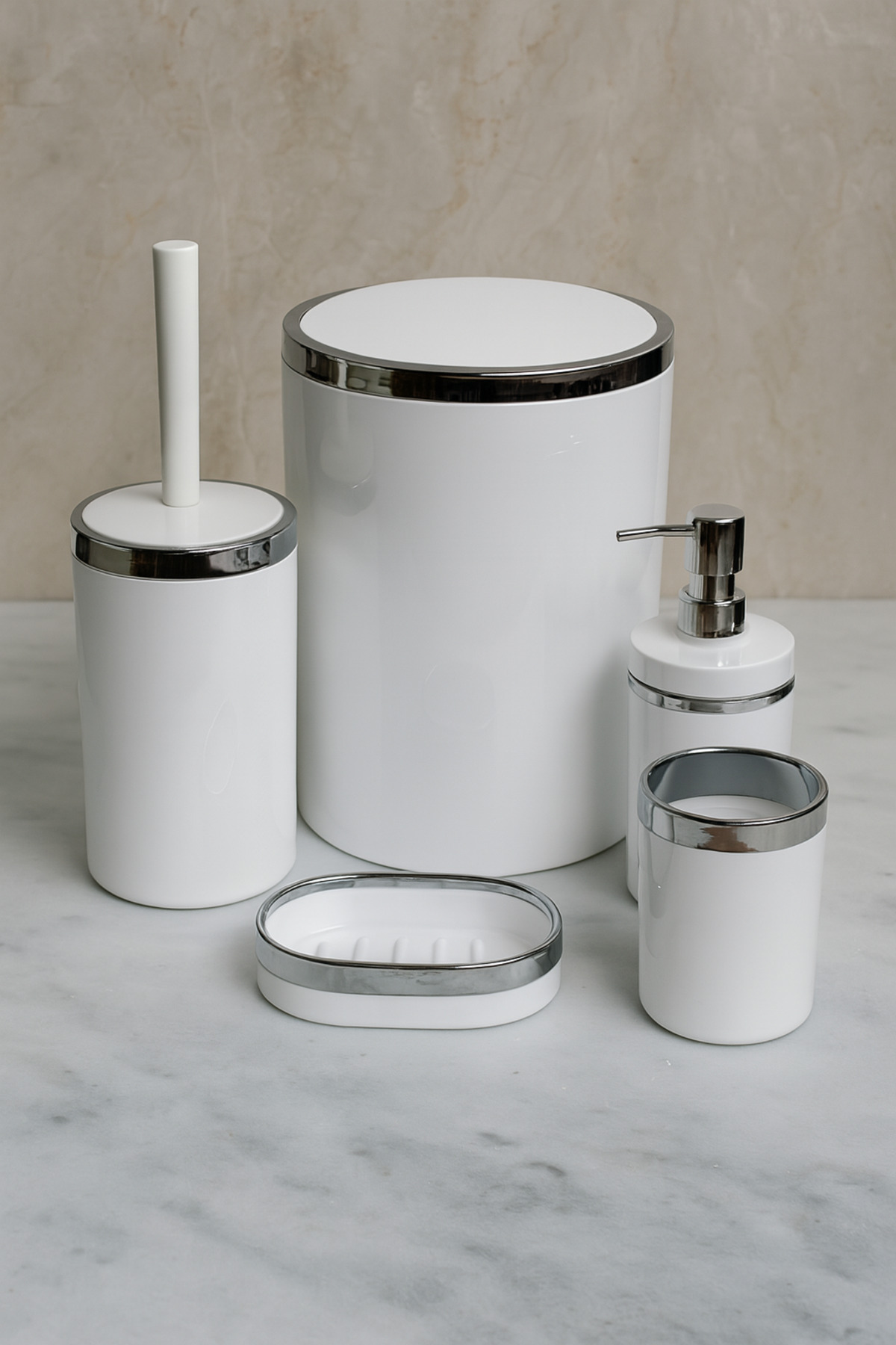 5 Parça Akrilik Banyo Seti, Şık ve Kaliteli Akrilik, Gümüş Renk Detaylı, Beyaz 5 Parça Akrilik Banyo Seti, Şık ve Kaliteli Akrilik, Gümüş Renk Detaylı, Beyaz MKR-232 تک سایز