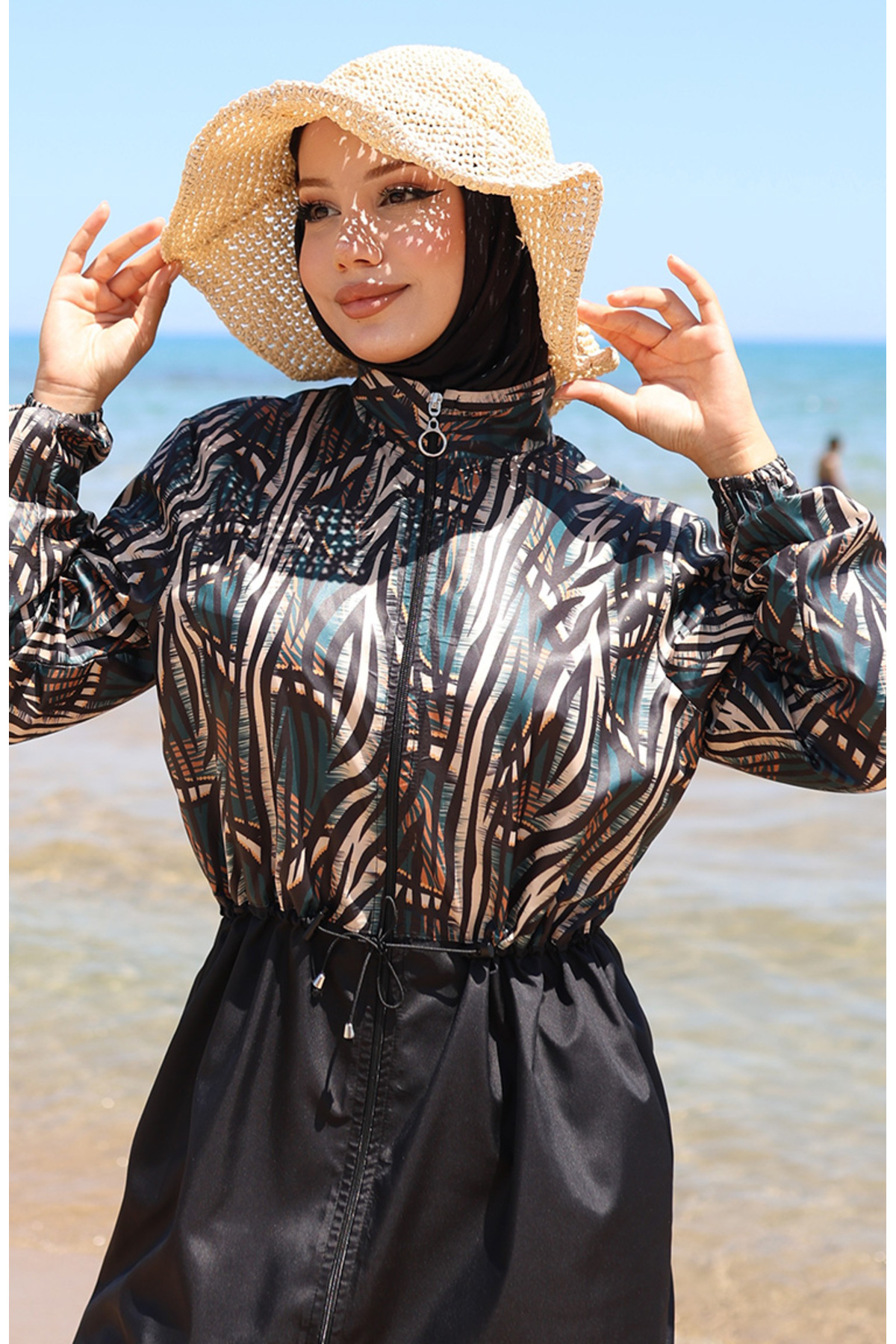 Beli Lastikli Sahra Desenli Fermuarlı Tesettür Mayo Bone Hediyeli 9005E-01 Siyah Yeşil Beli Lastikli Sahra Desenli Fermuarlı Tesettür Mayo Bone Hediyeli 9005E-01 Siyah Yeşil DLC9005E 42-44