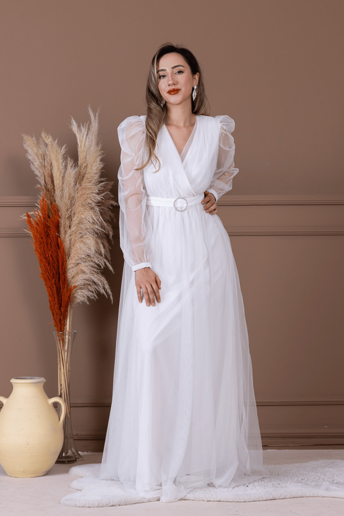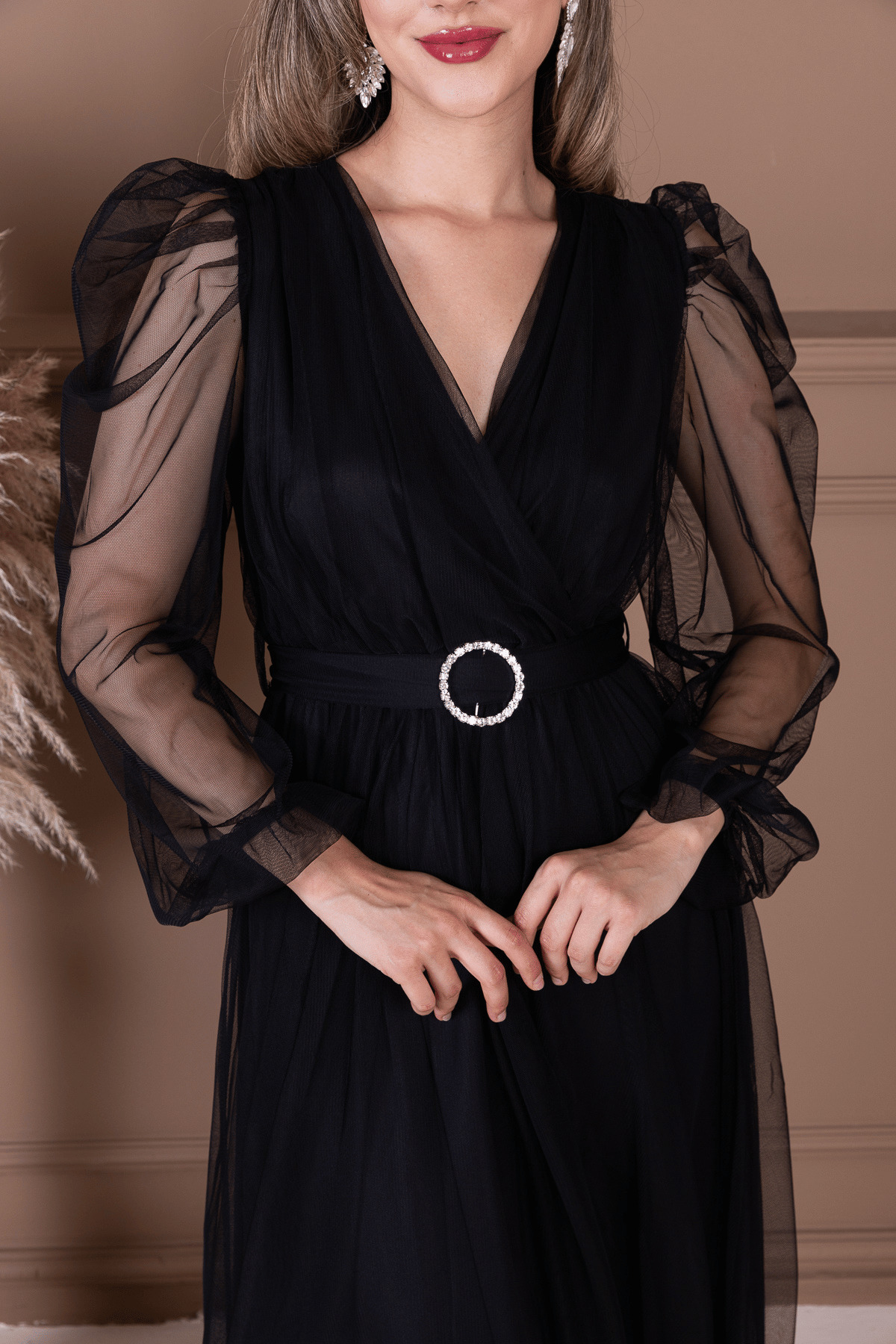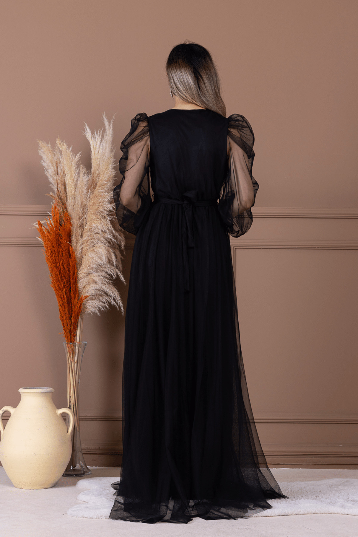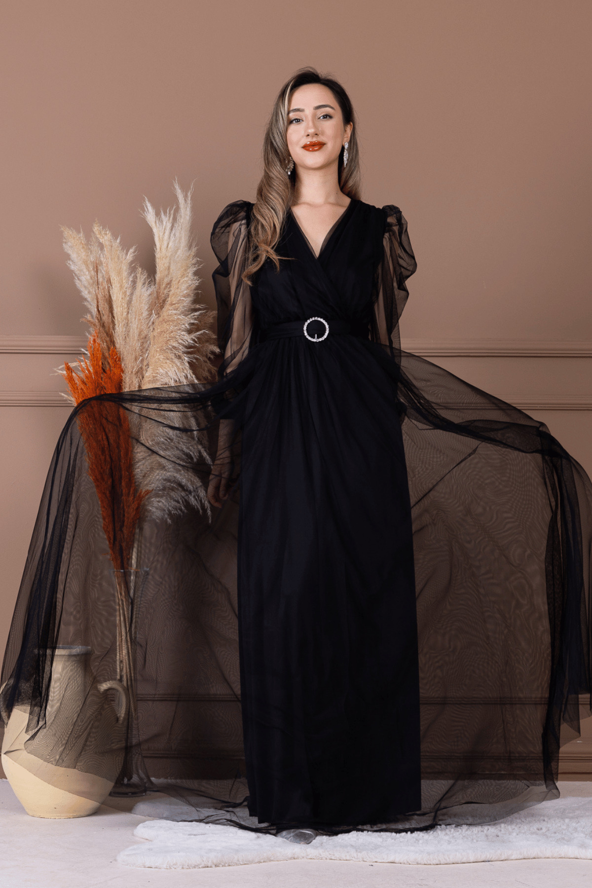 Tül Kumaş Kruvaze Yaka Maxi Elbise - SİYAH Tül Kumaş Kruvaze Yaka Maxi Elbise - SİYAH BB-GYM-2462 46