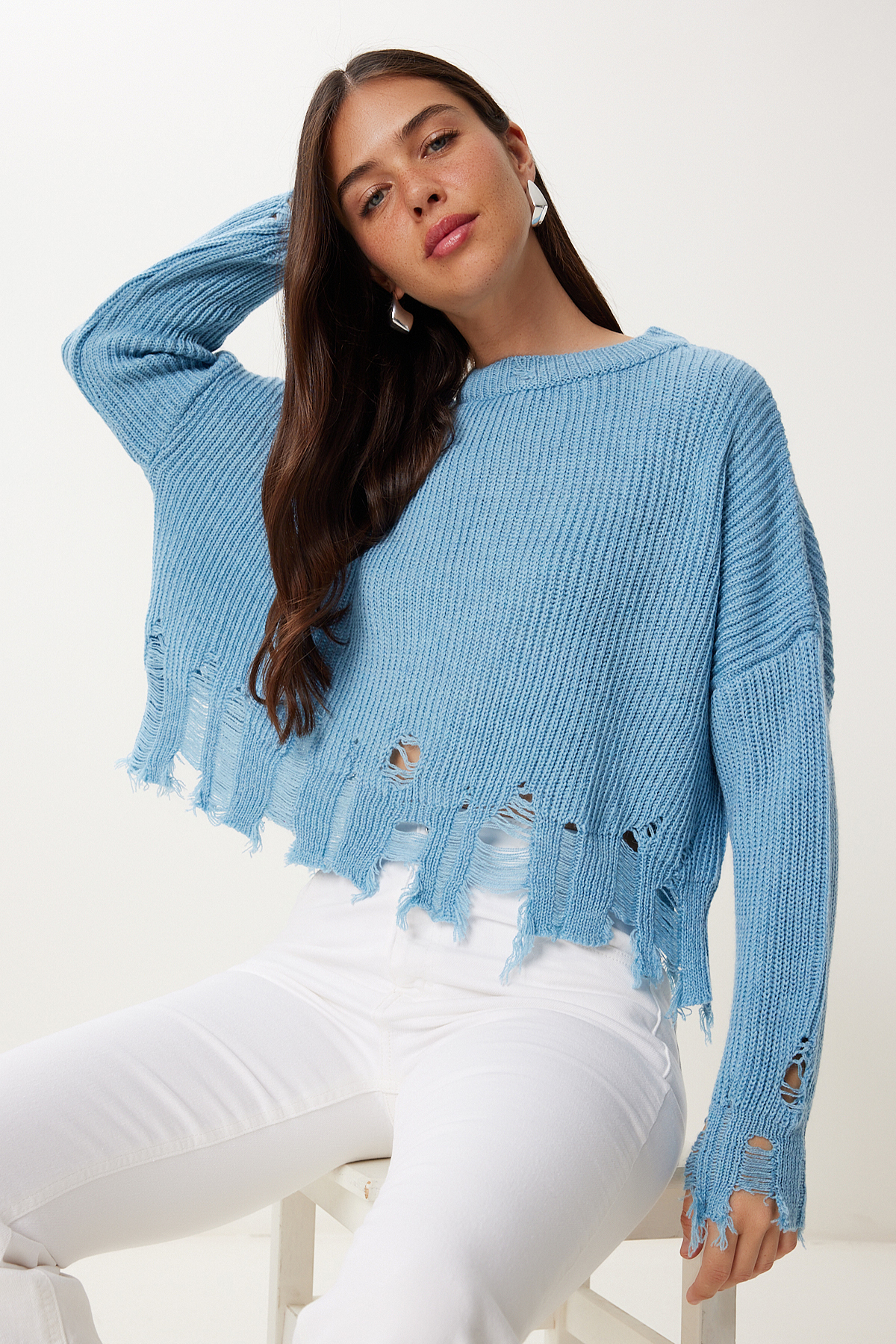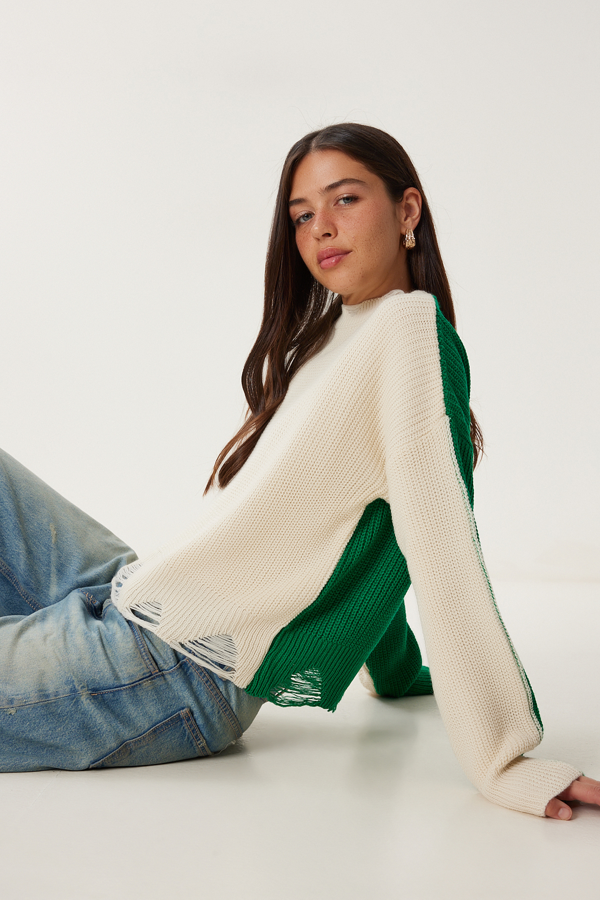Kadın Krem Siyah Kontrast Renkli Yırtık Detaylı Triko Kazak Kİ00135 Kadın Krem Siyah Kontrast Renkli Yırtık Detaylı Triko Kazak Kİ00135 تک سایز