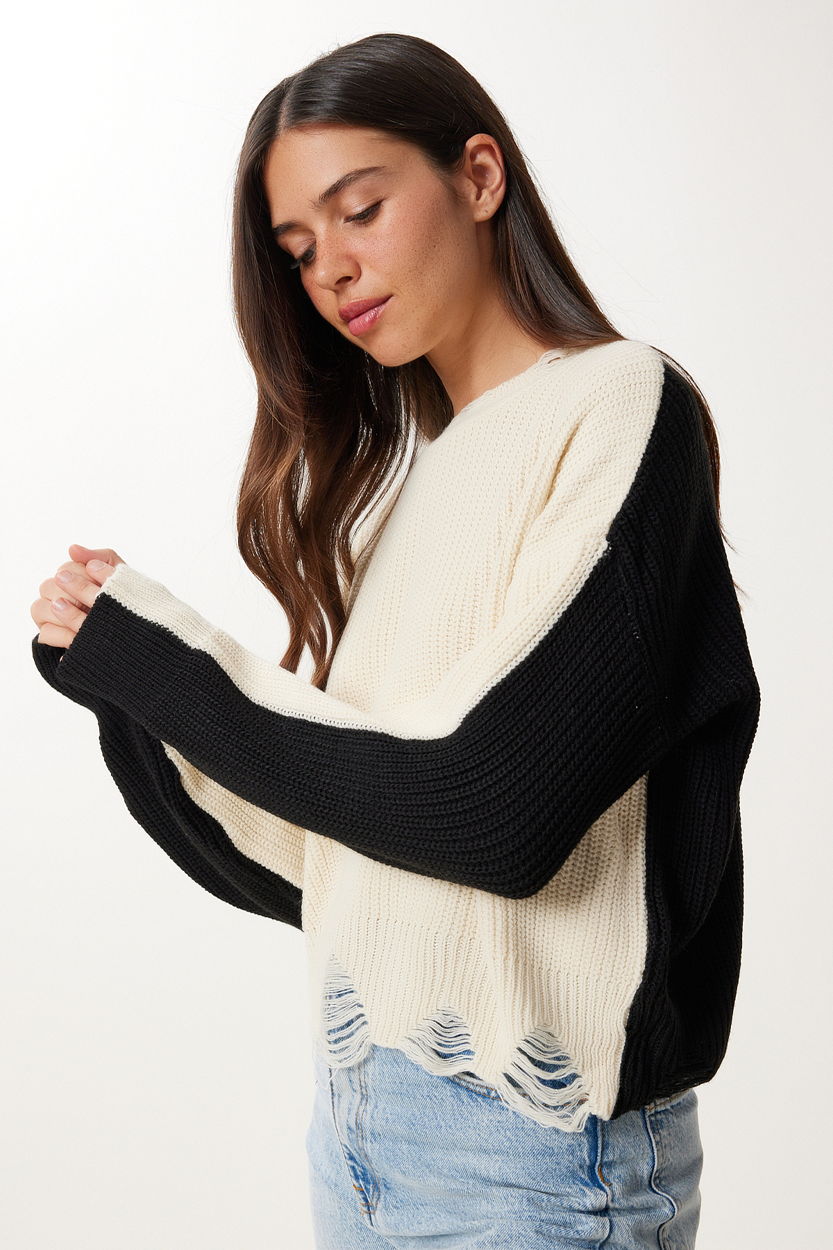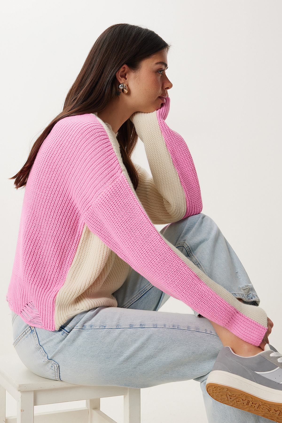 Kadın Gri Kontrast Renkli Uzun Triko Kazak YG00106 Kadın Gri Kontrast Renkli Uzun Triko Kazak YG00106 تک سایز