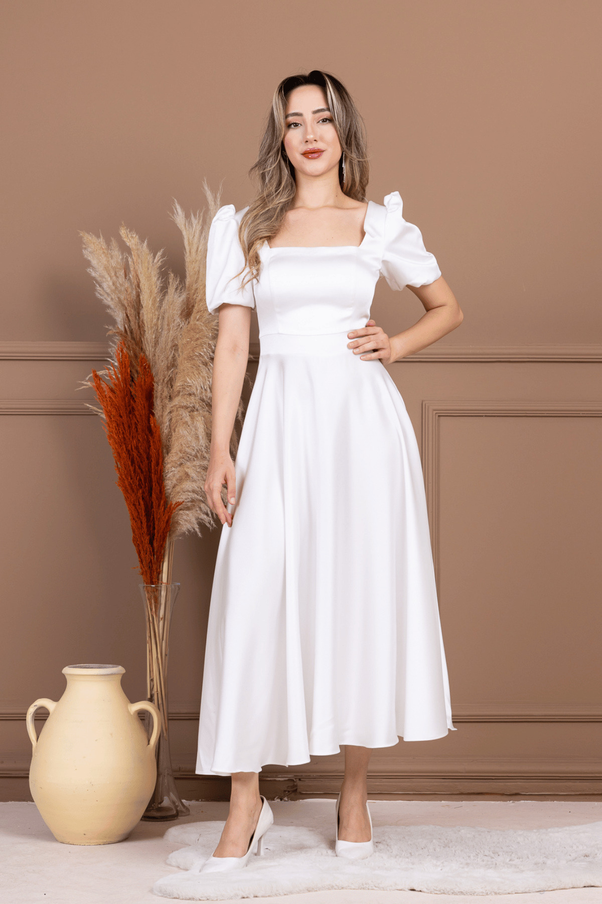 Saten Kumaş Kare Yaka Balon Kol Midi Elbise - LİLA Saten Kumaş Kare Yaka Balon Kol Midi Elbise - LİLA BB-GYM-2080 46