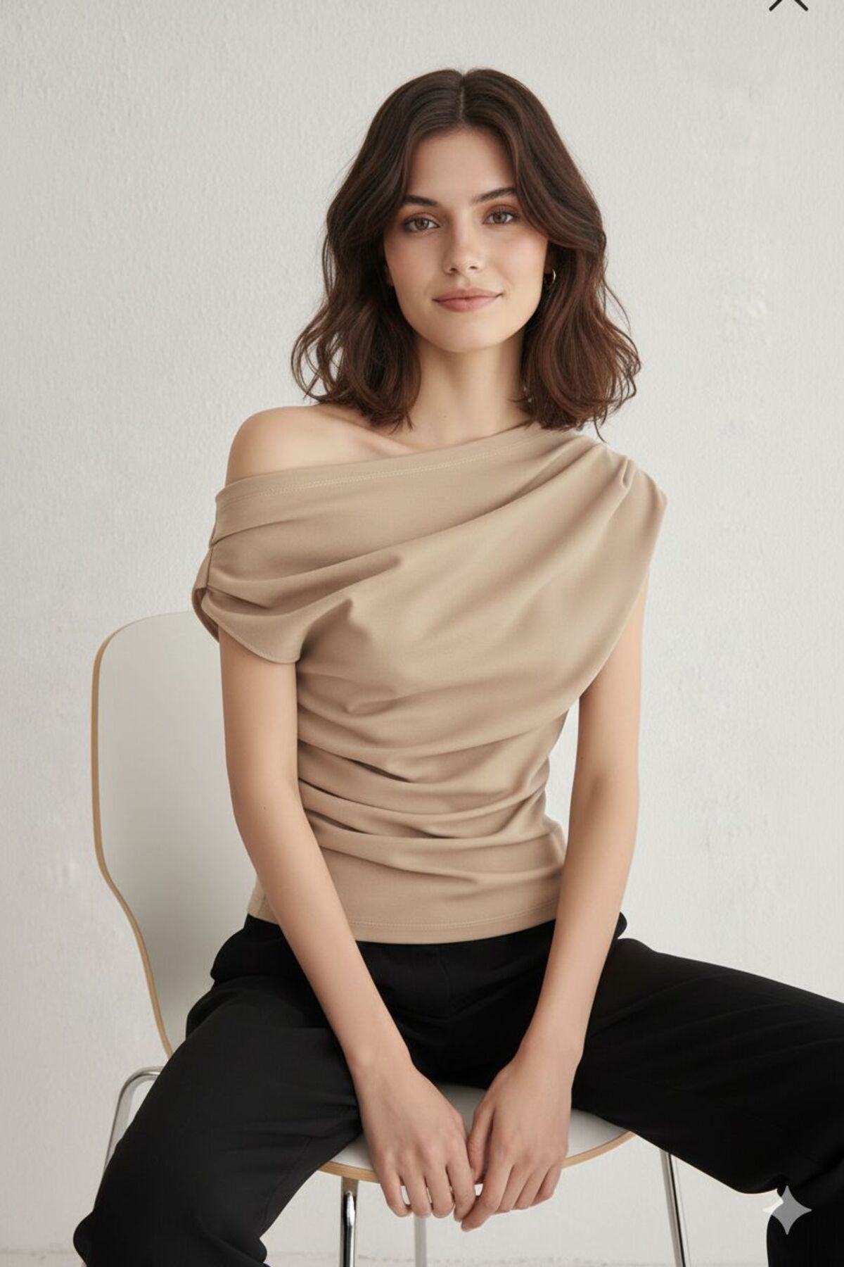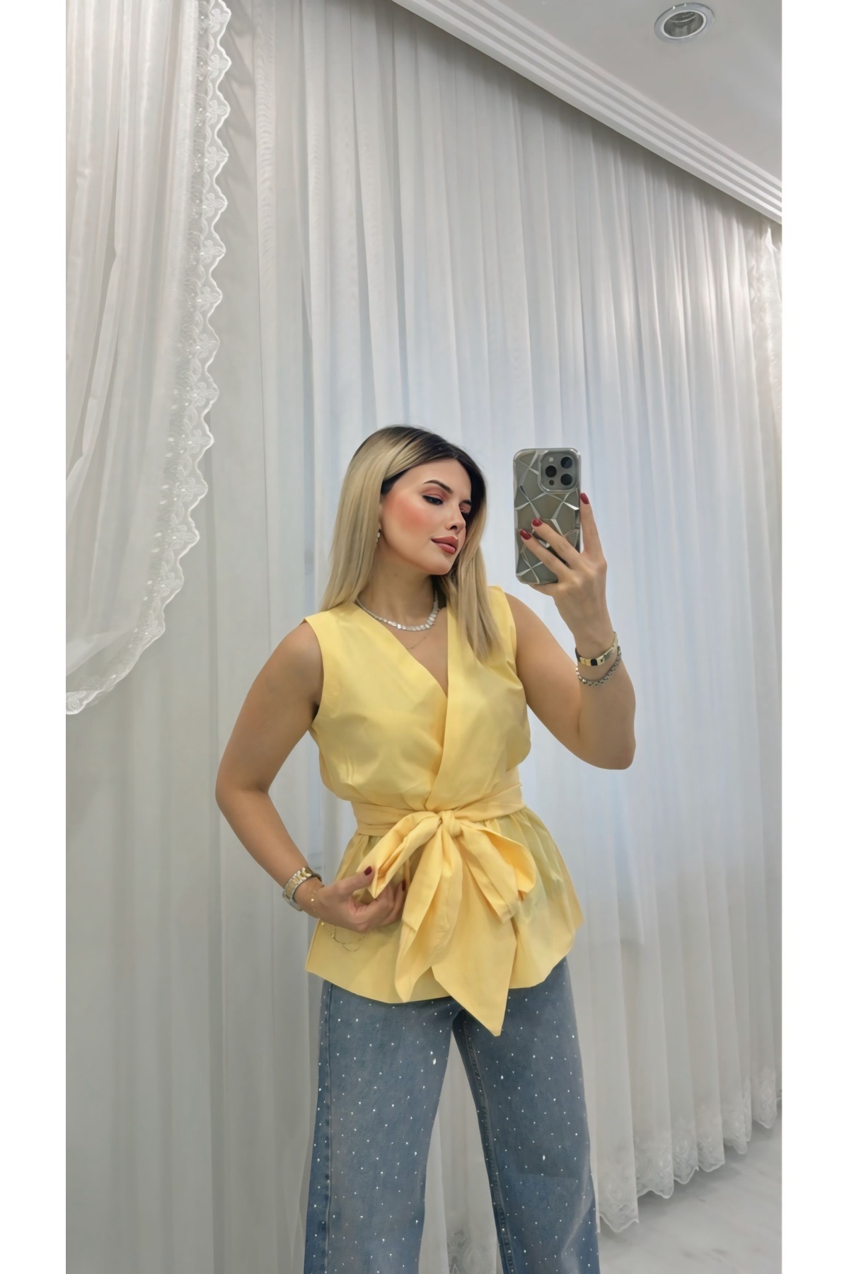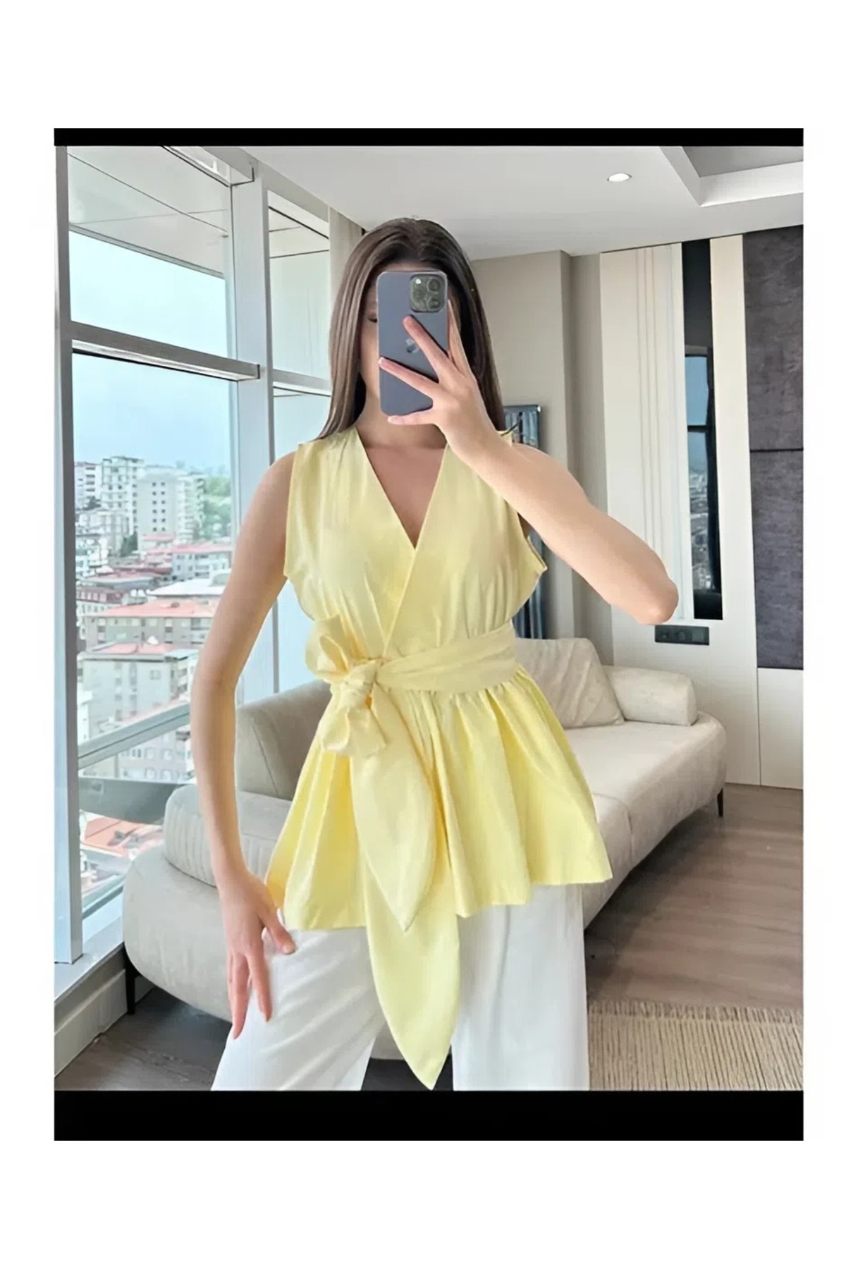 V Yaka Kuşaklı Fırfırlı Trend Tericotton Kumaş Bluz V Yaka Kuşaklı Fırfırlı Trend Tericotton Kumaş Bluz 457545777444SOLNE L