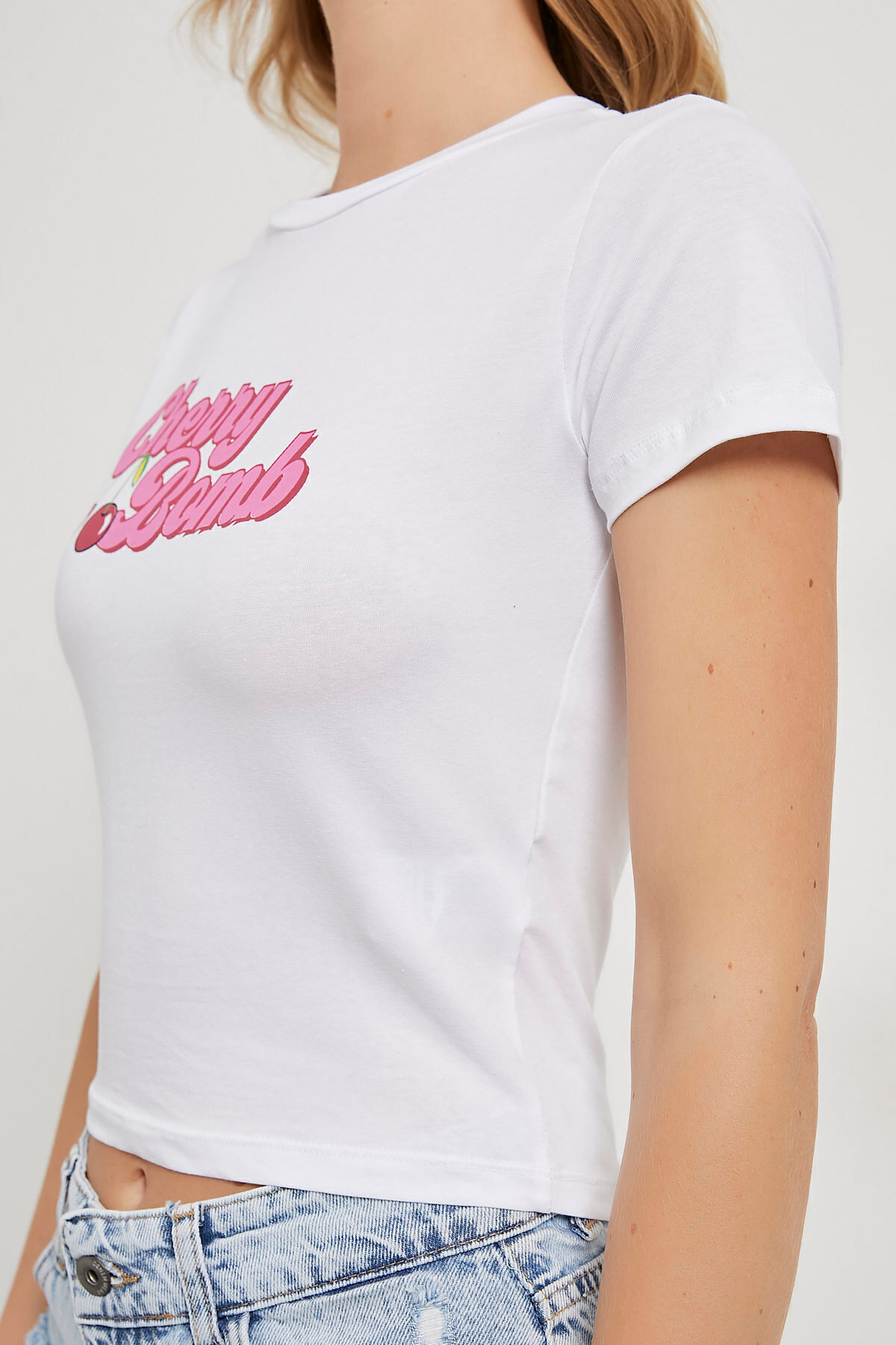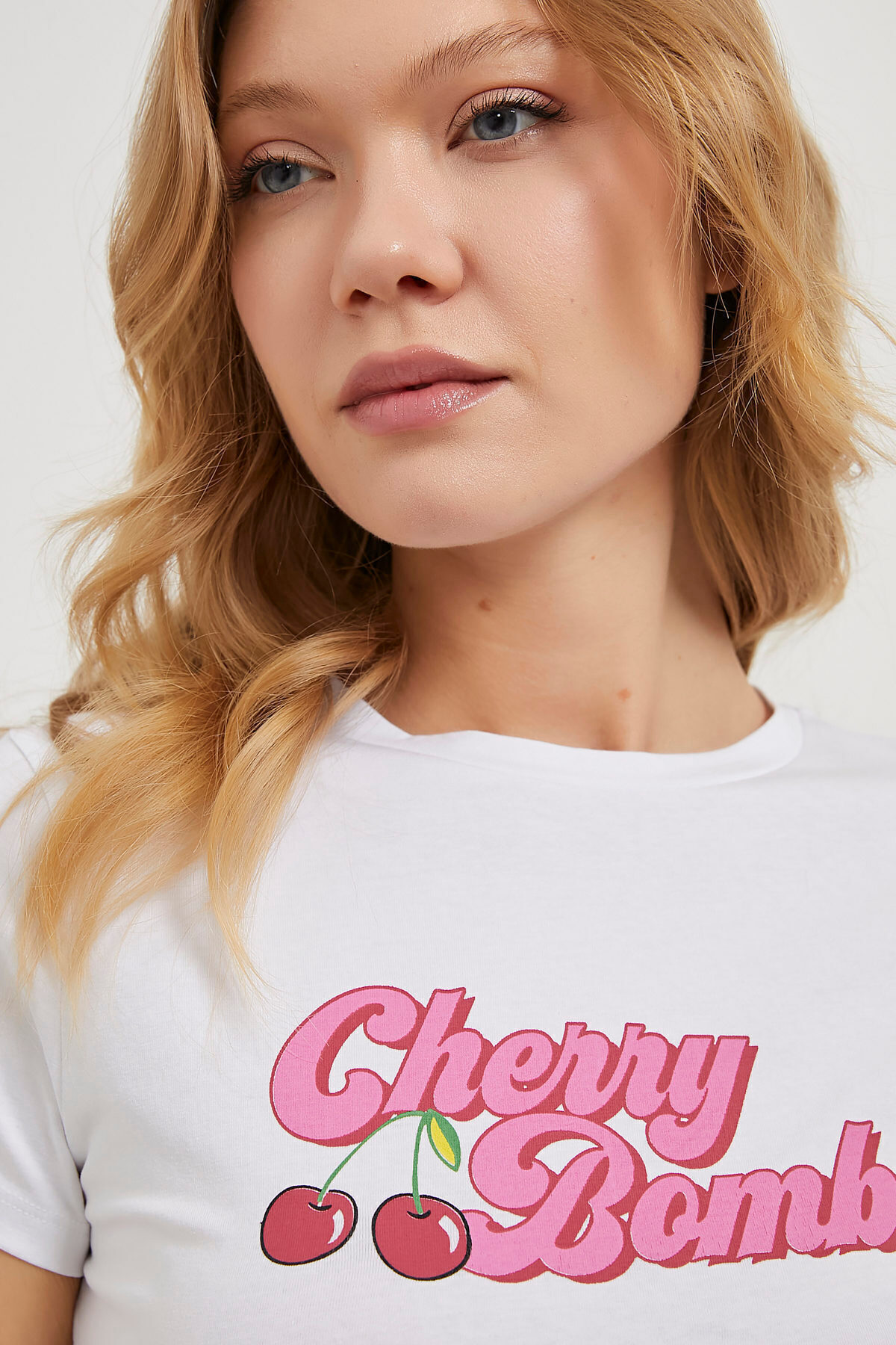Kadın Cherry Baskı Kısa Kol Dar Beyaz Crop Tişört Kadın Cherry Baskı Kısa Kol Dar Beyaz Crop Tişört 544-5YB1144TSH L