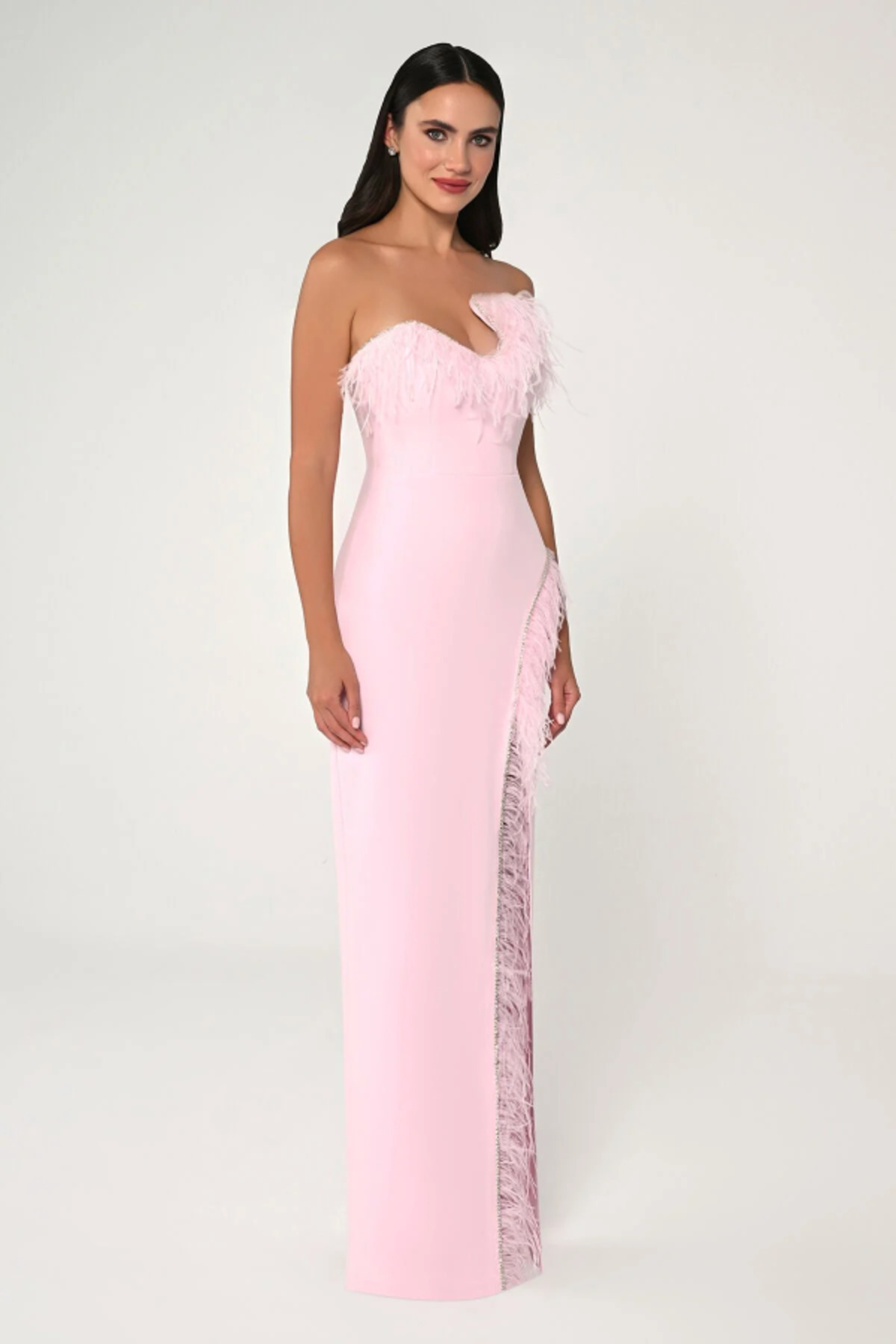 STAPLEZ GÖĞÜS ASİMETRİK KESİM TÜYLÜ TAŞLI KREP UZUN ELBİSE STAPLEZ GÖĞÜS ASİMETRİK KESİM TÜYLÜ TAŞLI KREP UZUN ELBİSE 6768 48