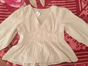 Kadın Krem V Yaka Dantel Detaylı Keten Bluz Vs00387 Kadın Krem V Yaka Dantel Detaylı Keten Bluz Vs00387 VS00387