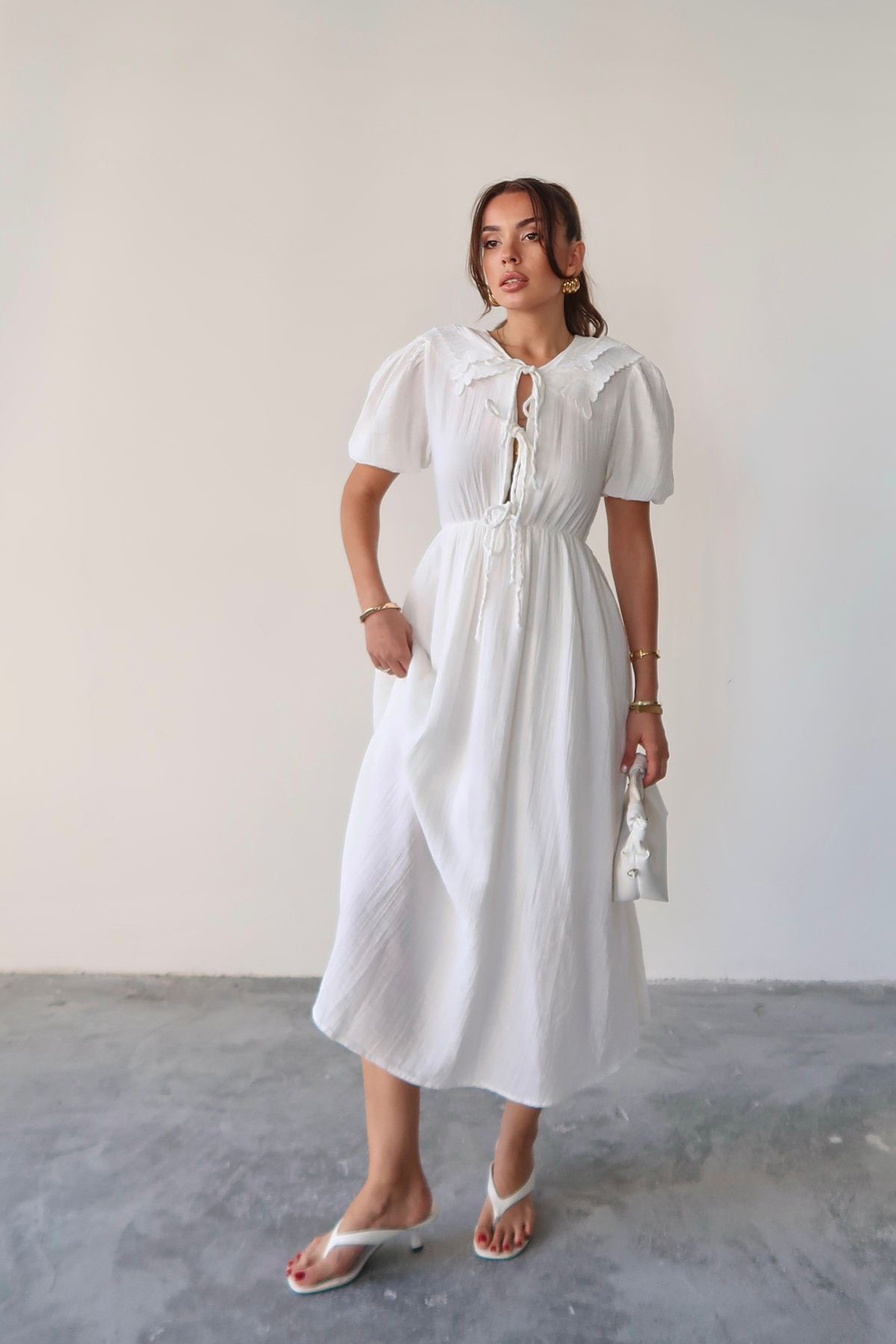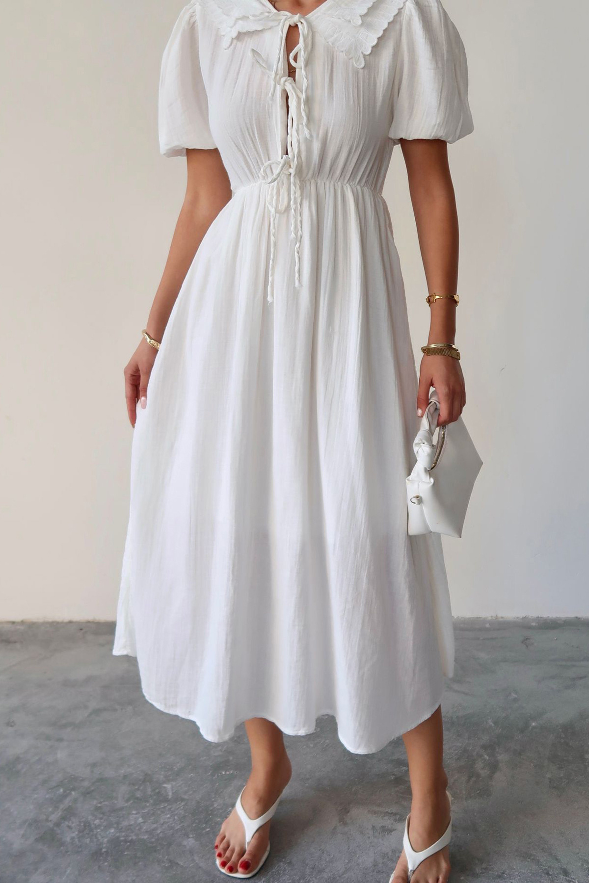 Kadın Beyaz Bebe Yaka Bağlamalı Astarlı Uzun Müslin Elbise Vs00672 Kadın Beyaz Bebe Yaka Bağlamalı Astarlı Uzun Müslin Elbise Vs00672 VS00672 L