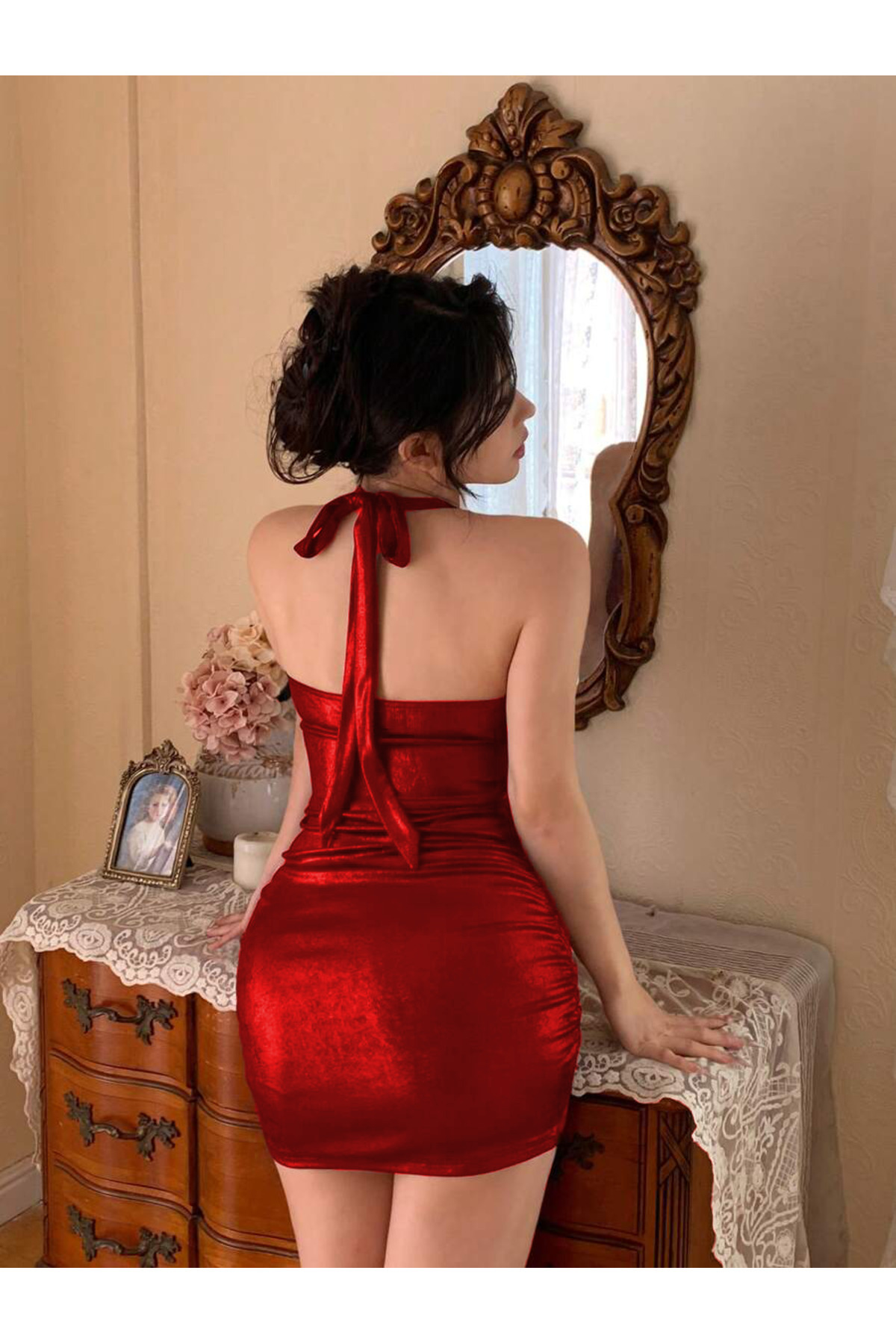 Büzgülü Kırmızı Parlak Mini Elbise Büzgülü Kırmızı Parlak Mini Elbise ZEKMCEL2575EL 4XL