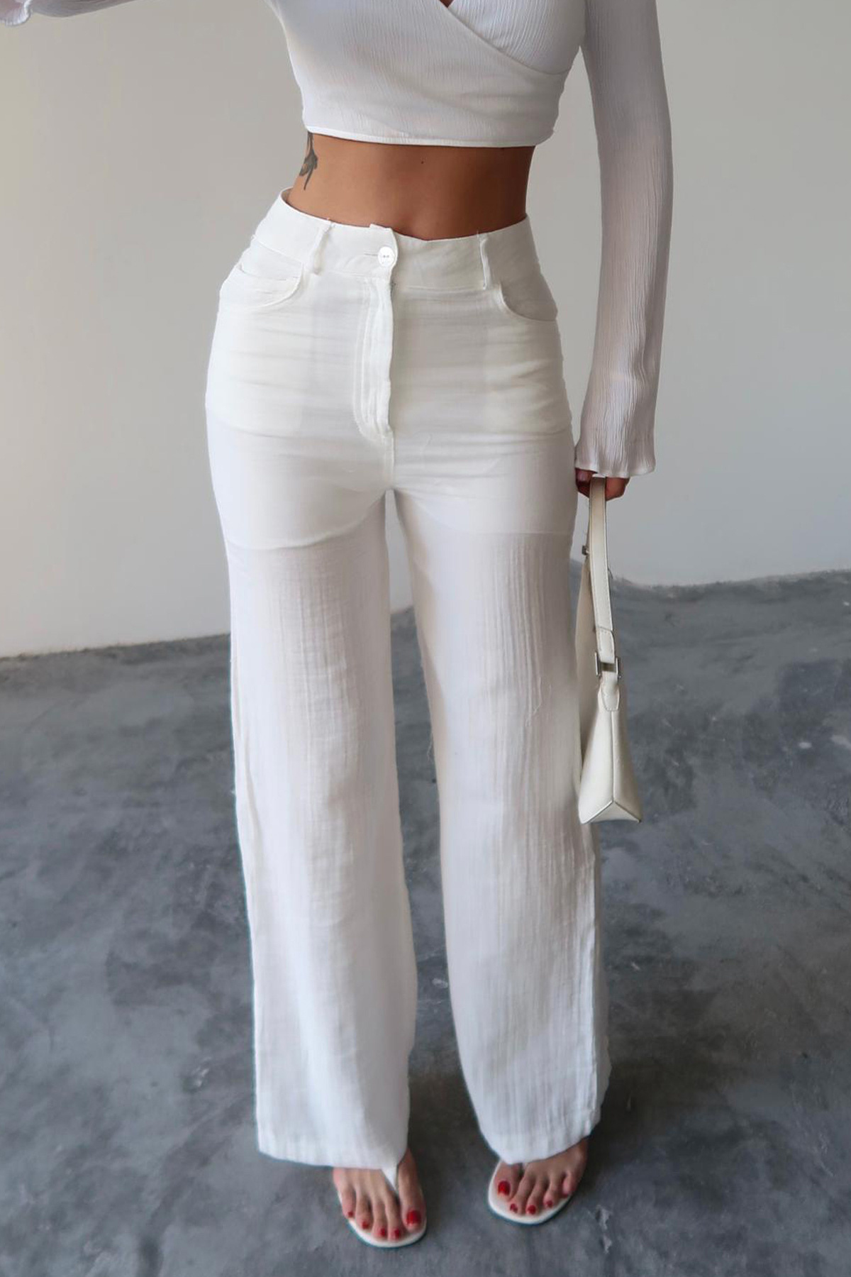 Kadın Beyaz Beş Cepli Bol Paça Müslin Pantolon Vs00674 Kadın Beyaz Beş Cepli Bol Paça Müslin Pantolon Vs00674 VS00674 L