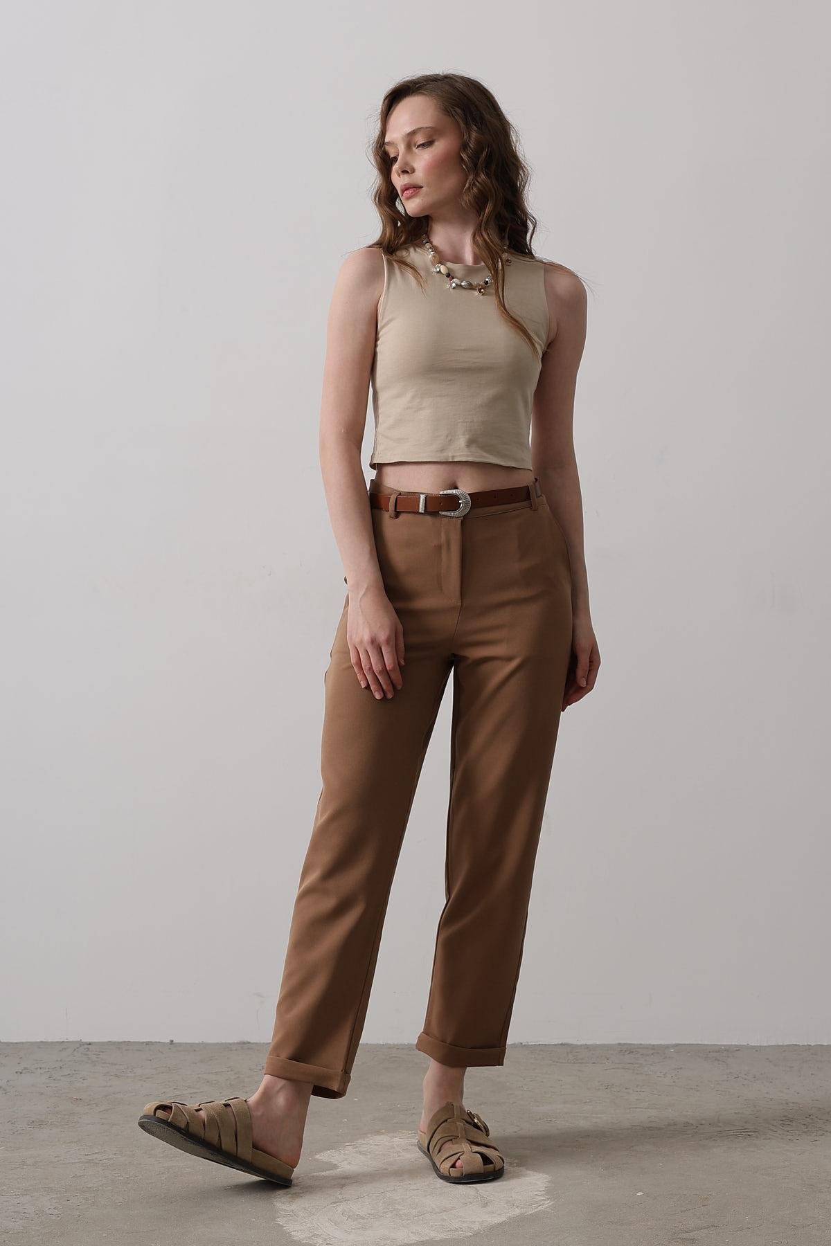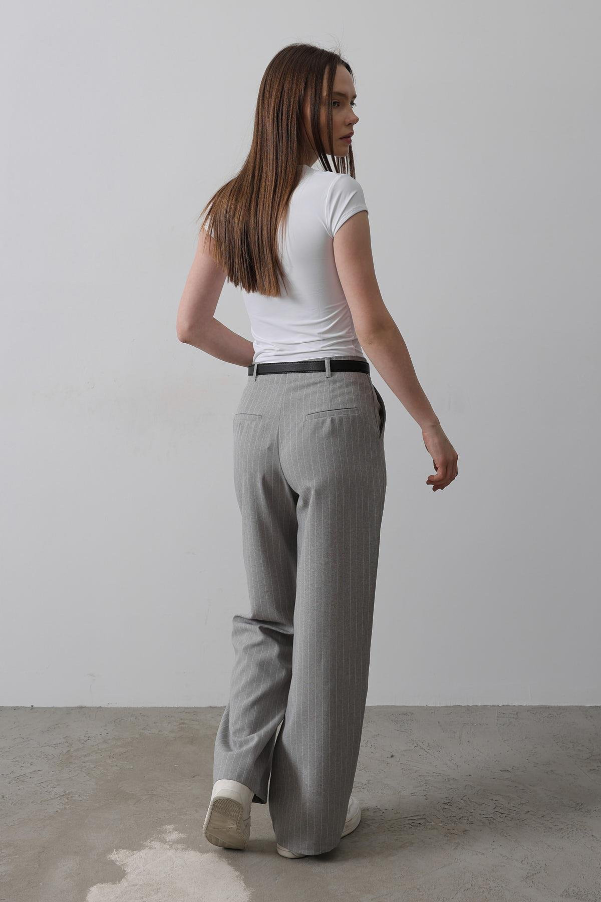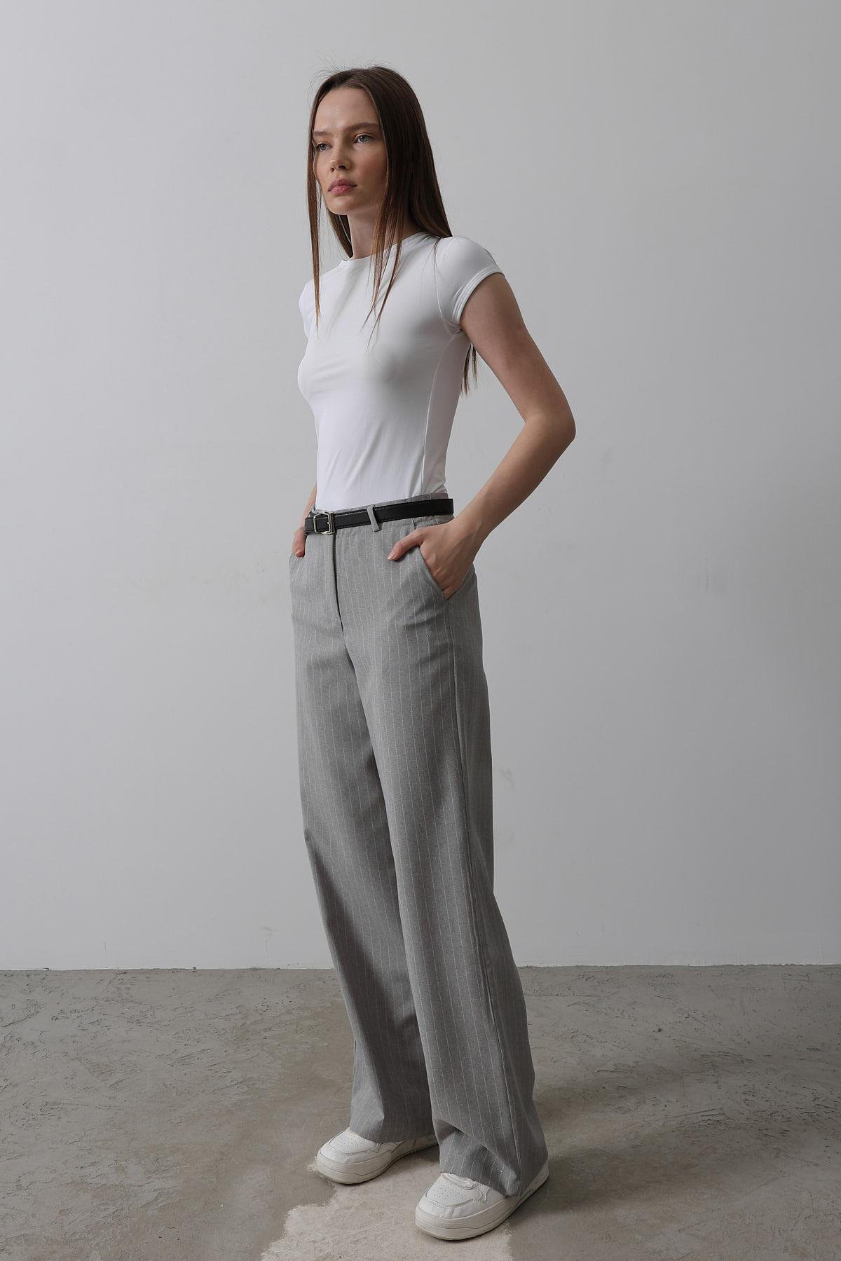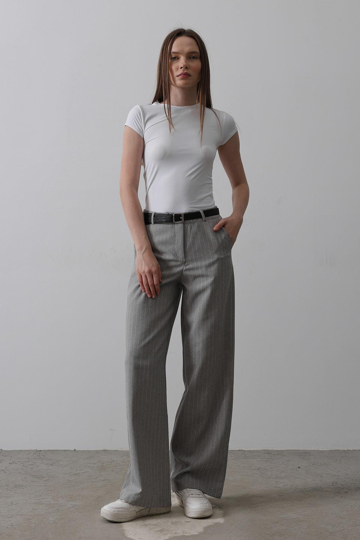 Kadın GRİ-BEYAZ Çift Cepli Kemerli Çizgili Palazzo Pantolon VS00535 Kadın GRİ-BEYAZ Çift Cepli Kemerli Çizgili Palazzo Pantolon VS00535 L