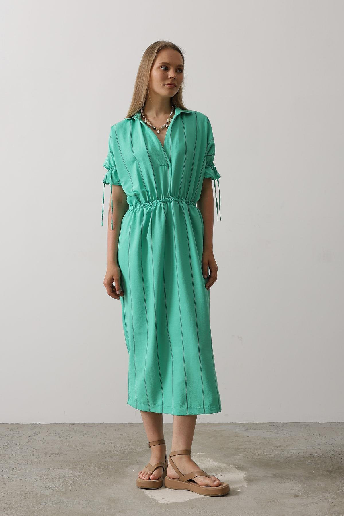Kadın Mavi Gömlek Yaka Beli Ve Kolu Lastikli Çizgili Elbise Vs00564 Kadın Mavi Gömlek Yaka Beli Ve Kolu Lastikli Çizgili Elbise Vs00564 VS00564 L