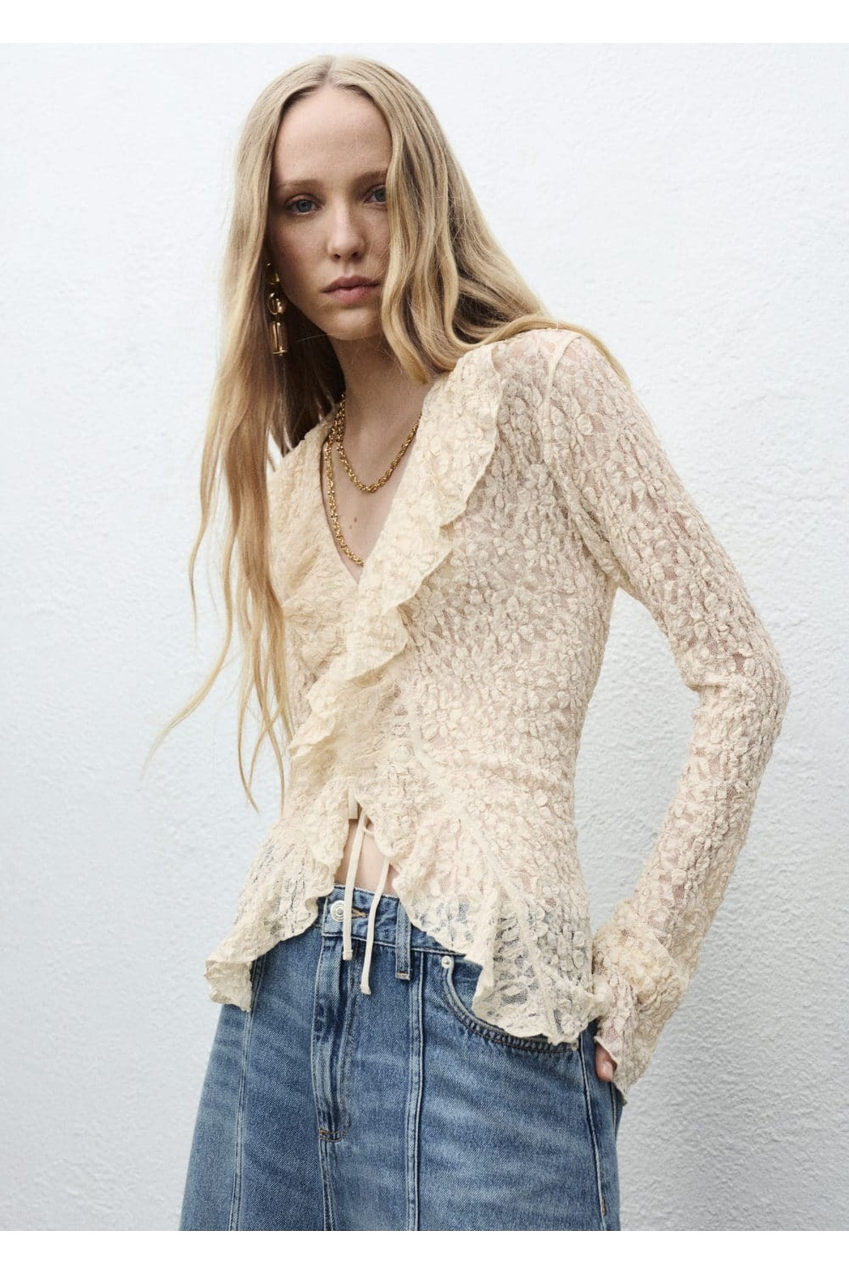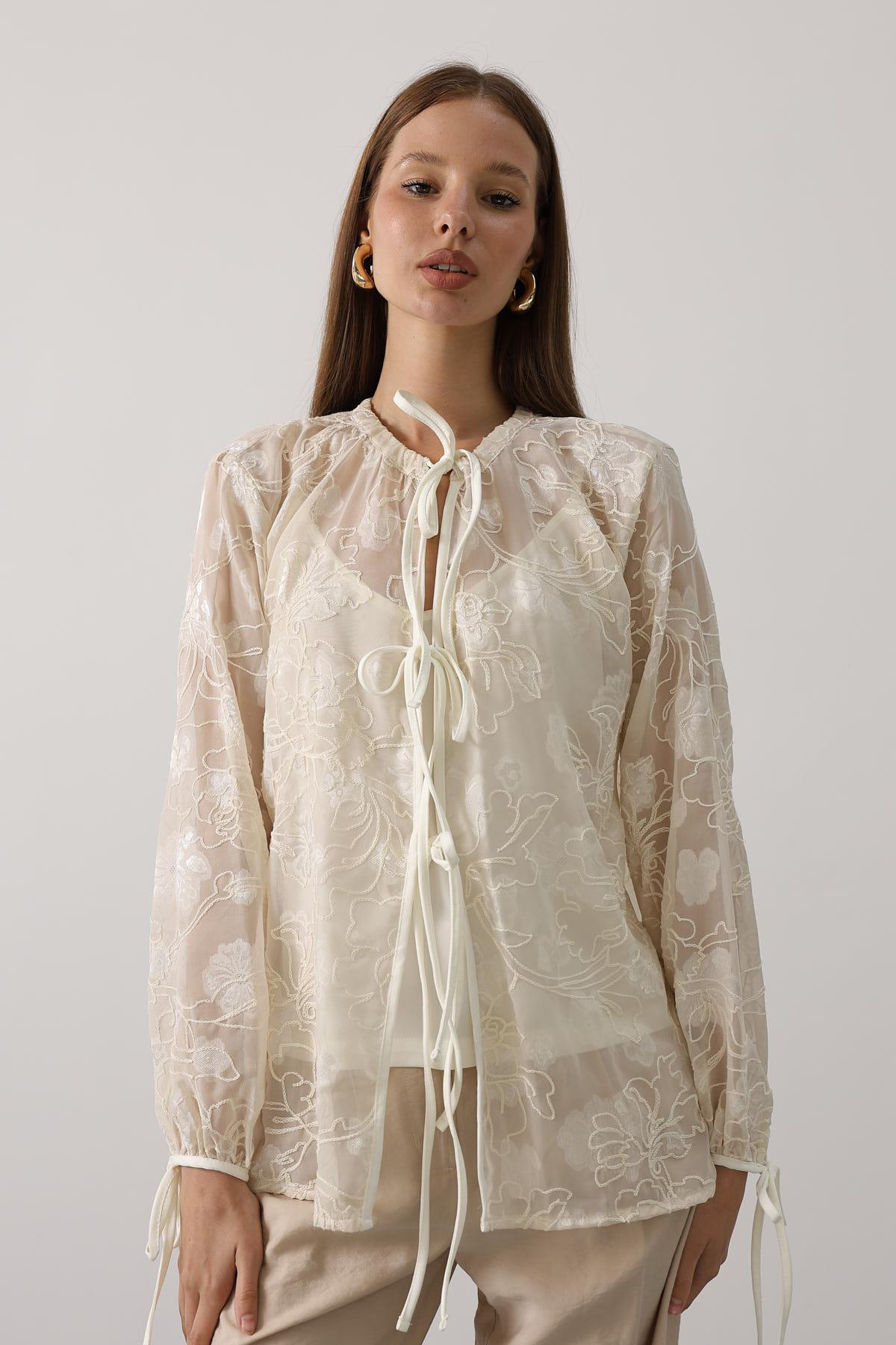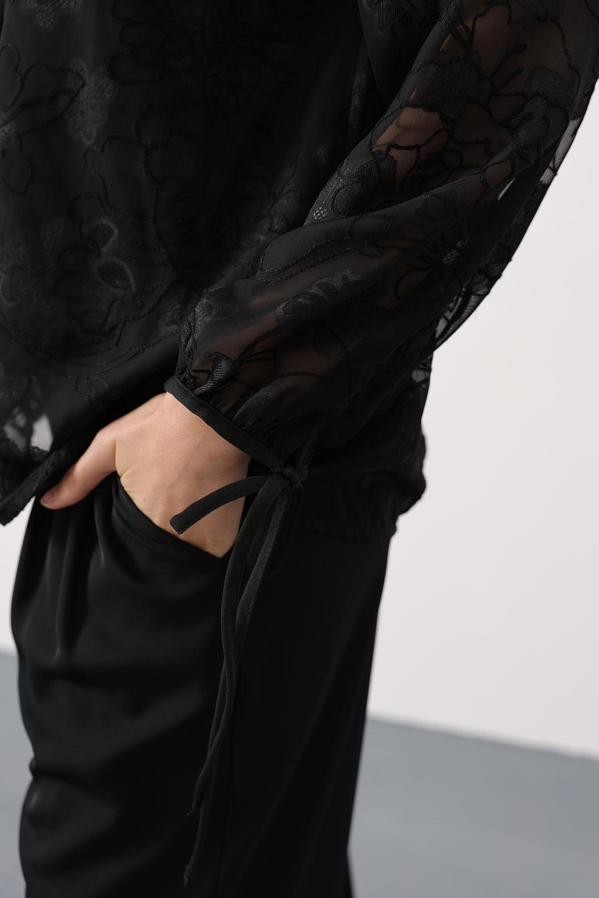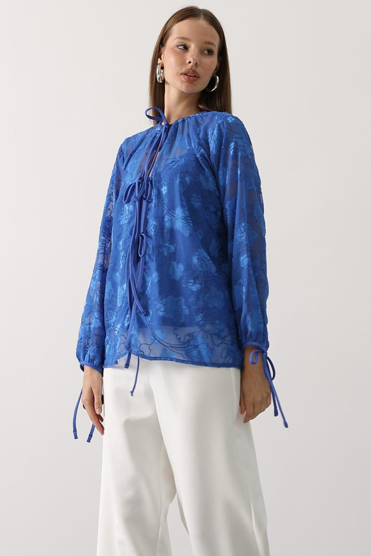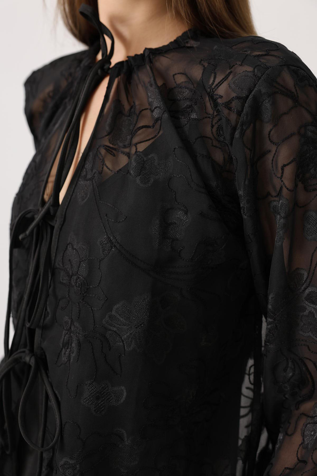 مشخصات فنی Kadın Kendinden Desenli Bağlama Detaylı Şifon Bluz Vs00554