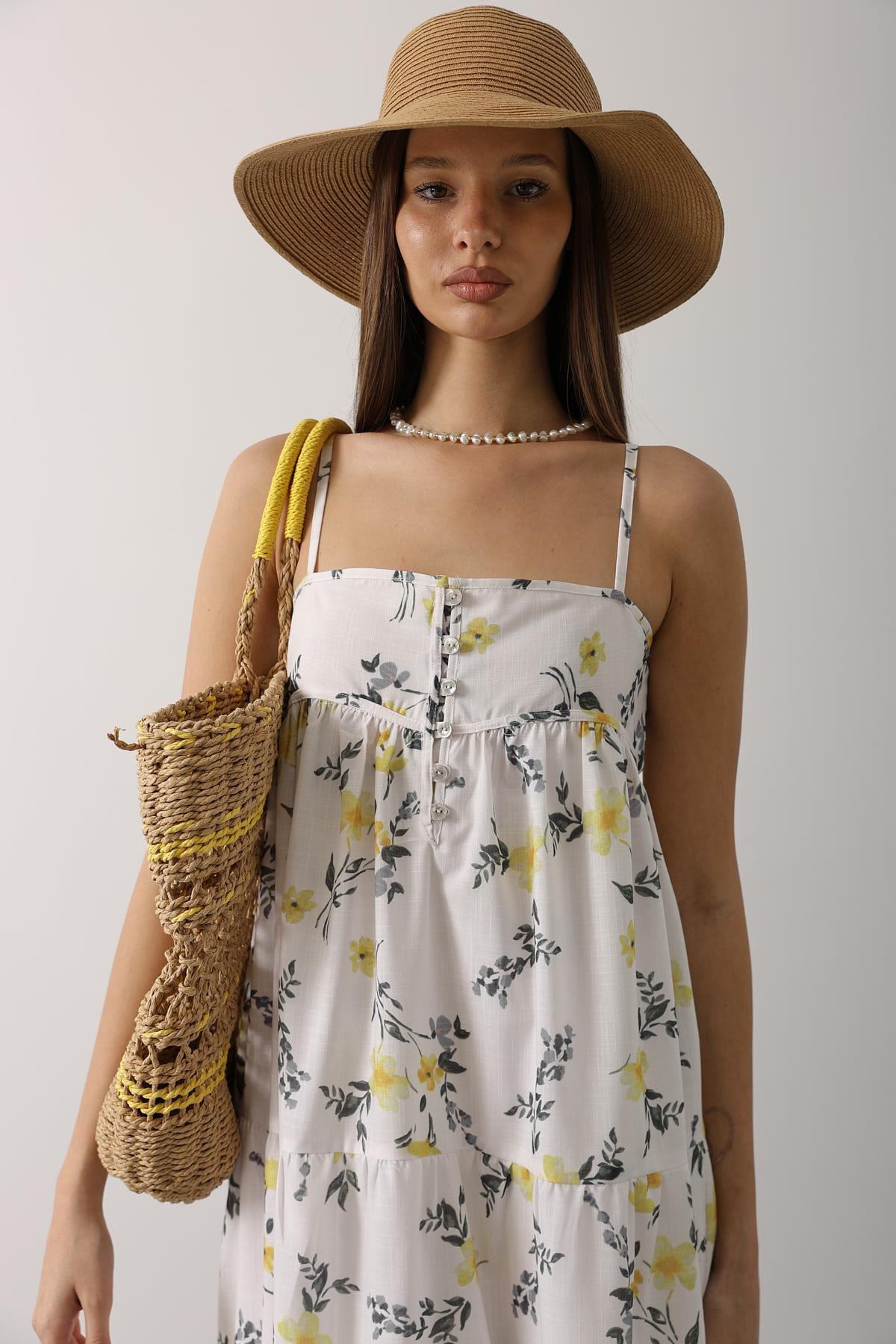 Kadın Sarı Çiçek Desen Askı Detaylı Cok Katlı Elbise Vs00651 Kadın Sarı Çiçek Desen Askı Detaylı Cok Katlı Elbise Vs00651 VS00651 L