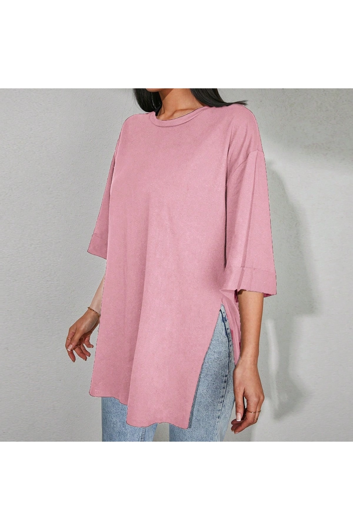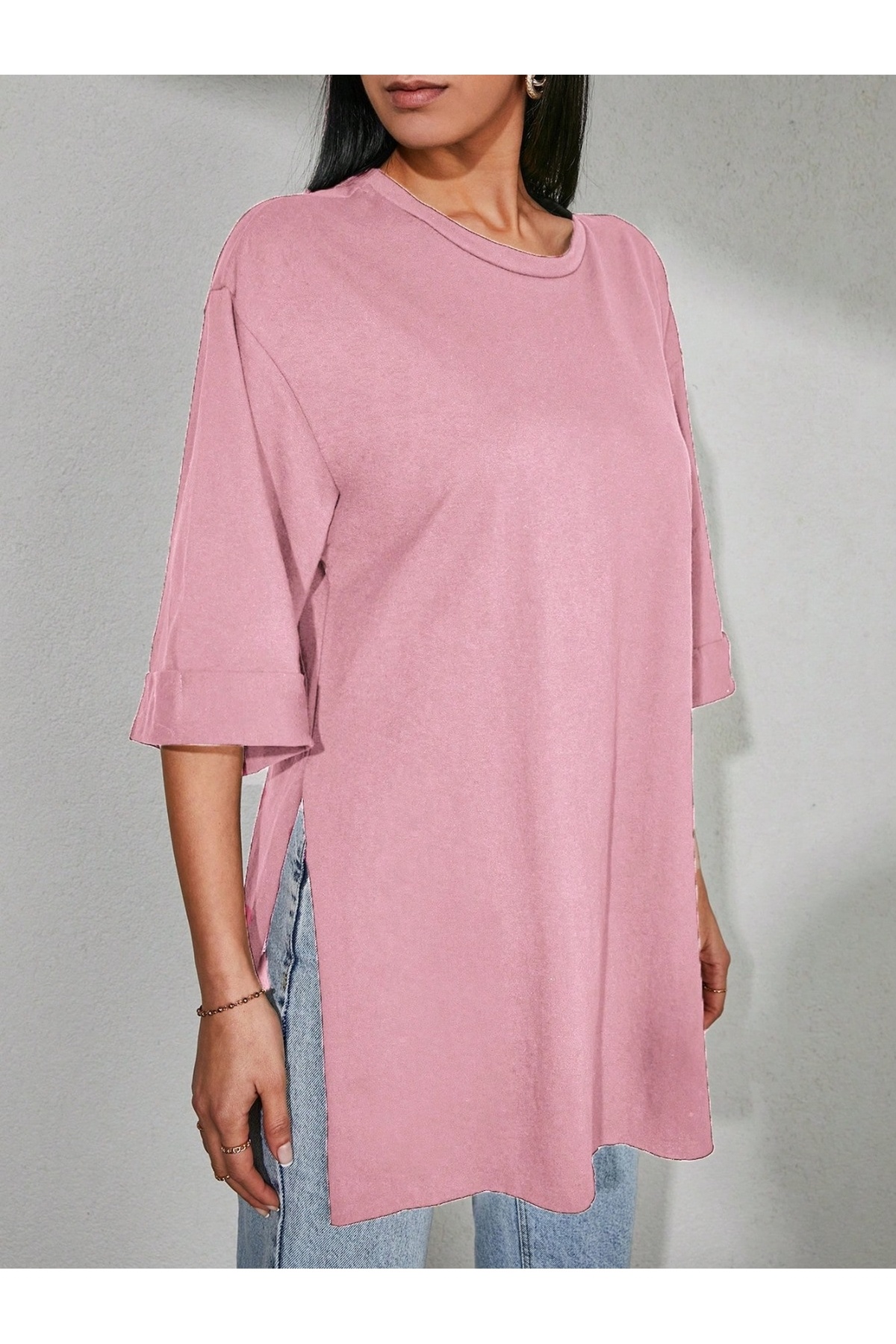 Kadın Standart Beden Duble Kol Yandan Yırtmaçlı Pembe T-shirt Kadın Standart Beden Duble Kol Yandan Yırtmaçlı Pembe T-shirt MM25TS0001 Standart