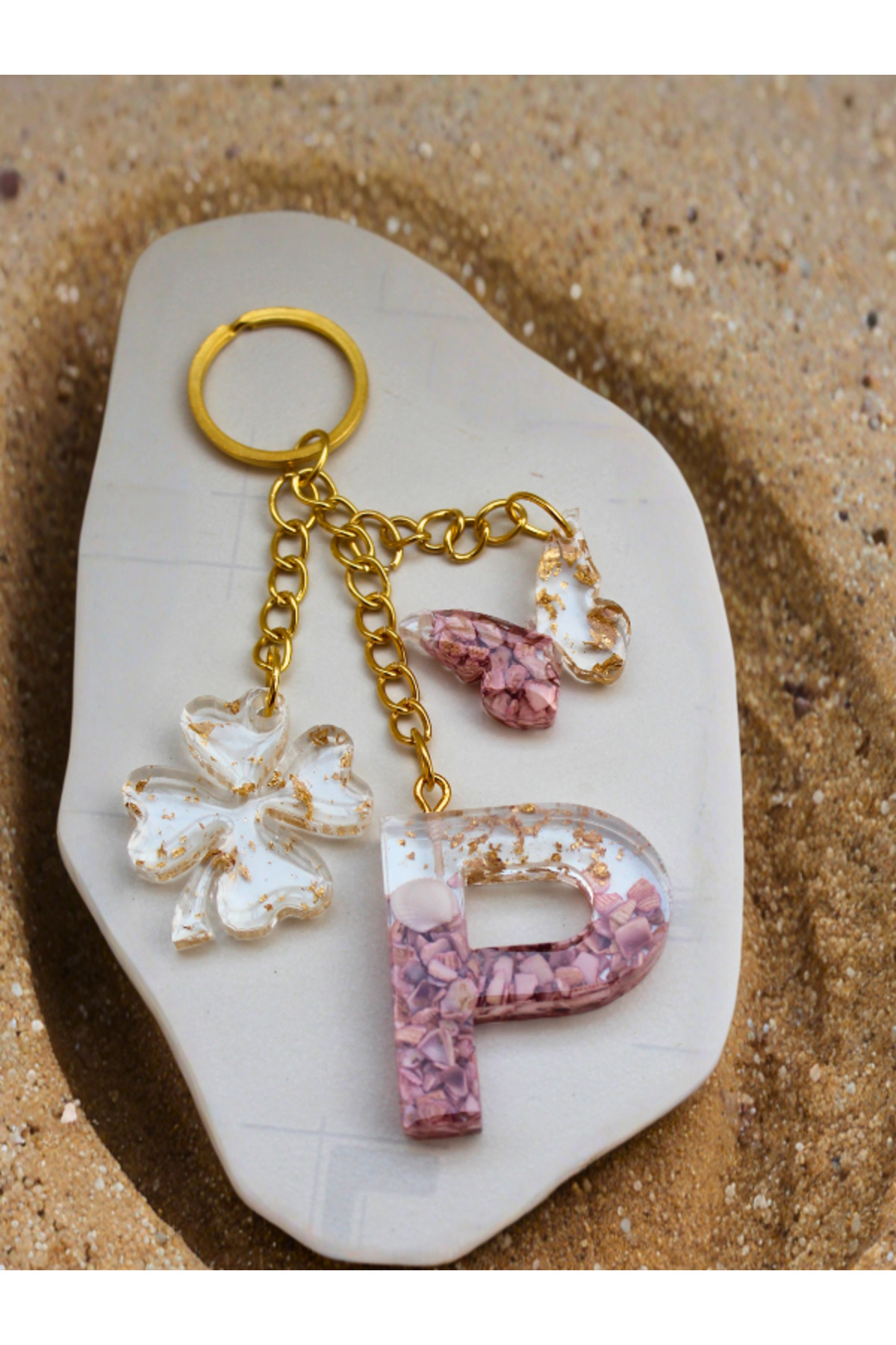 P Harf Pudra Rengi, Deniz kumu,Gold varaklı Yonca ve Kelebek Figür lü Hediyelik anahtarlık El yapımı P Harf Pudra Rengi, Deniz kumu,Gold varaklı Yonca ve Kelebek Figür lü Hediyelik anahtarlık El yapımı P Harf Pudra Rengi Gold Varak تک سایز