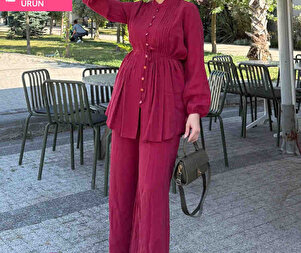 Düğmeli Tunikli Yazlık Kumaş Tril Tril Takım - Kırmızı Düğmeli Tunikli Yazlık Kumaş Tril Tril Takım - Kırmızı CRN44 42