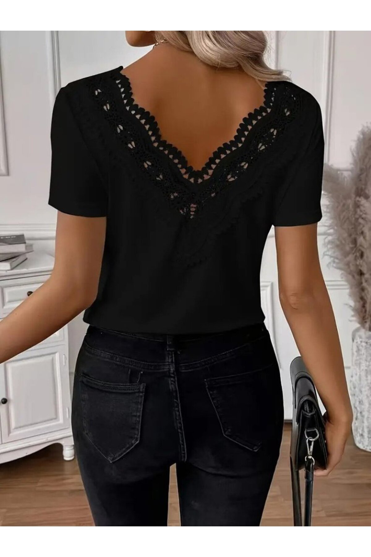 Kadın Kısa Kollu V Yakalı Arkası Dantelli Viskon Bluz Kadın Kısa Kollu V Yakalı Arkası Dantelli Viskon Bluz VY-688b276e95ed2 2XL-3XL