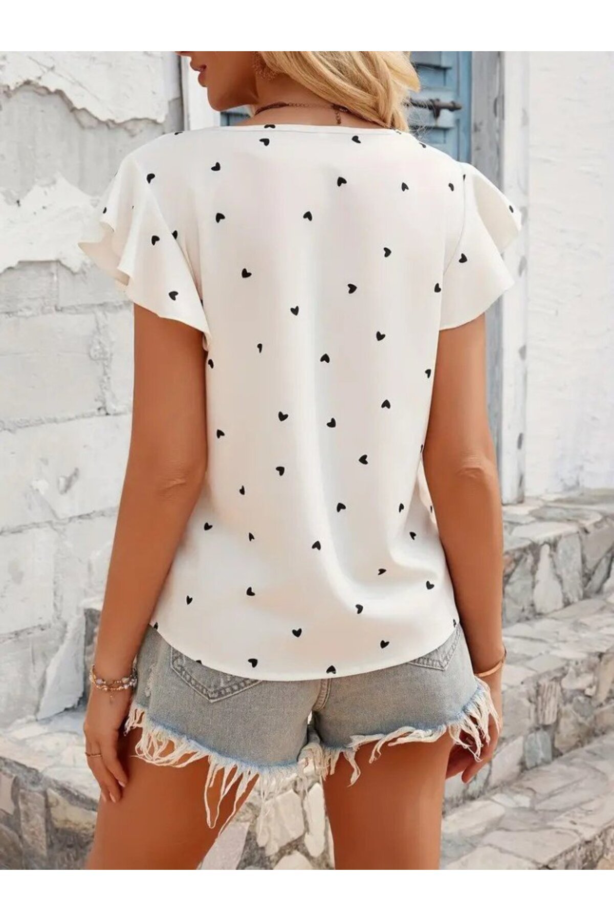 Kadın Kısa Kelebek Kollu Bisiklet Yaka Kalp Desenli Süprem Bluz Kadın Kısa Kelebek Kollu Bisiklet Yaka Kalp Desenli Süprem Bluz VY-688c6d63ee147 2XL-3XL