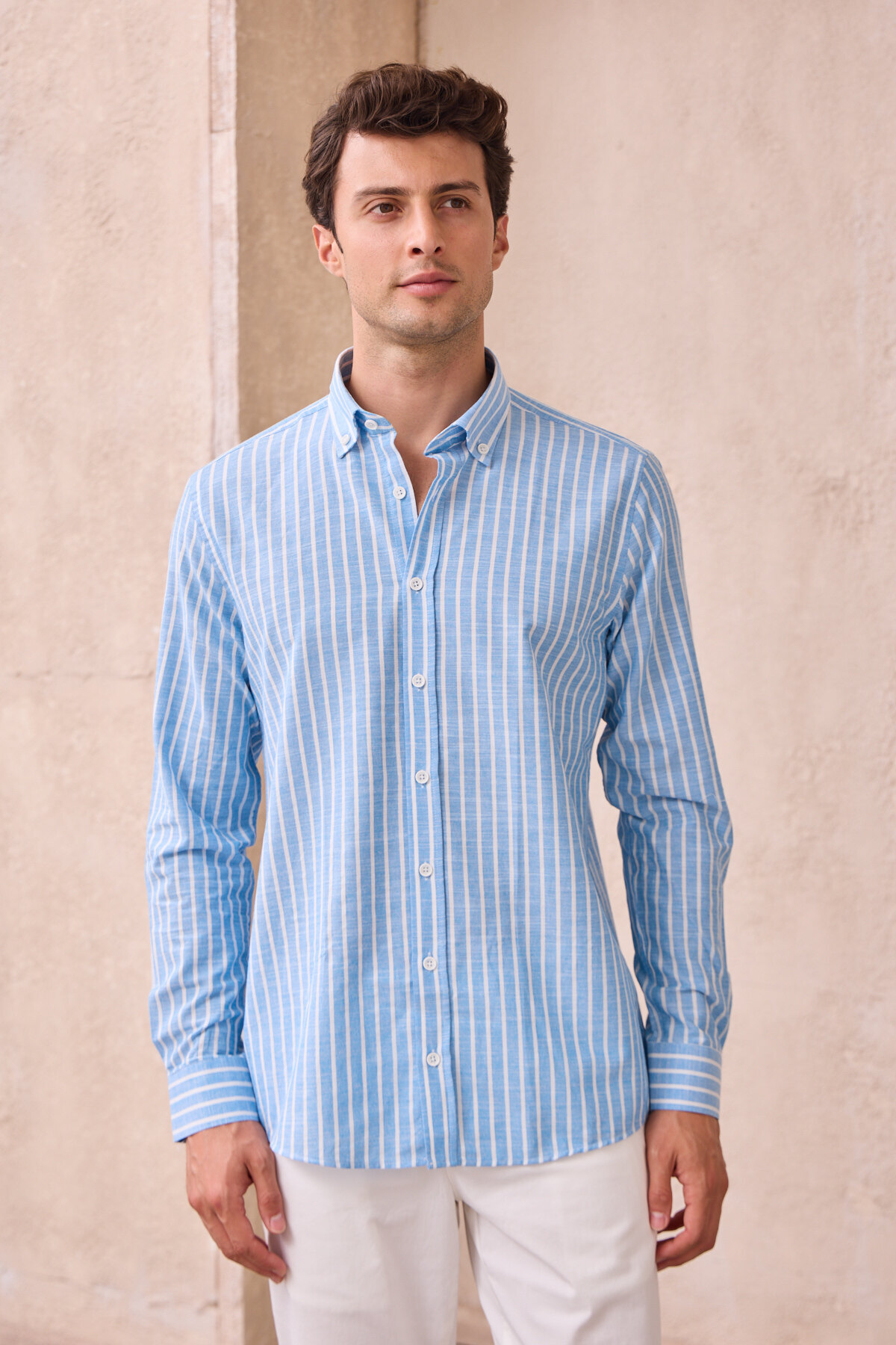 Erkek Çizgili Pamuk Keten Modern Slim Fit Gömlek Erkek Çizgili Pamuk Keten Modern Slim Fit Gömlek KÇ-7878 2XL