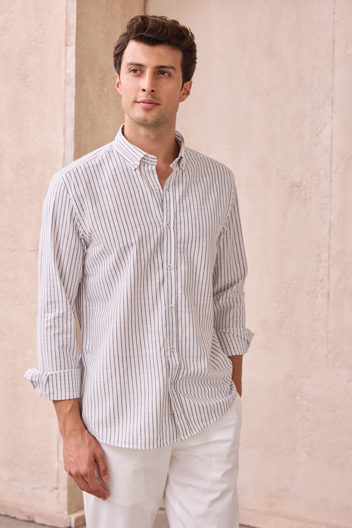 Erkek Çizgili Pamuk Keten Modern Slim Fit Gömlek Erkek Çizgili Pamuk Keten Modern Slim Fit Gömlek BÇ-78 2XL