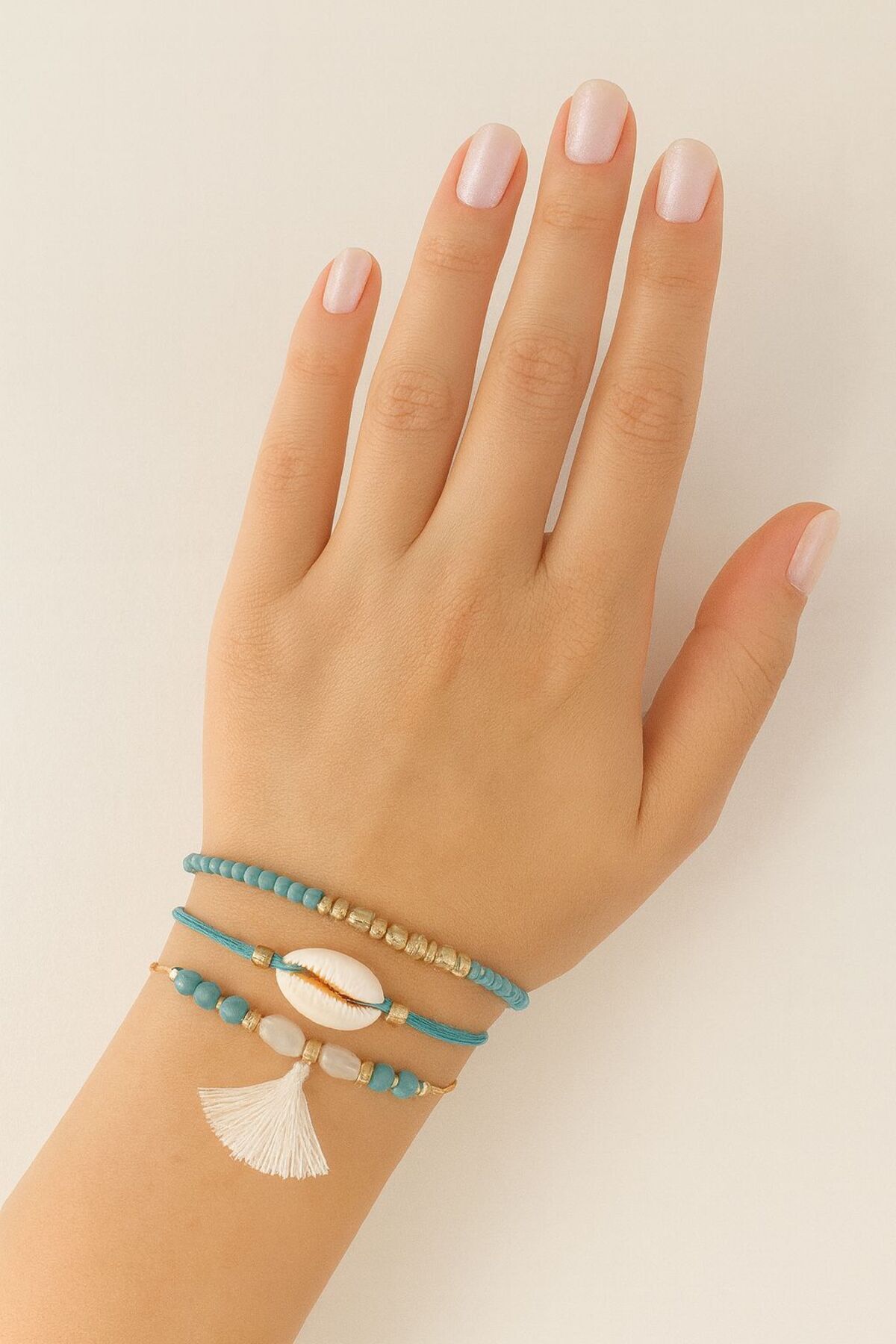 3lü deniz kabuklu incili püsküllü asansörlü lastikli turkuaz ip bileklik. Kadın ip bileklik halhal 3lü deniz kabuklu incili püsküllü asansörlü lastikli turkuaz ip bileklik. Kadın ip bileklik halhal KEEBABLKLK30 27 cm