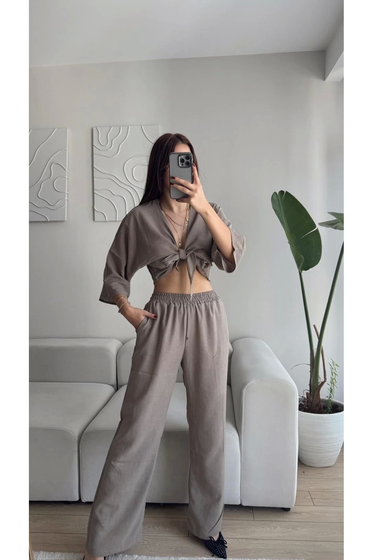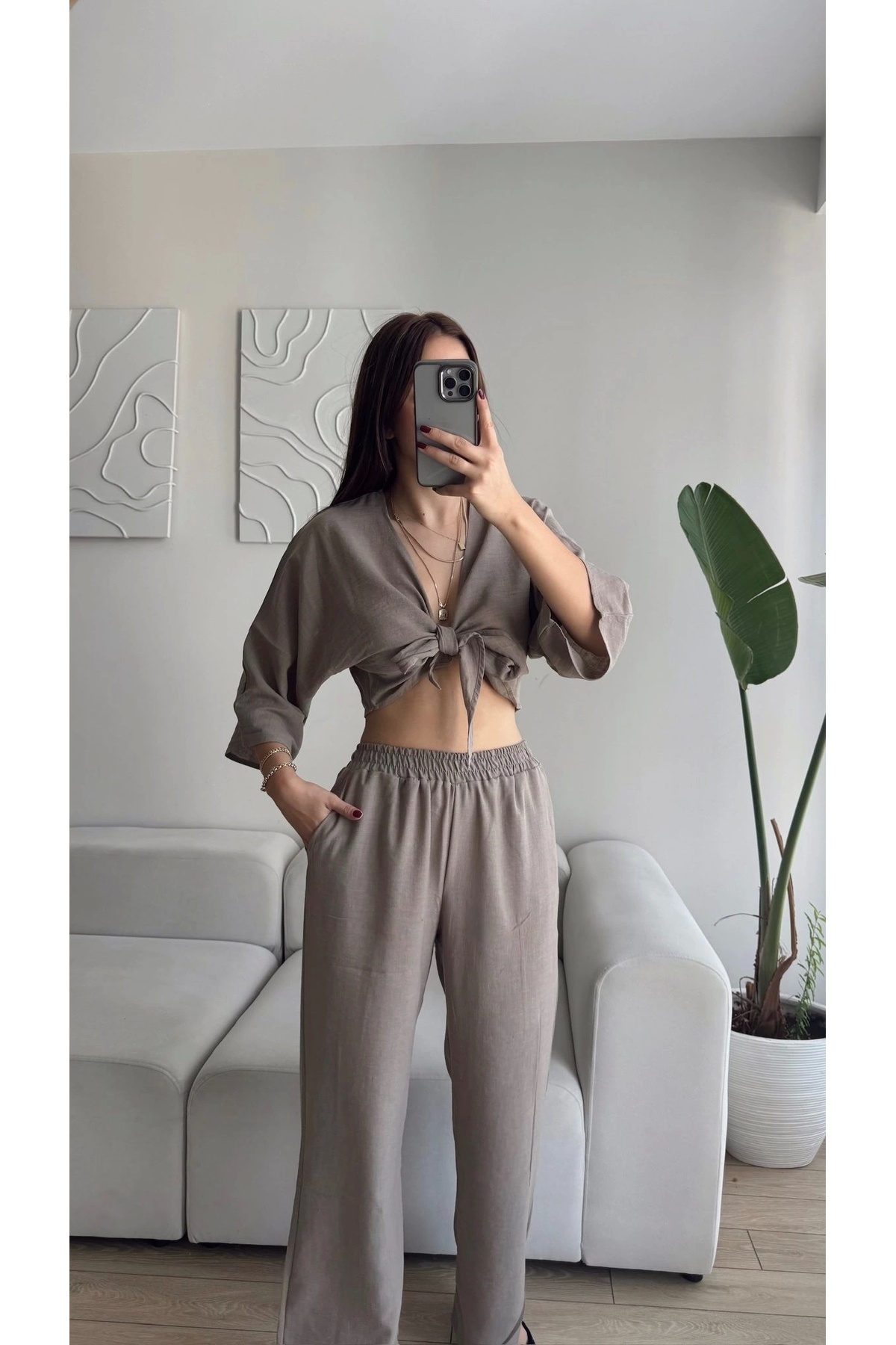 Bağlamalı Crop & Pantolon Takım - VİZON Bağlamalı Crop & Pantolon Takım - VİZON P17715S3605 L