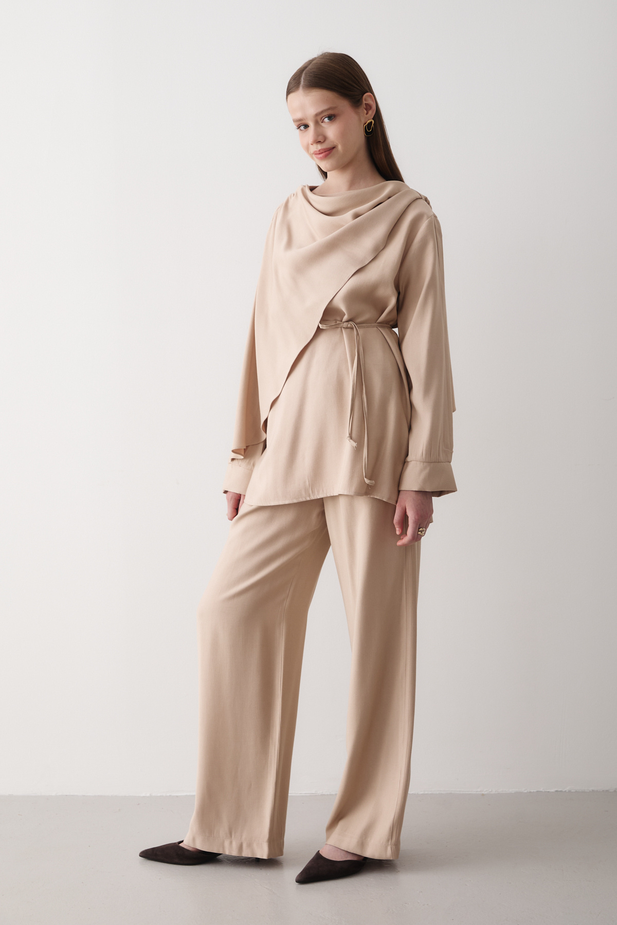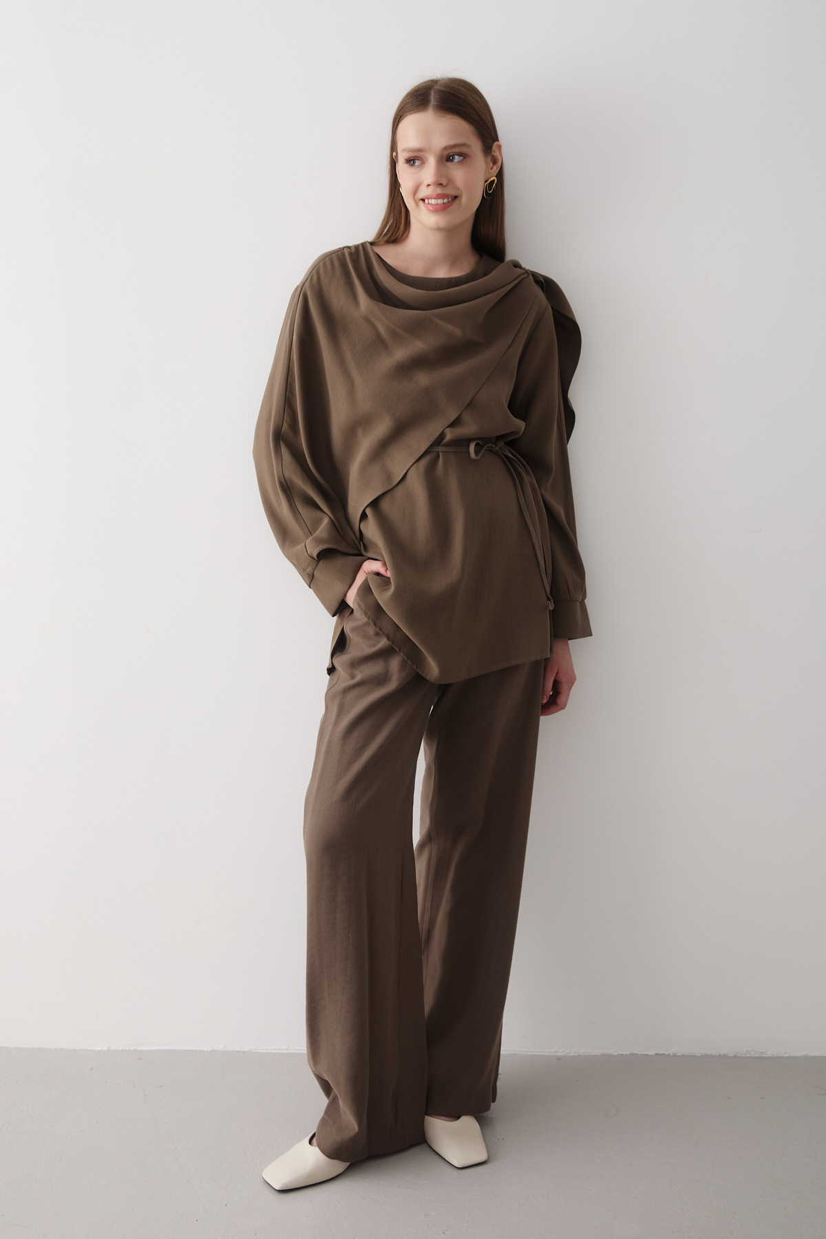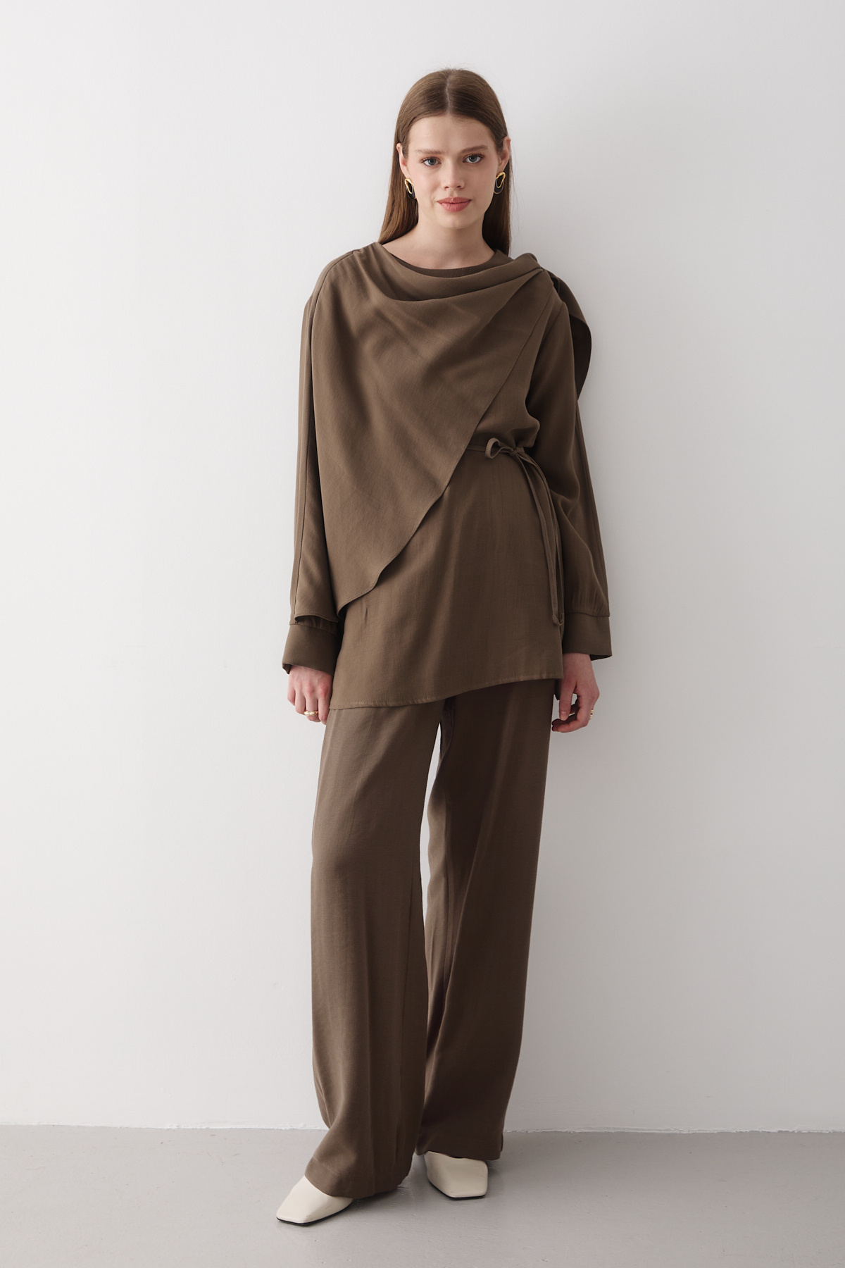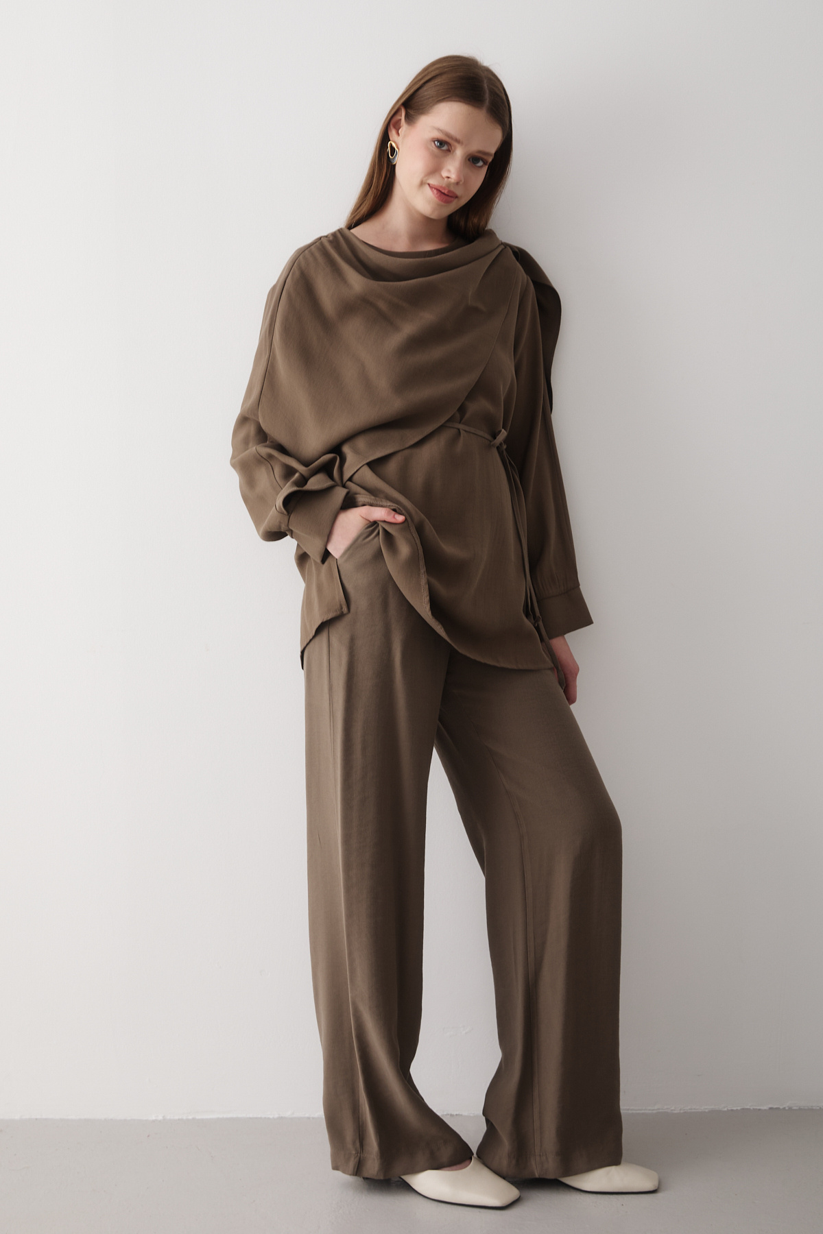 Kadın Drapeli Kuşaklı Bluz & Bol Paça Beli Lastikli Pantolon Takım Kadın Drapeli Kuşaklı Bluz & Bol Paça Beli Lastikli Pantolon Takım 8625 XL