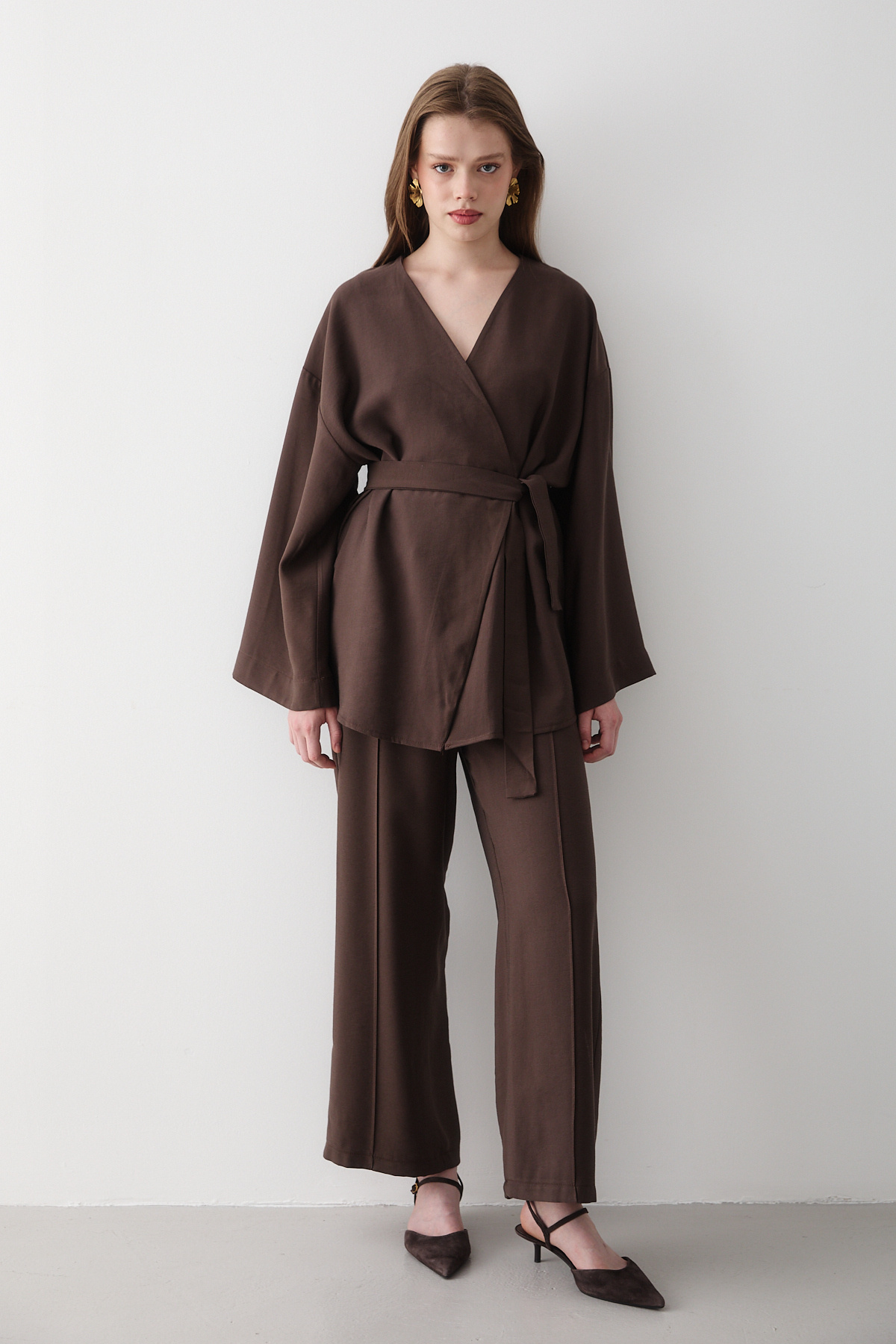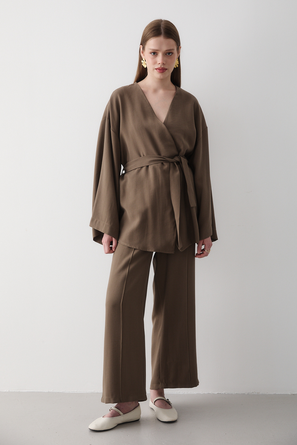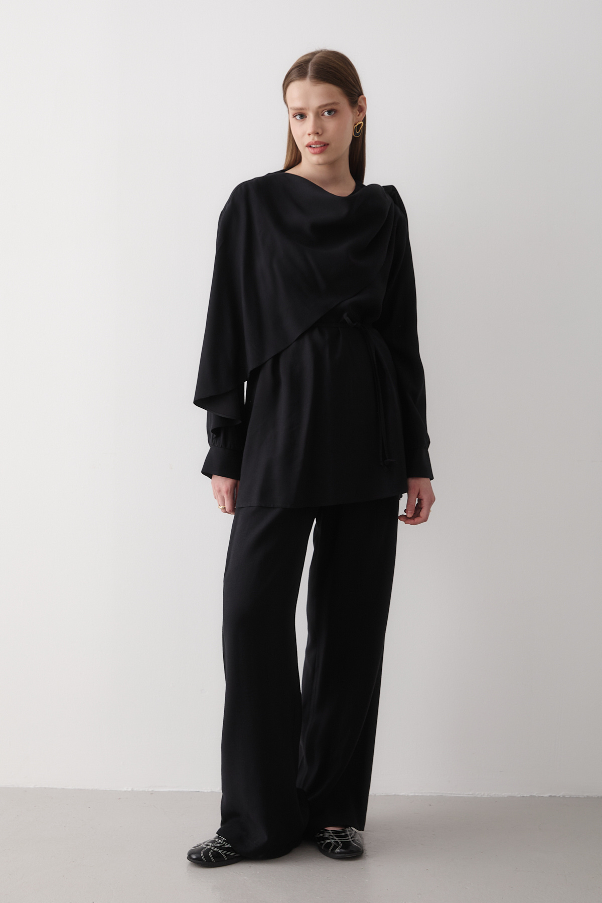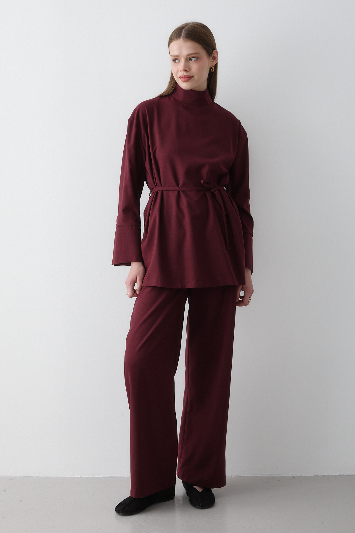 Kadın Drapeli Kuşaklı Bluz & Bol Paça Beli Lastikli Pantolon Takım Kadın Drapeli Kuşaklı Bluz & Bol Paça Beli Lastikli Pantolon Takım 8625 XL