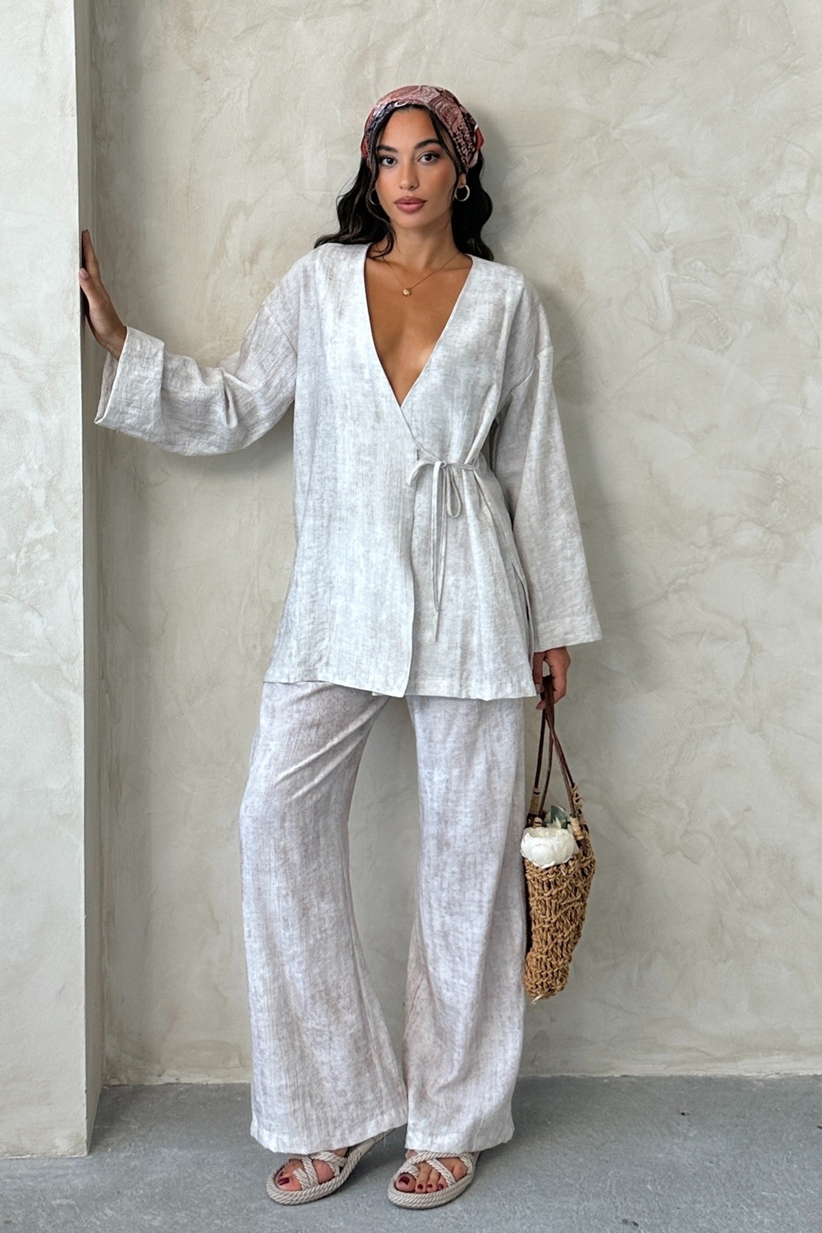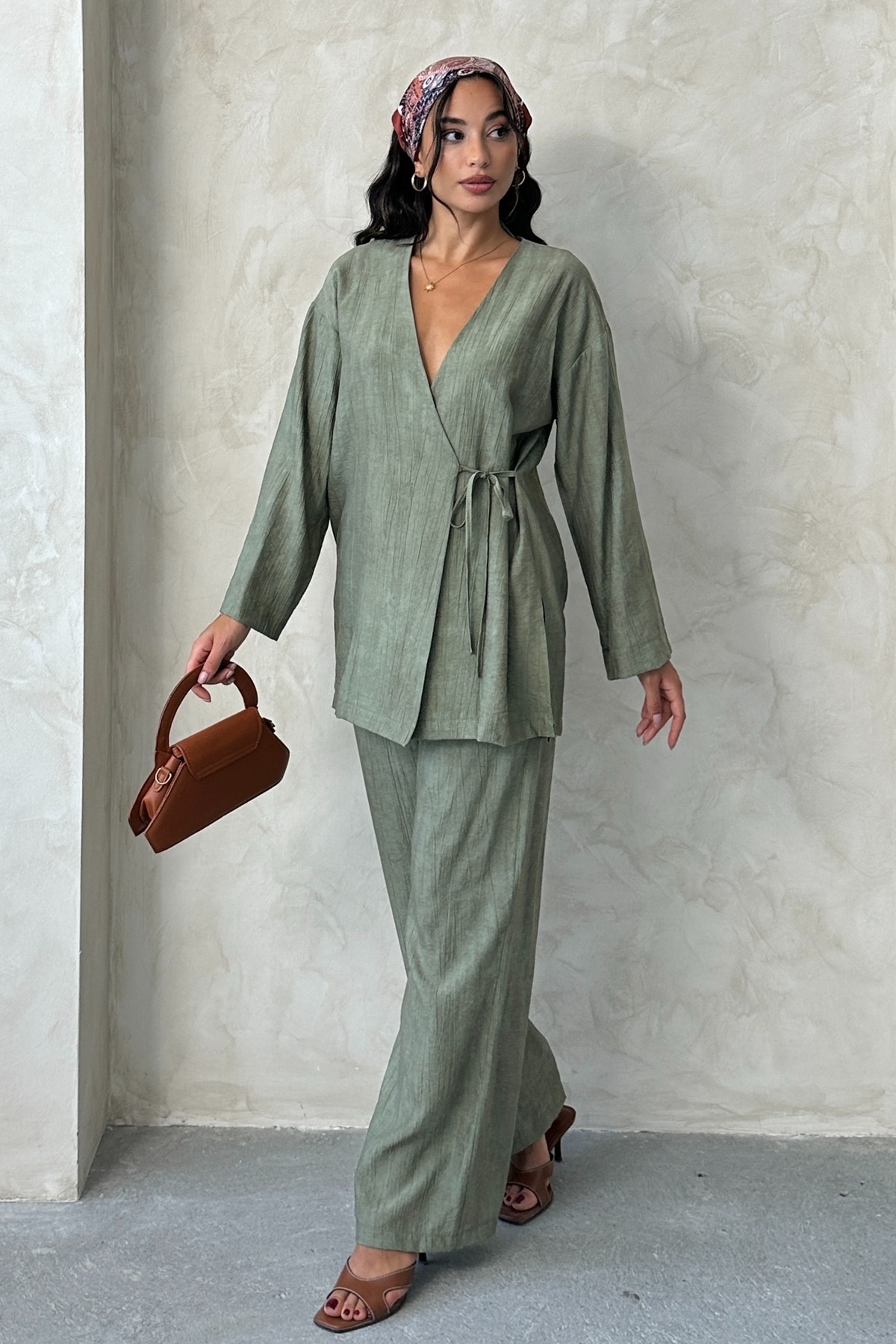 Kadın Bağlamalı Yırtmaçlı Kimono Pantolon Takım Kadın Bağlamalı Yırtmaçlı Kimono Pantolon Takım MDTRN34185 2XL