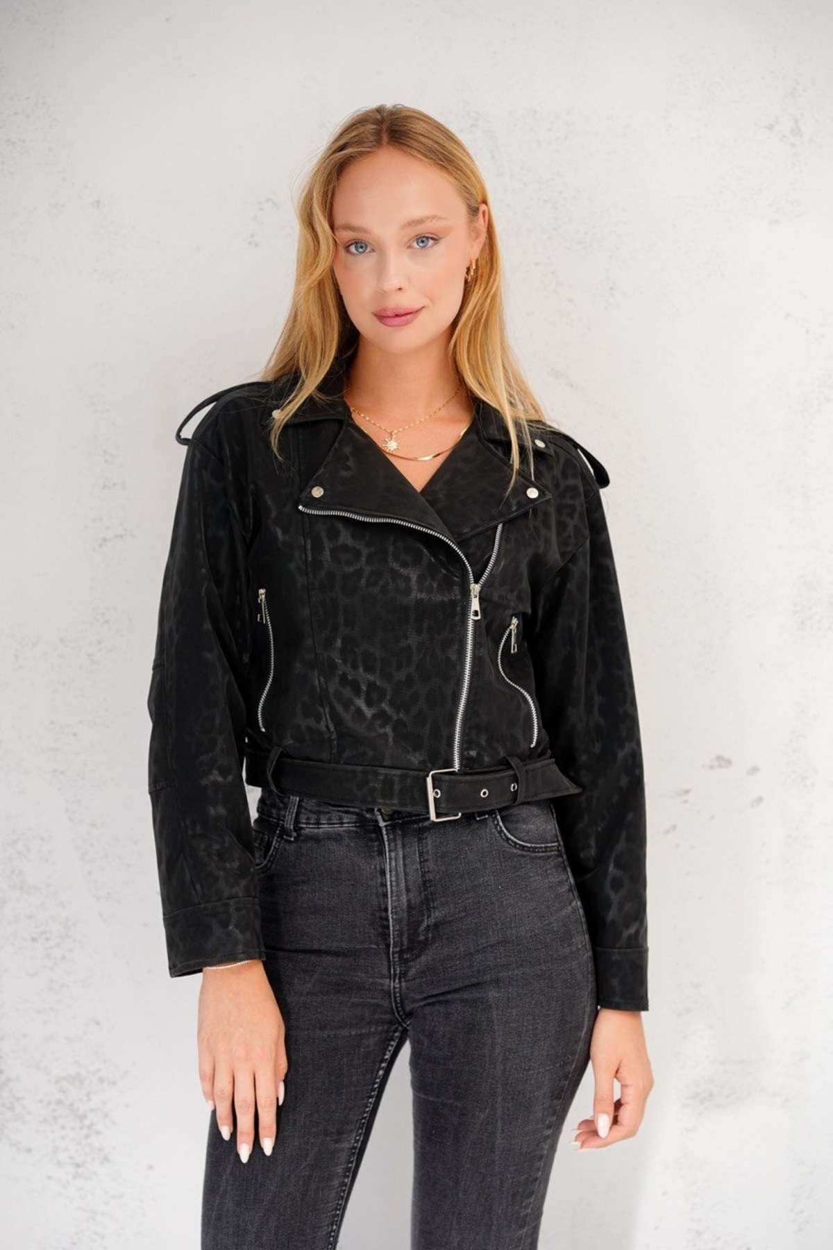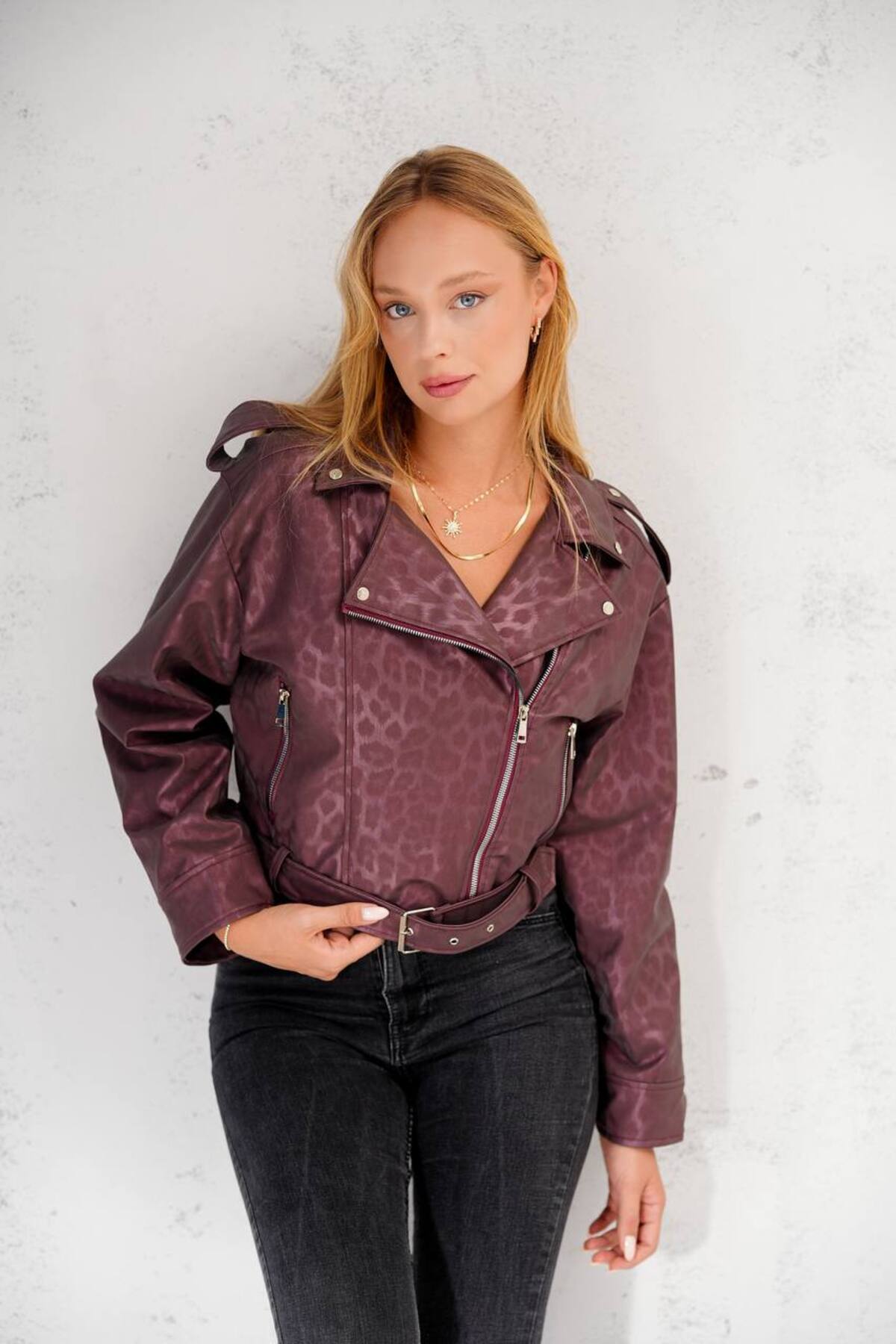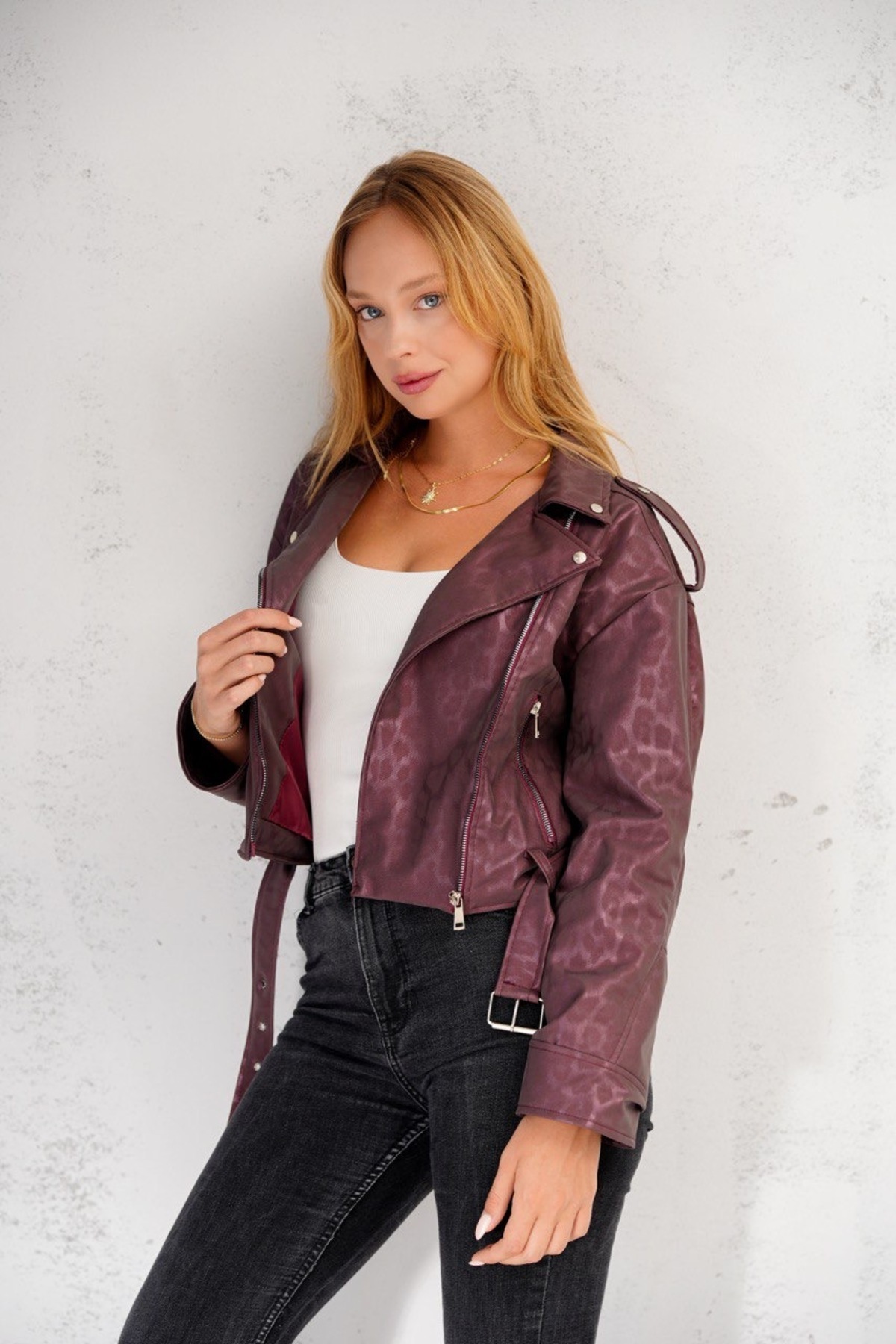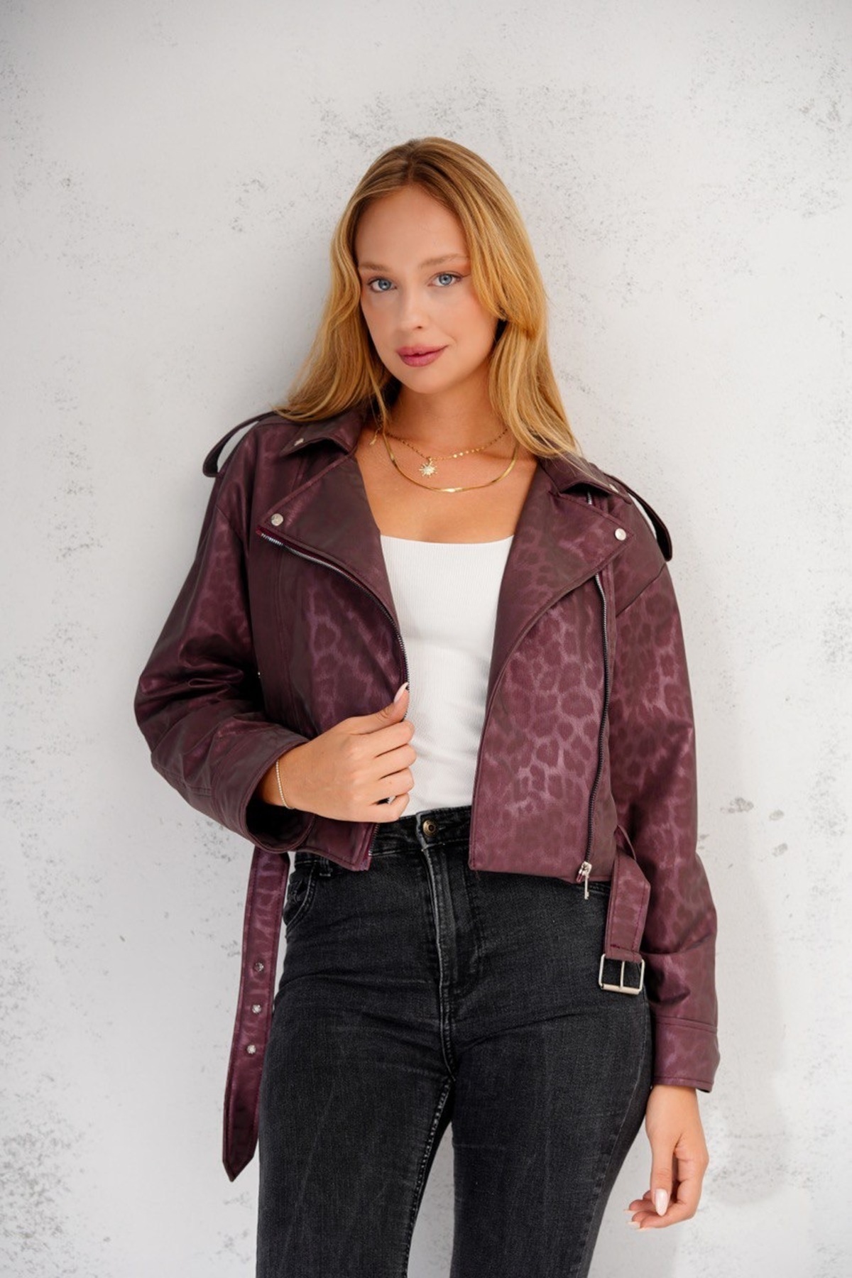 Leopar Desenli Bordo Kısa Kemerli Kadın Ceket Leopar Desenli Bordo Kısa Kemerli Kadın Ceket CKT1248 L