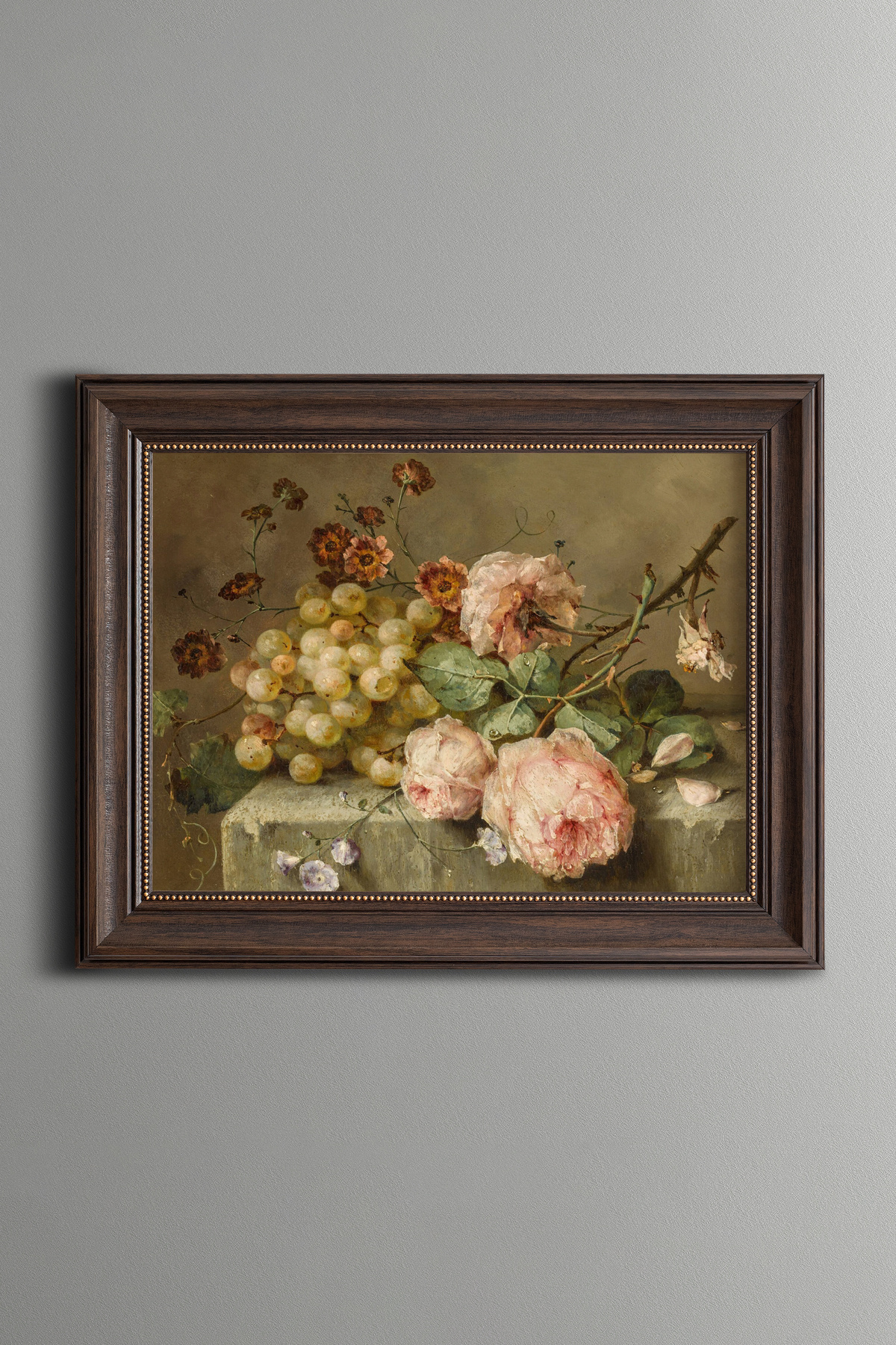 Gül ve Üzümlerle Natürmort - Vintage Desenli Çerçeve Gül ve Üzümlerle Natürmort - Vintage Desenli Çerçeve art00610 50 x 70