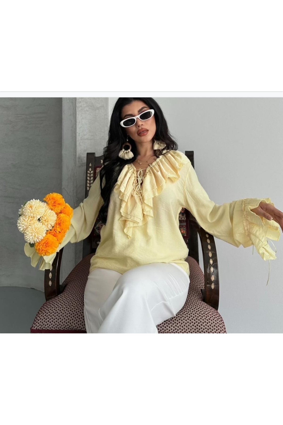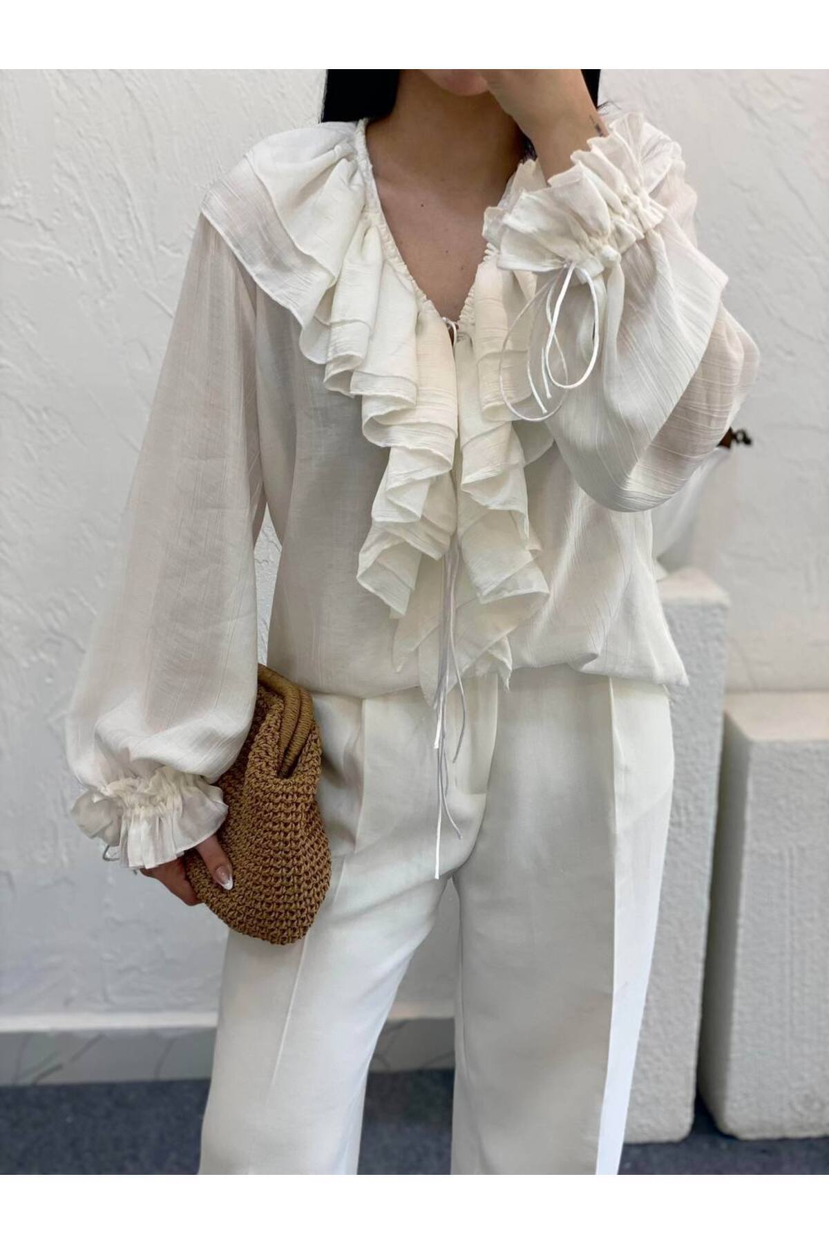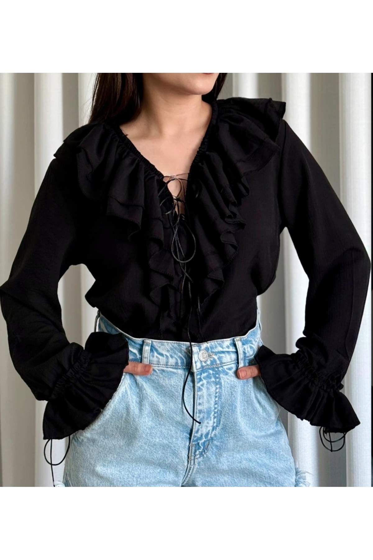 Yakası ve Kolu Fırfırlı Uzun Kollu Bluz Yakası ve Kolu Fırfırlı Uzun Kollu Bluz 55617 XL