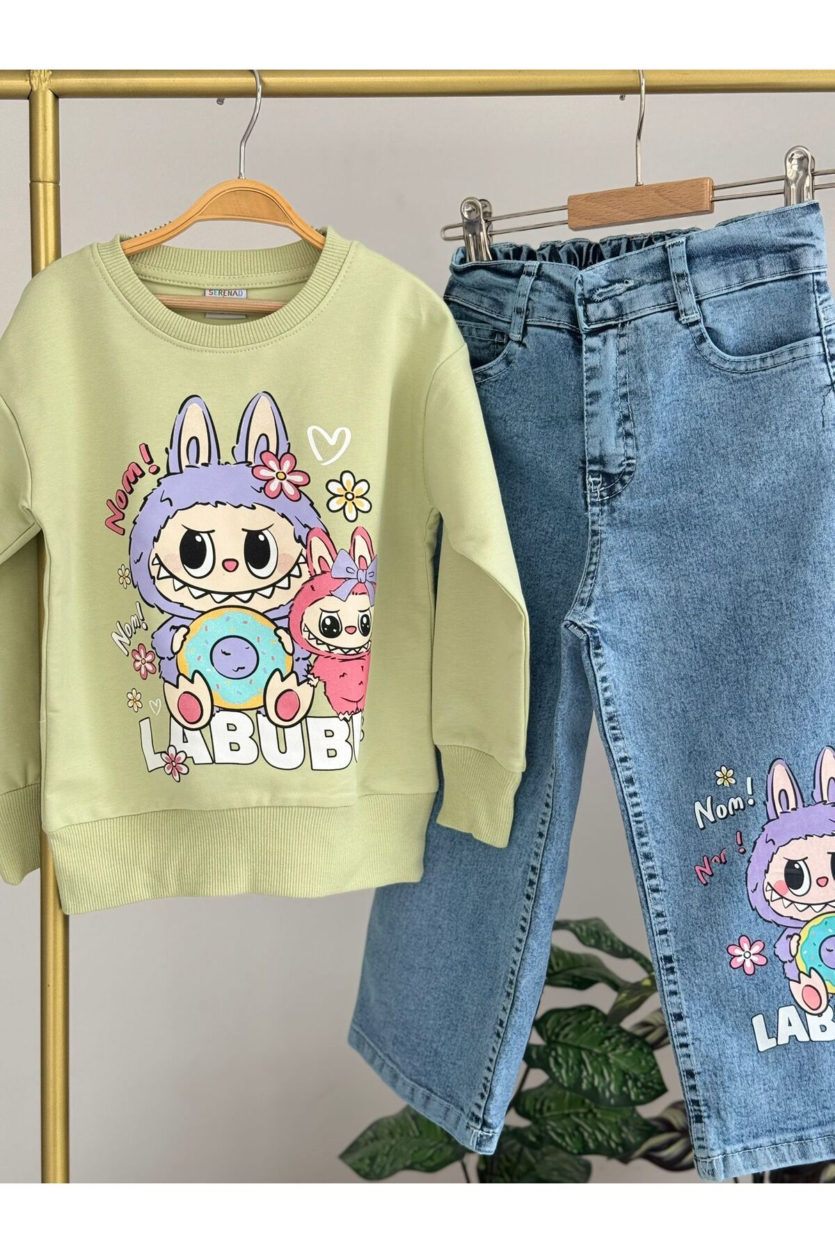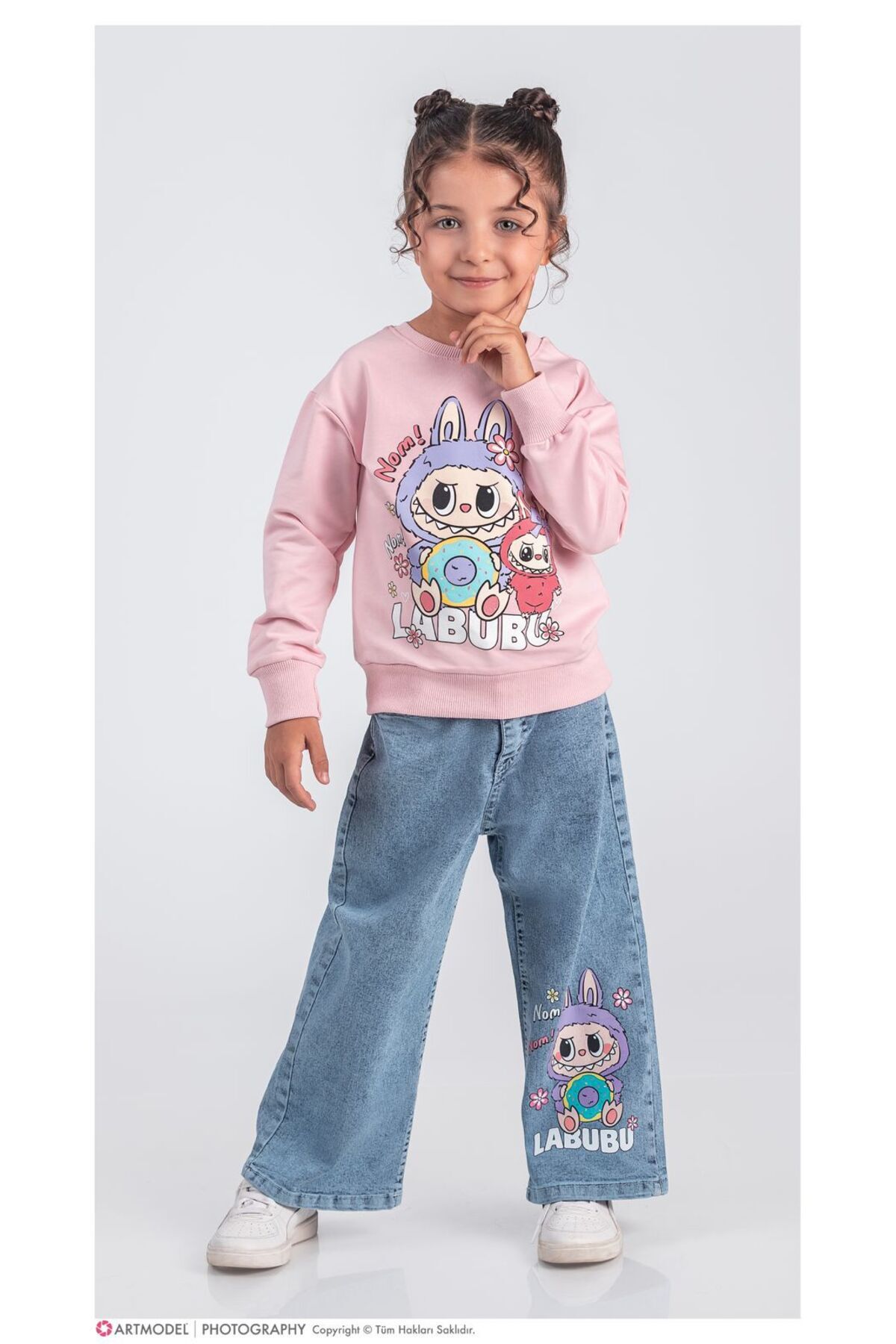 Kız Çocuk 2'li Takım Baskılı Sweatshirt Beli Lastikli Geniş Paça Jean Pantolon Kız Çocuk 2'li Takım Baskılı Sweatshirt Beli Lastikli Geniş Paça Jean Pantolon 1235887 9-10 Yaş