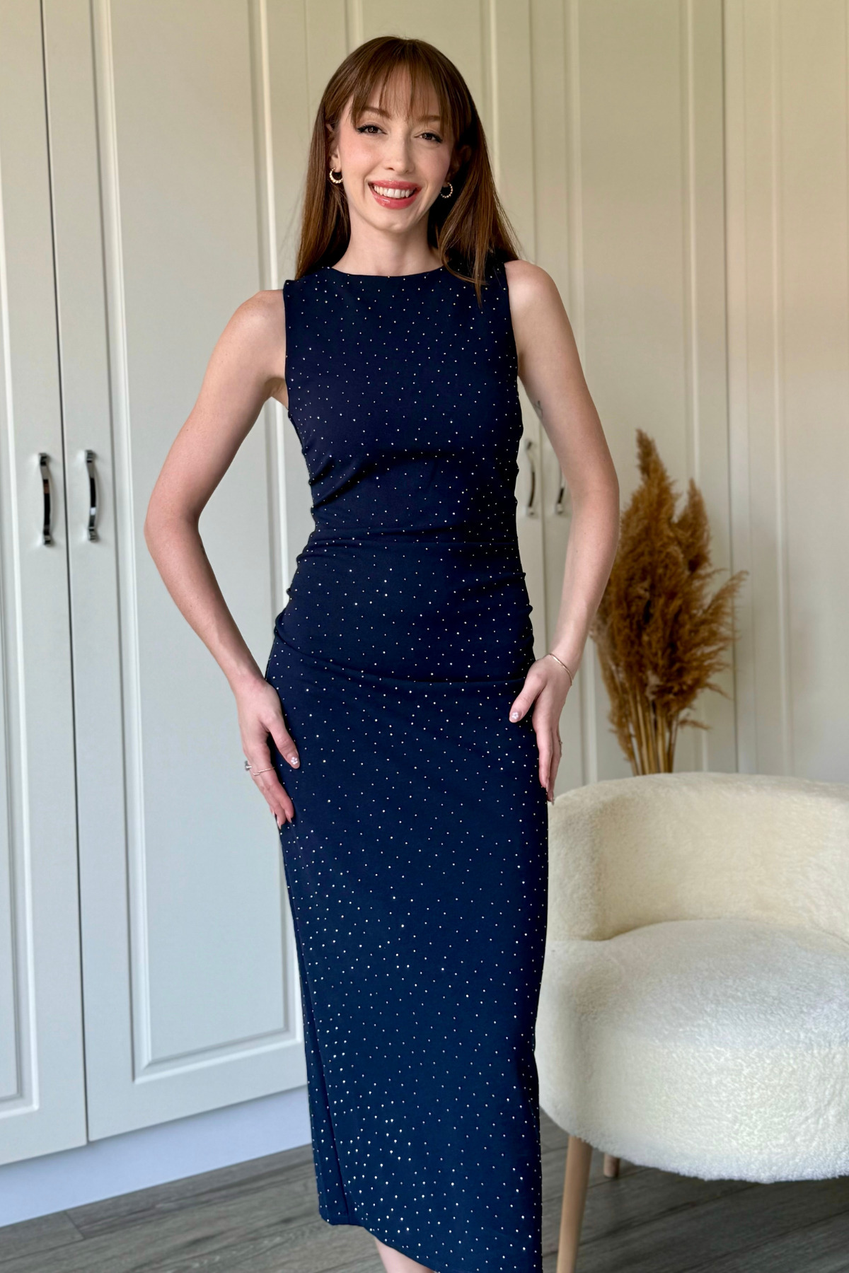 Drapeli Taşlı Midi Lacivert Elbise Drapeli Taşlı Midi Lacivert Elbise NovadiELB121523 L