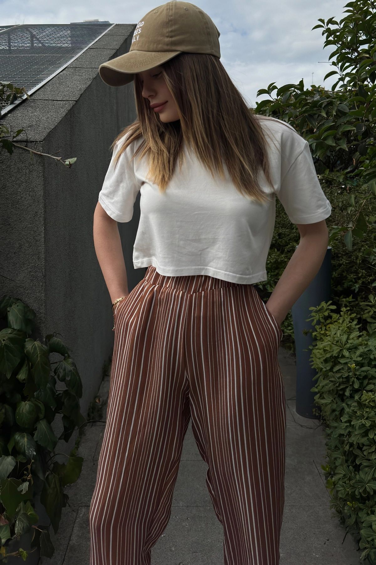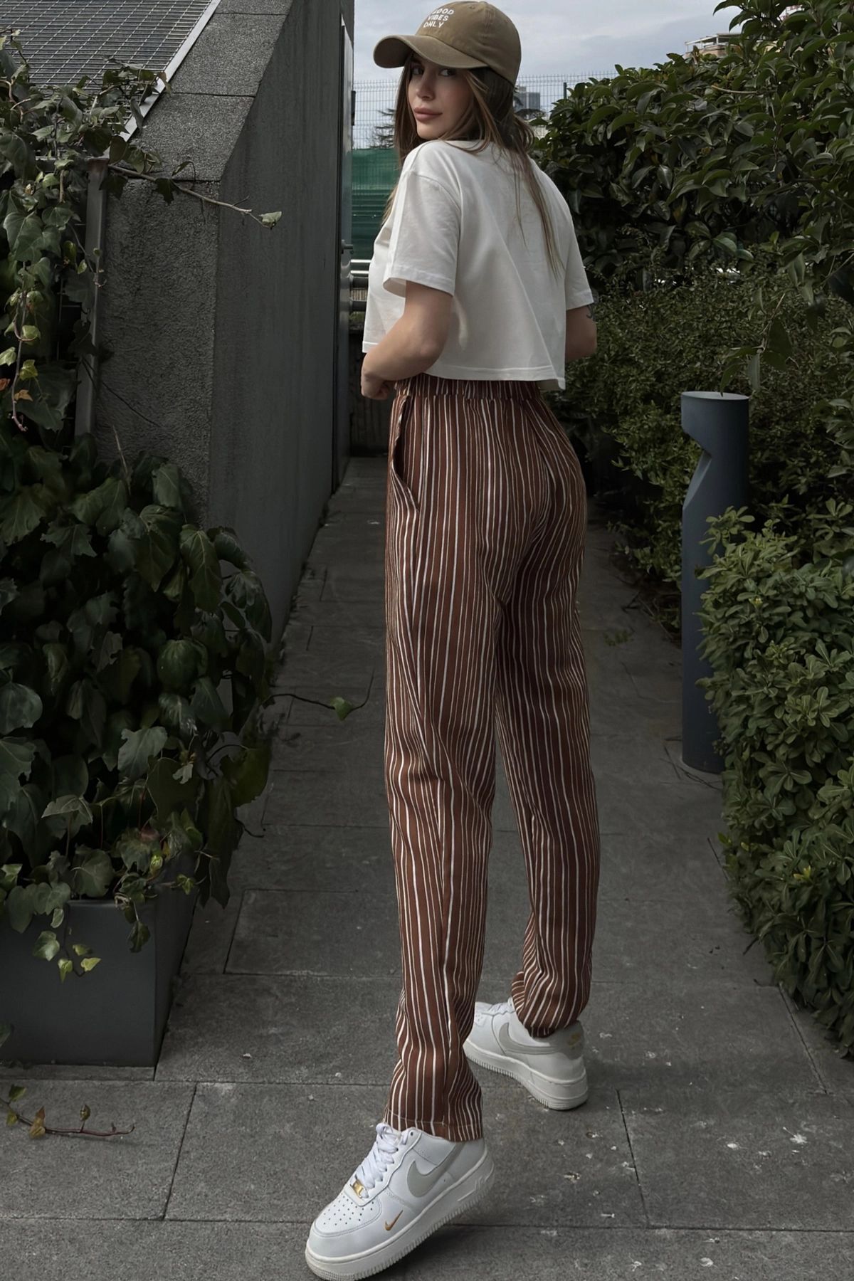 Kadın Kahve Çizgili, Beli Lastikli, Cepli, Salaş Spor Pantolon Kadın Kahve Çizgili, Beli Lastikli, Cepli, Salaş Spor Pantolon NY3277 42
