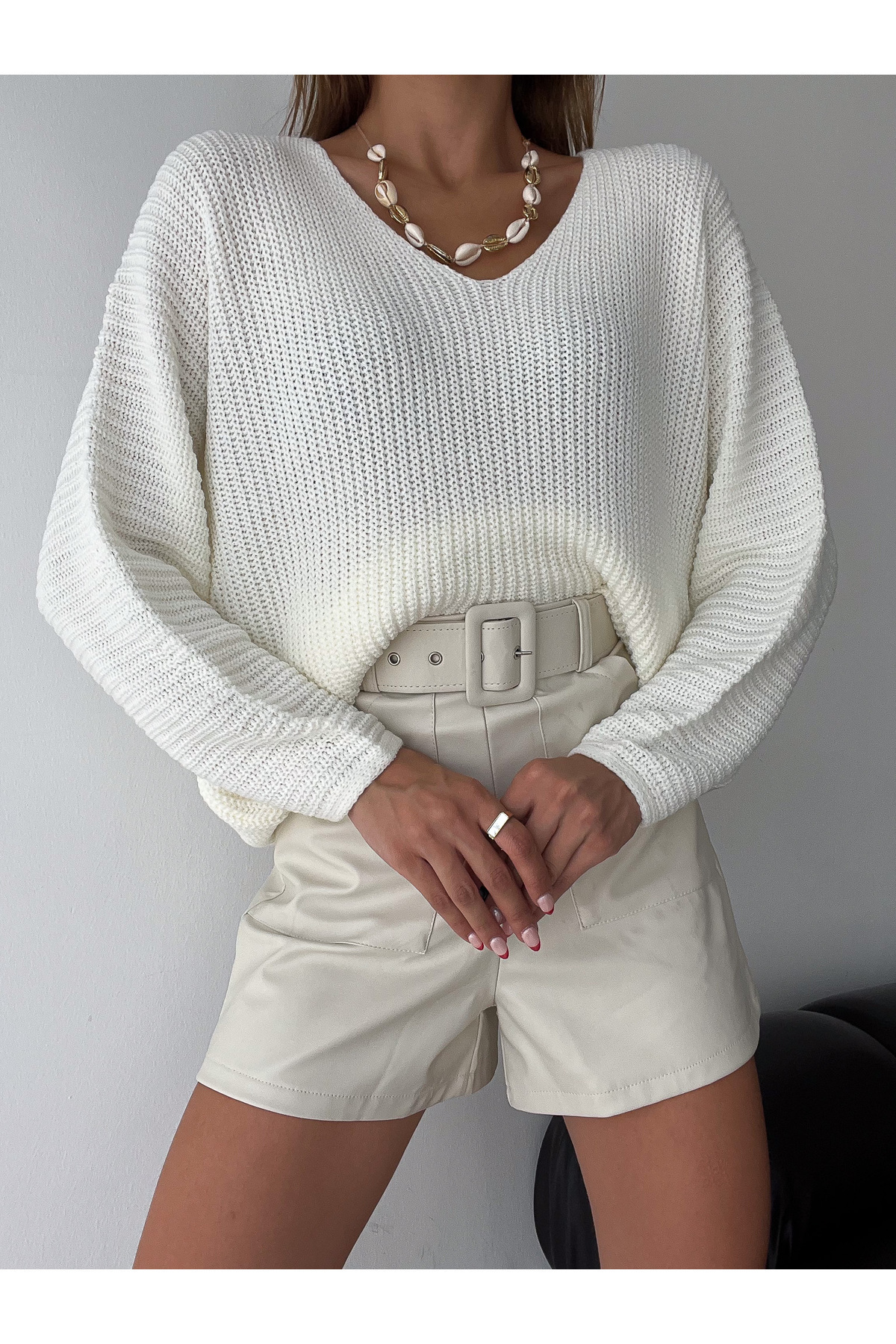 Kadın Şeritli V Yaka Örgü Desenli Triko Kazak Beyaz Kadın Şeritli V Yaka Örgü Desenli Triko Kazak Beyaz CS-22291 2XL