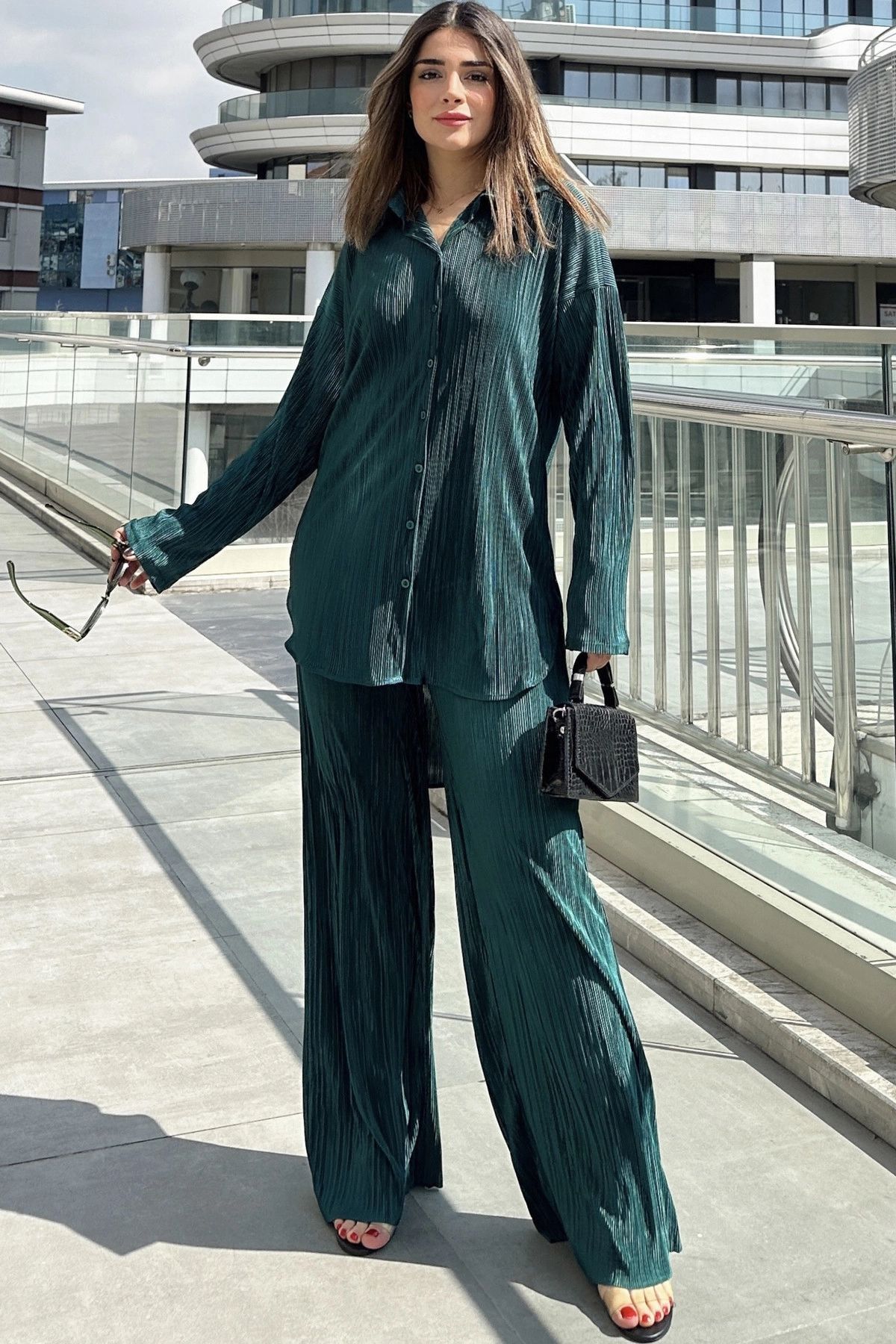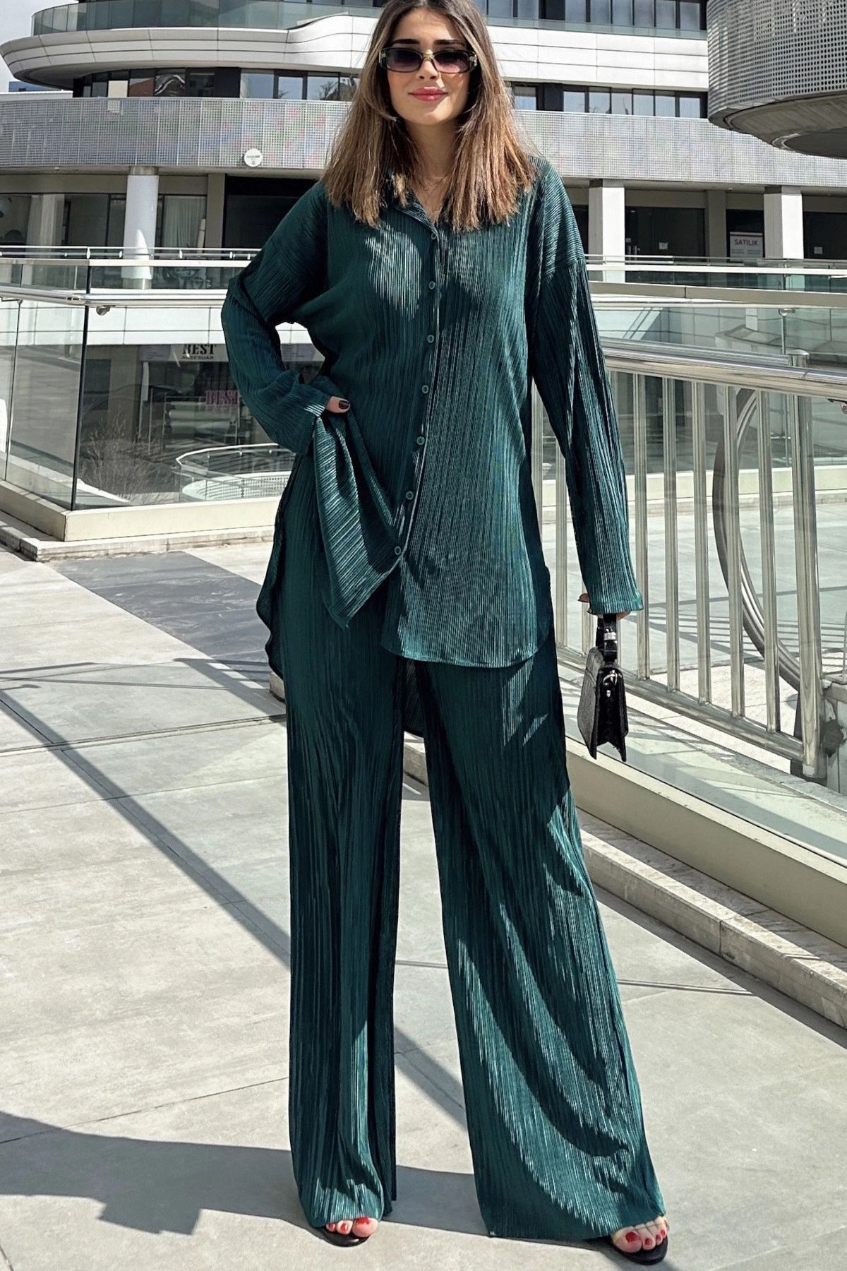 Kadın Zümrüt Yeşil Uzun Tunik Gömlek & Beli Lastikli, Bol Paça Pantolon - Salaş Bürümcük Takım Kadın Zümrüt Yeşil Uzun Tunik Gömlek & Beli Lastikli, Bol Paça Pantolon - Salaş Bürümcük Takım NY3573 42