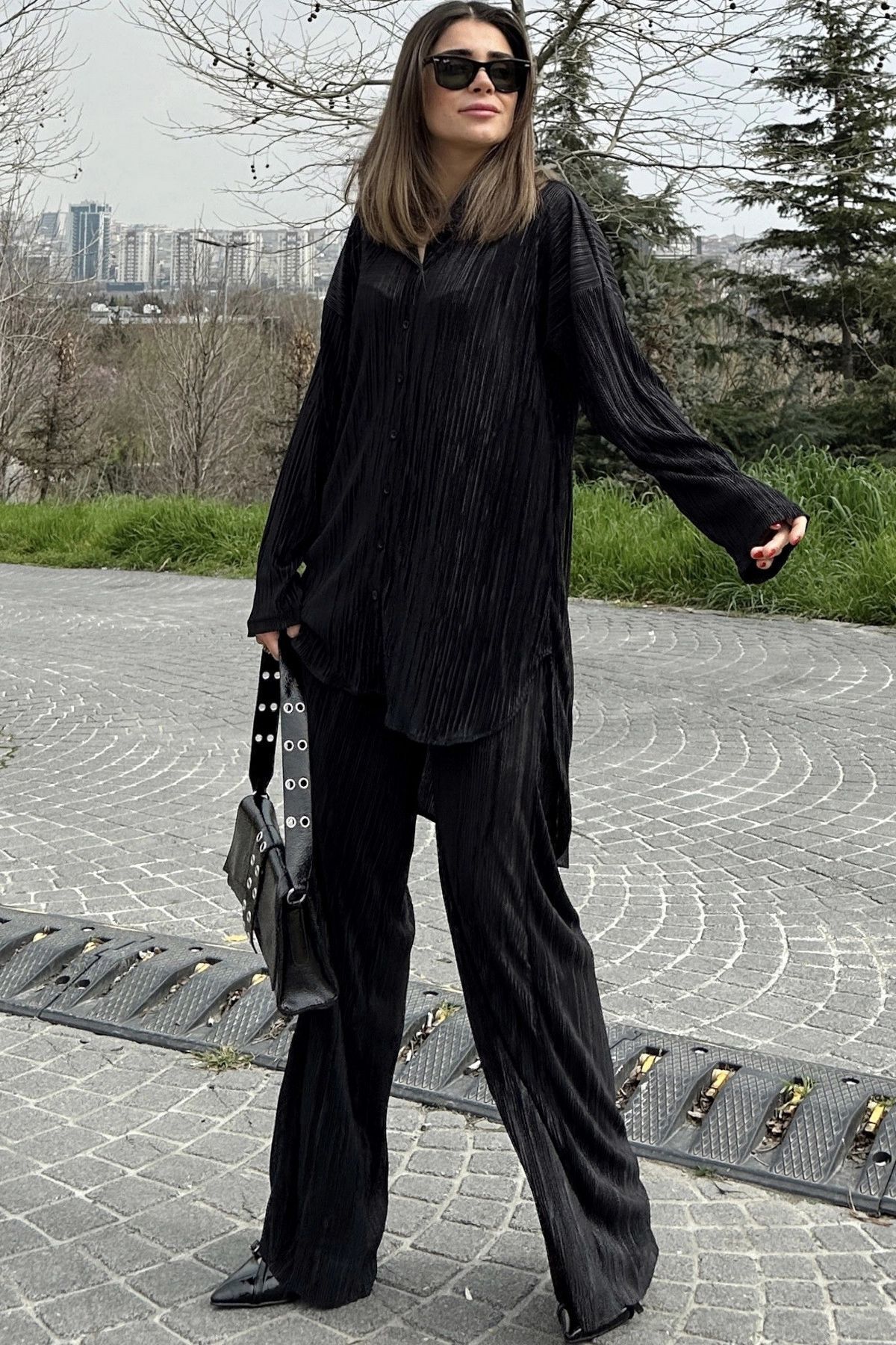 Kadın Siyah Uzun Tunik Gömlek & Beli Lastikli, Bol Paça Pantolon - Salaş Bürümcük Takım Kadın Siyah Uzun Tunik Gömlek & Beli Lastikli, Bol Paça Pantolon - Salaş Bürümcük Takım NY3573 42