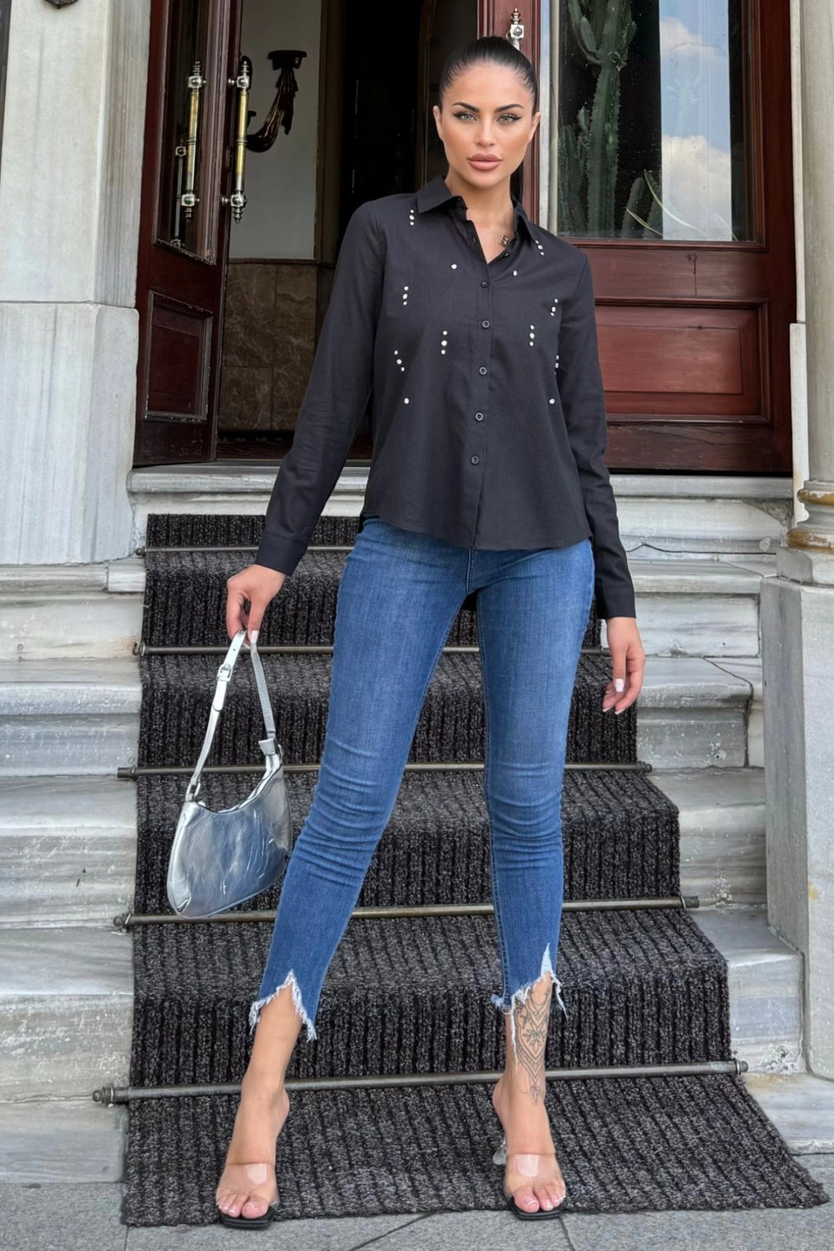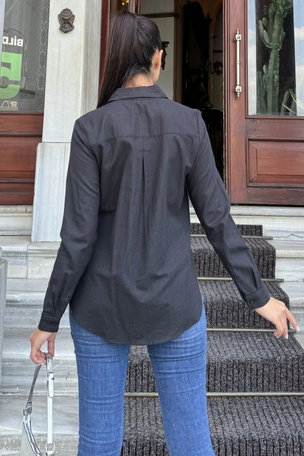 Siyah Taş Detaylı Klasik Kesim Keten Pamuklu Gömlek Siyah Taş Detaylı Klasik Kesim Keten Pamuklu Gömlek NY3536 42