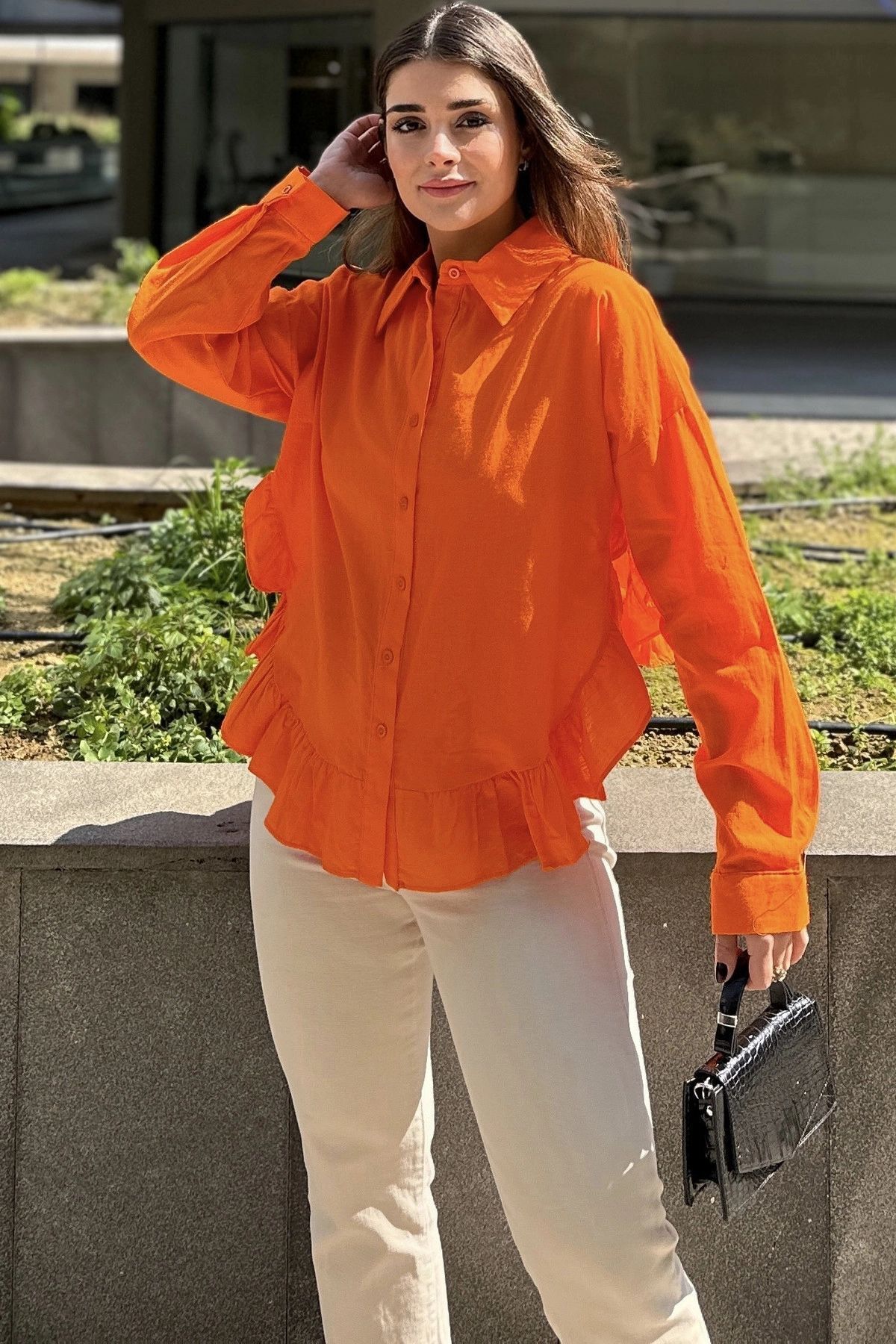 Kadın Turuncu Eteği Fırfır Ve Yırtmaç Detaylı, Terletmez Rahat Kumaş, Salaş Gömlek ( Pamuklu Keten) Kadın Turuncu Eteği Fırfır Ve Yırtmaç Detaylı, Terletmez Rahat Kumaş, Salaş Gömlek ( Pamuklu Keten) NY3570 42