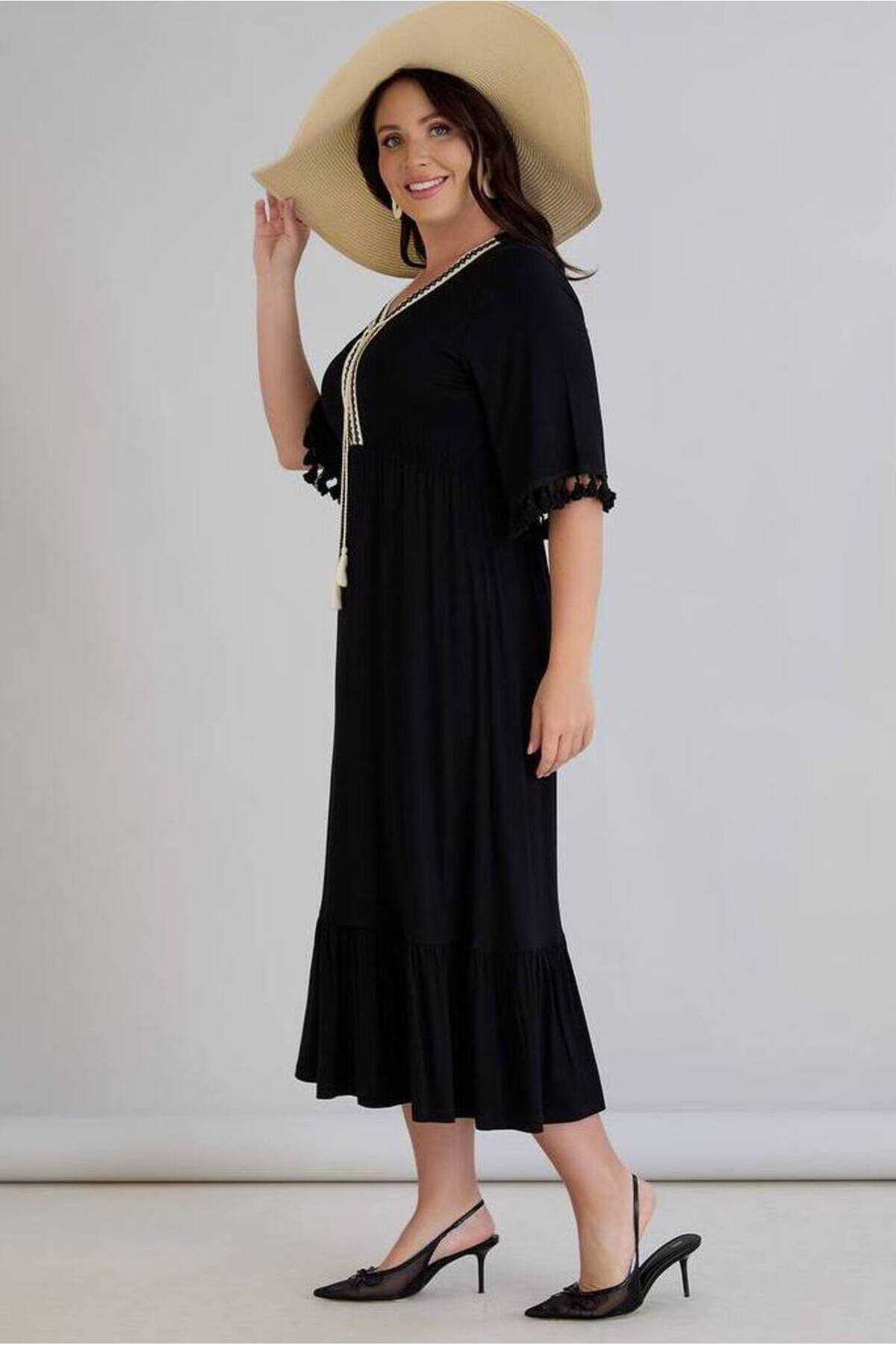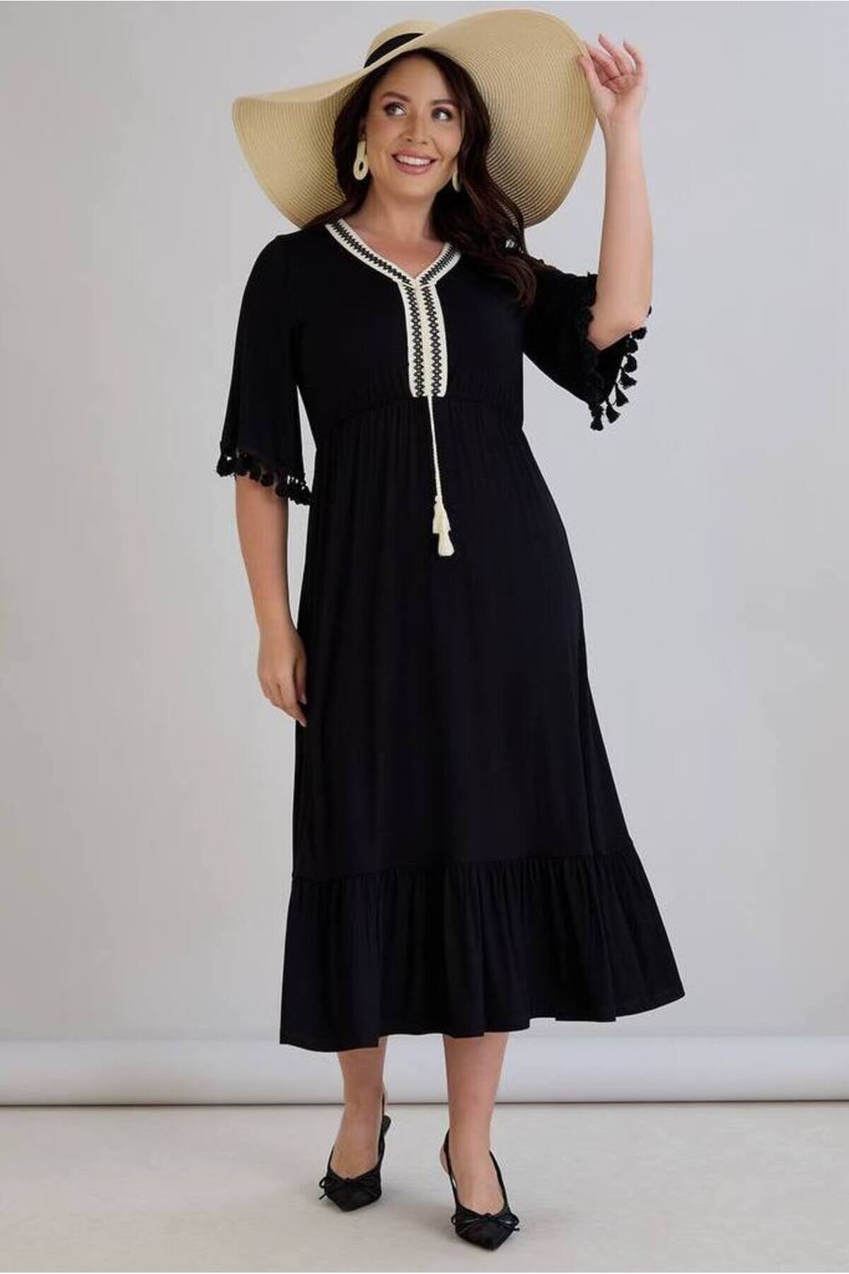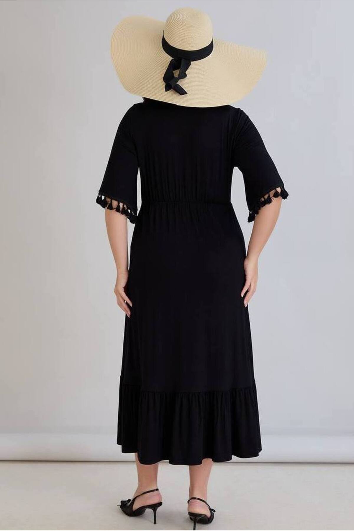 Kadın Büyük Beden V Yaka Nakış İşleme Kol Bağcık Püskül Detay Volanlı Esnek Viskon Elbise Kadın Büyük Beden V Yaka Nakış İşleme Kol Bağcık Püskül Detay Volanlı Esnek Viskon Elbise BT25YB117294 4XL