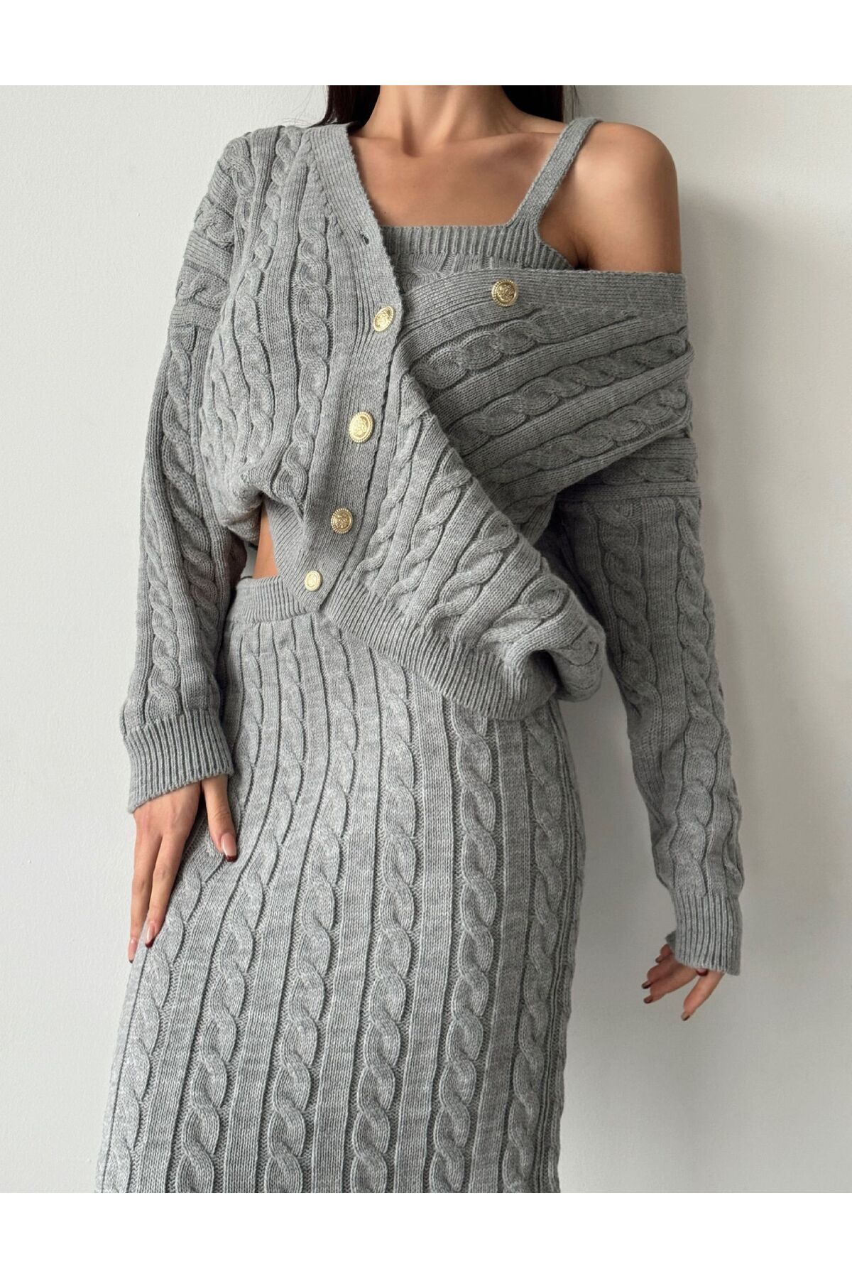 Kadın Şık Düğme detaylı Gri Yelek Etek Alt Üst İkili Triko Takım Kadın Şık Düğme detaylı Gri Yelek Etek Alt Üst İkili Triko Takım LSN088 L