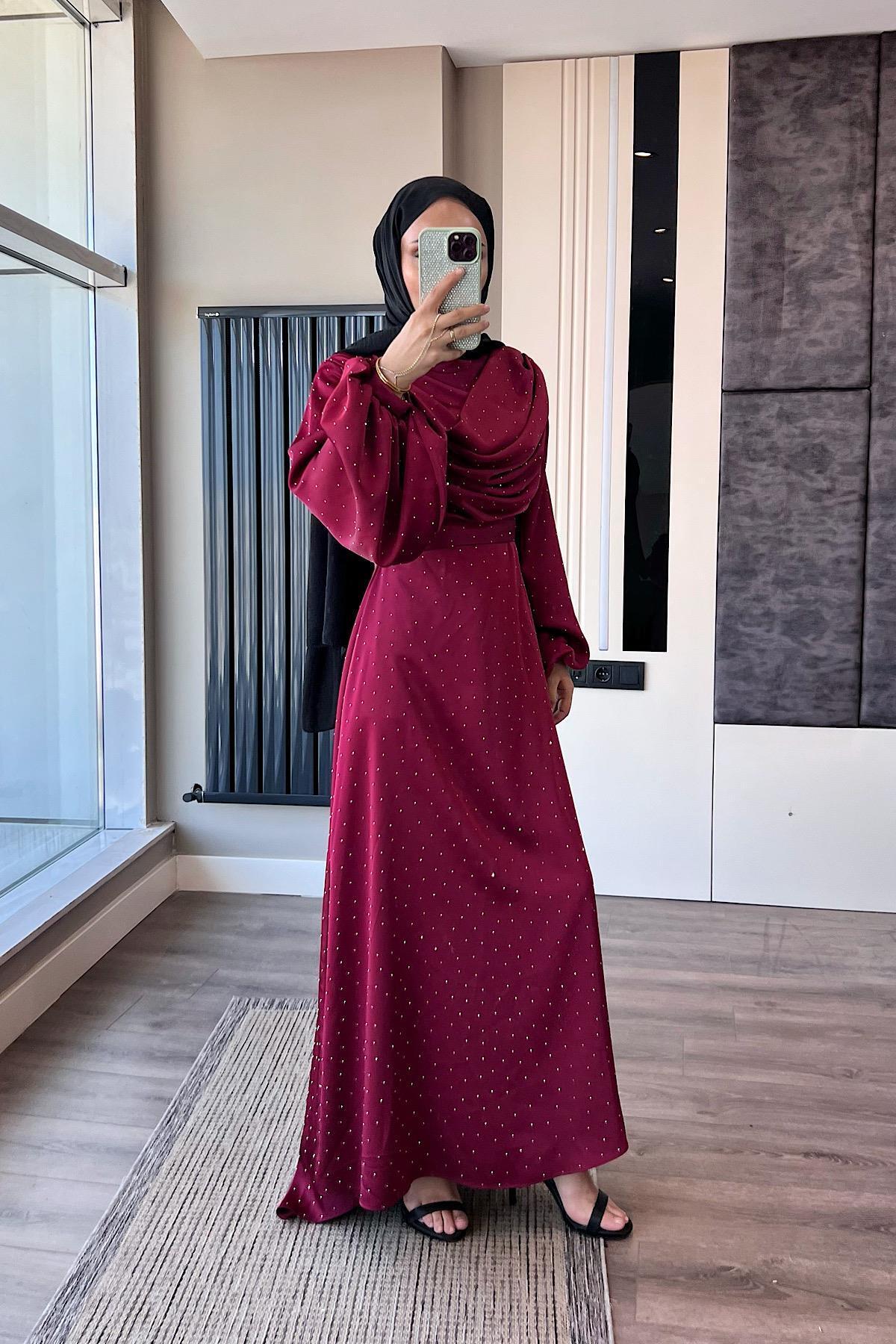 Degaje Yaka Taşlı Saten Elbise Bordo Degaje Yaka Taşlı Saten Elbise Bordo 5100-BRD 42