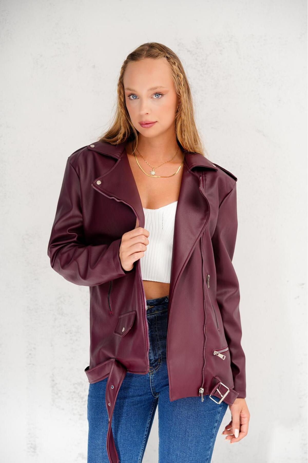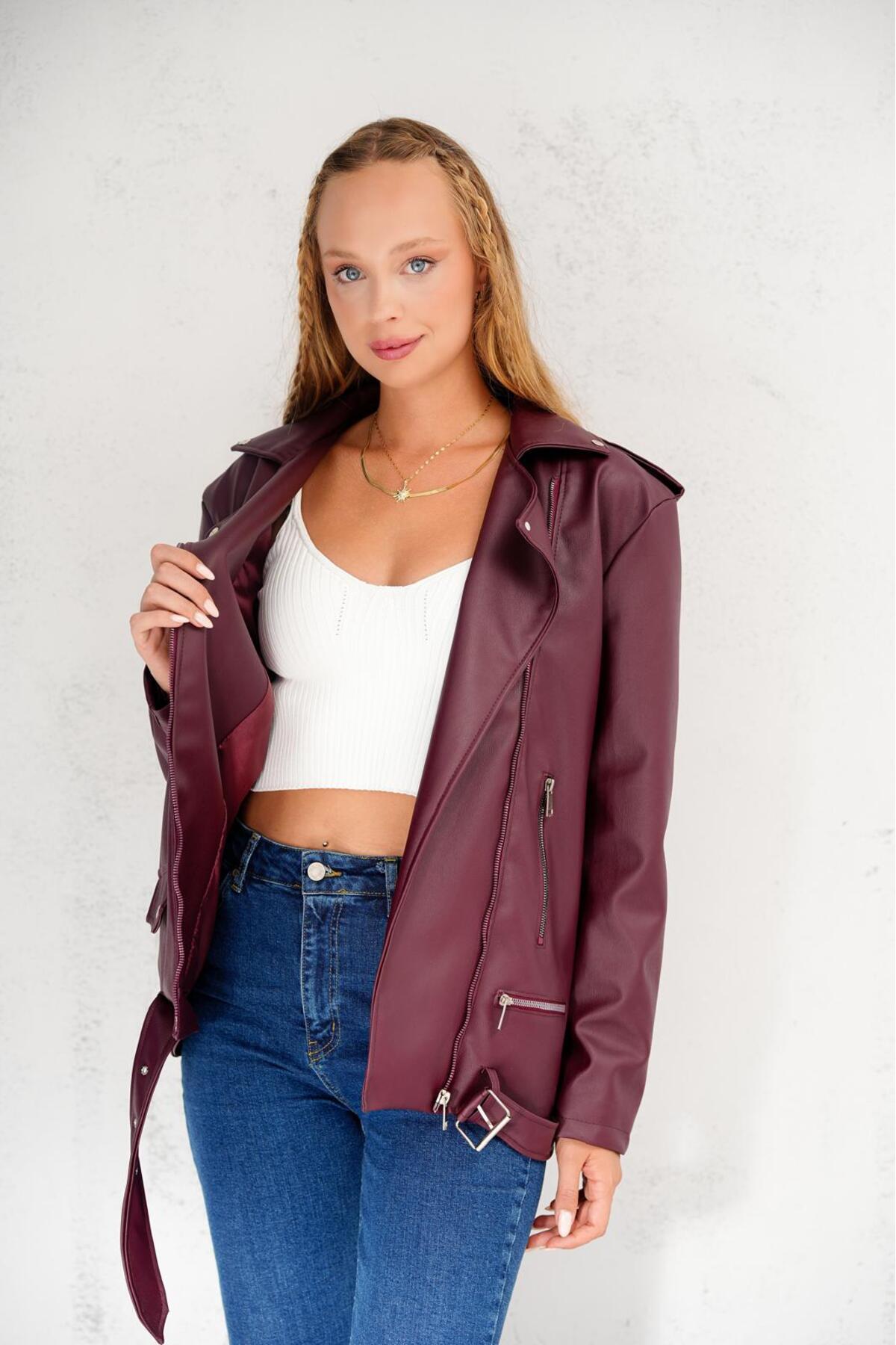 Kemer Detaylı Oversize Deri Ceket Kemer Detaylı Oversize Deri Ceket 7548952145YERTEKS L