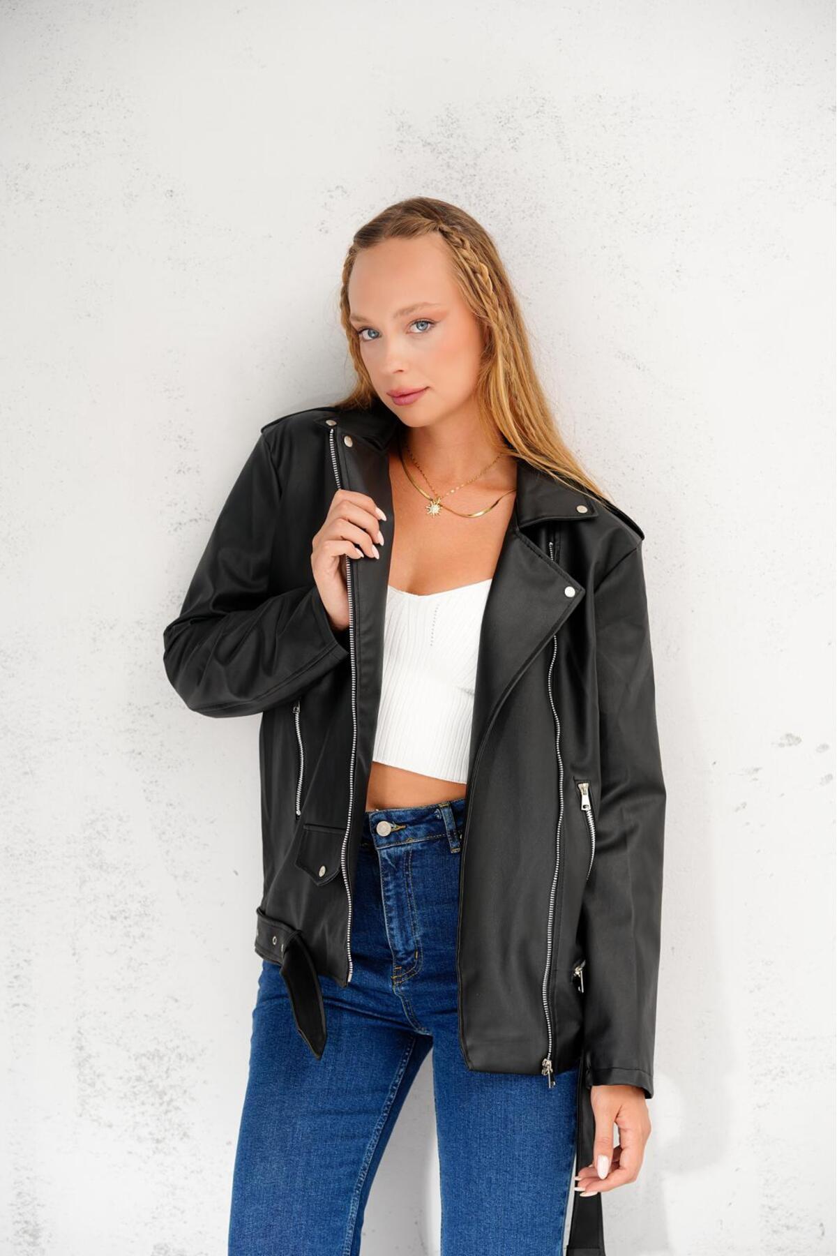 Kemer Detaylı Oversize Deri Ceket Kemer Detaylı Oversize Deri Ceket 7548952145YERTEKS L